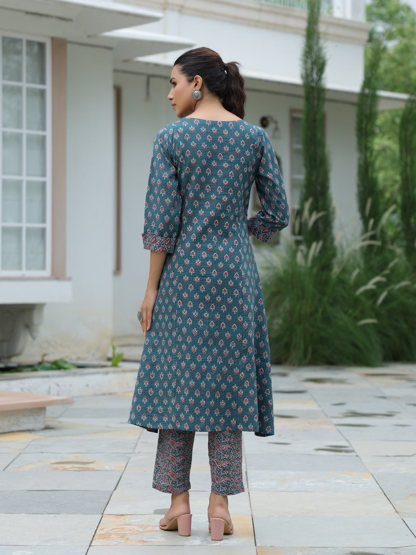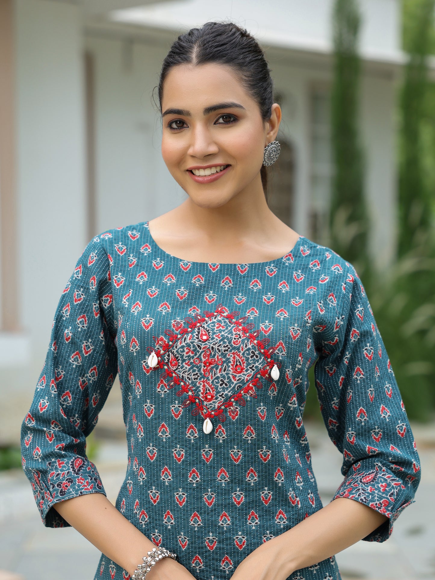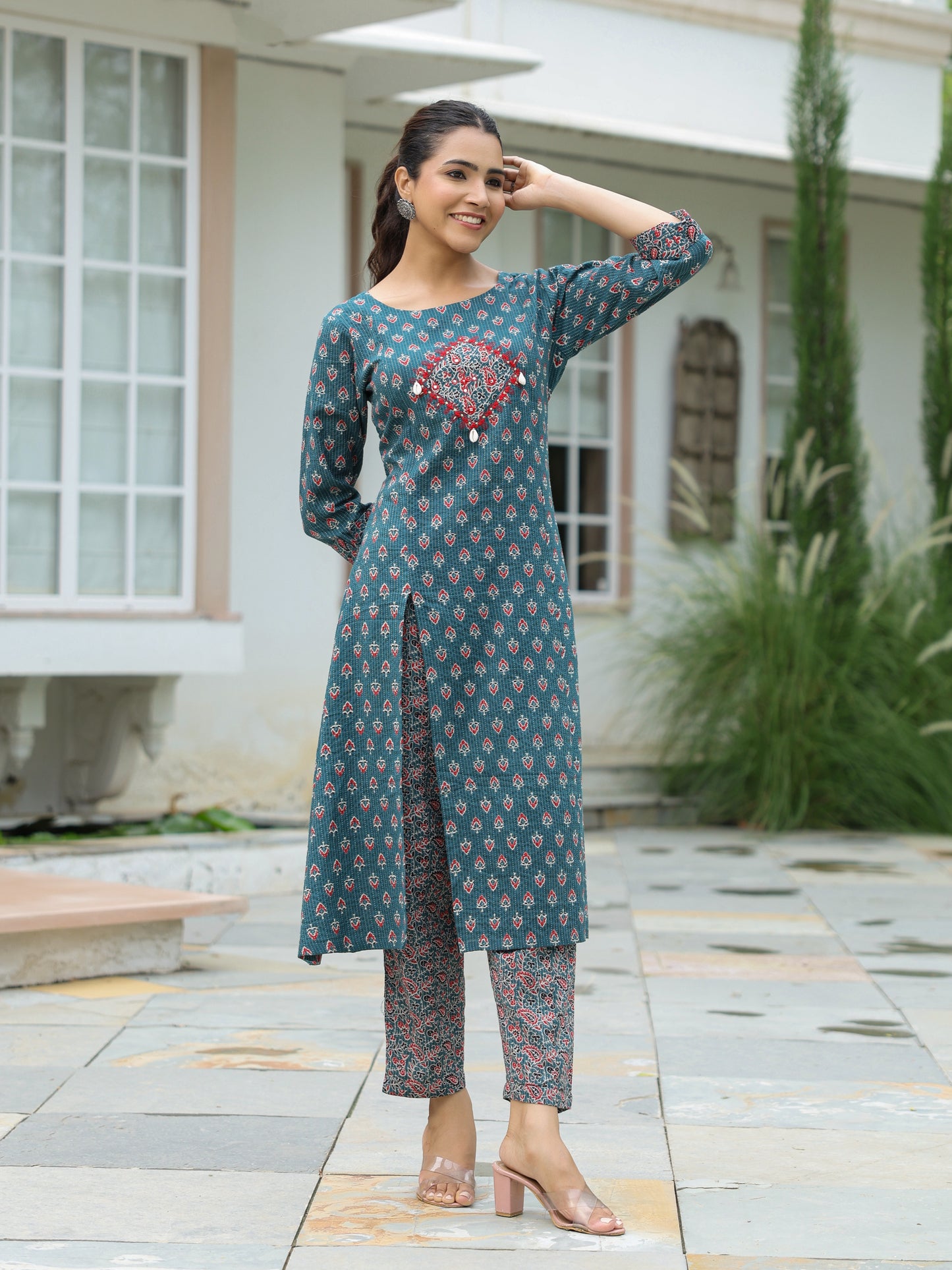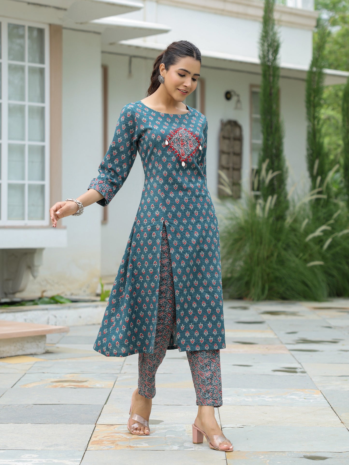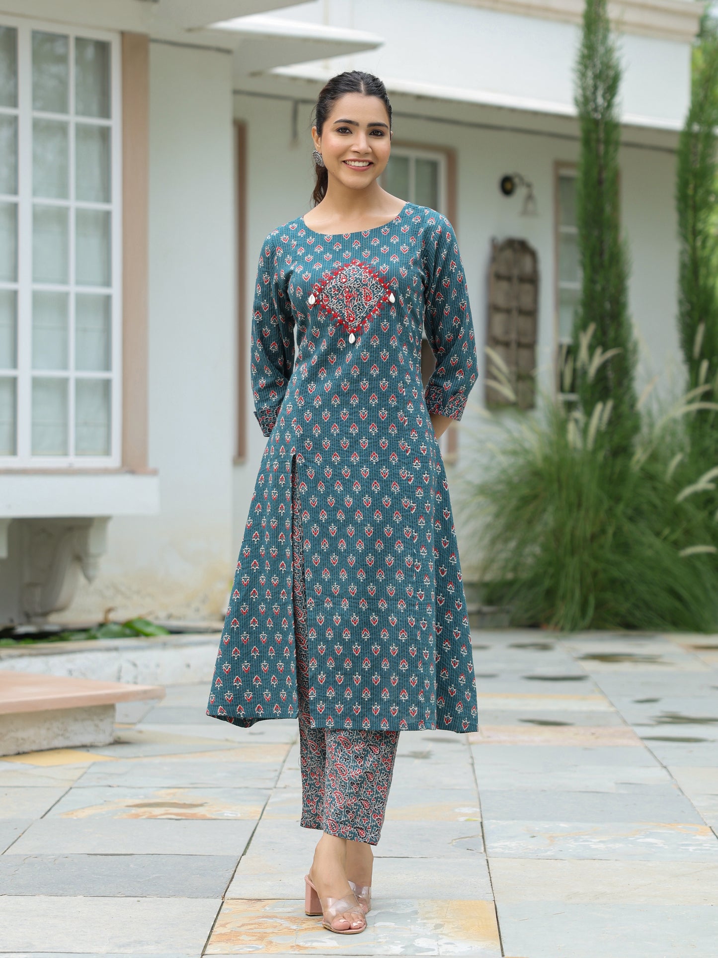 Ethnic & Kantha Printed & Mirror Embroidered A-Line Kurta with Pant - Green