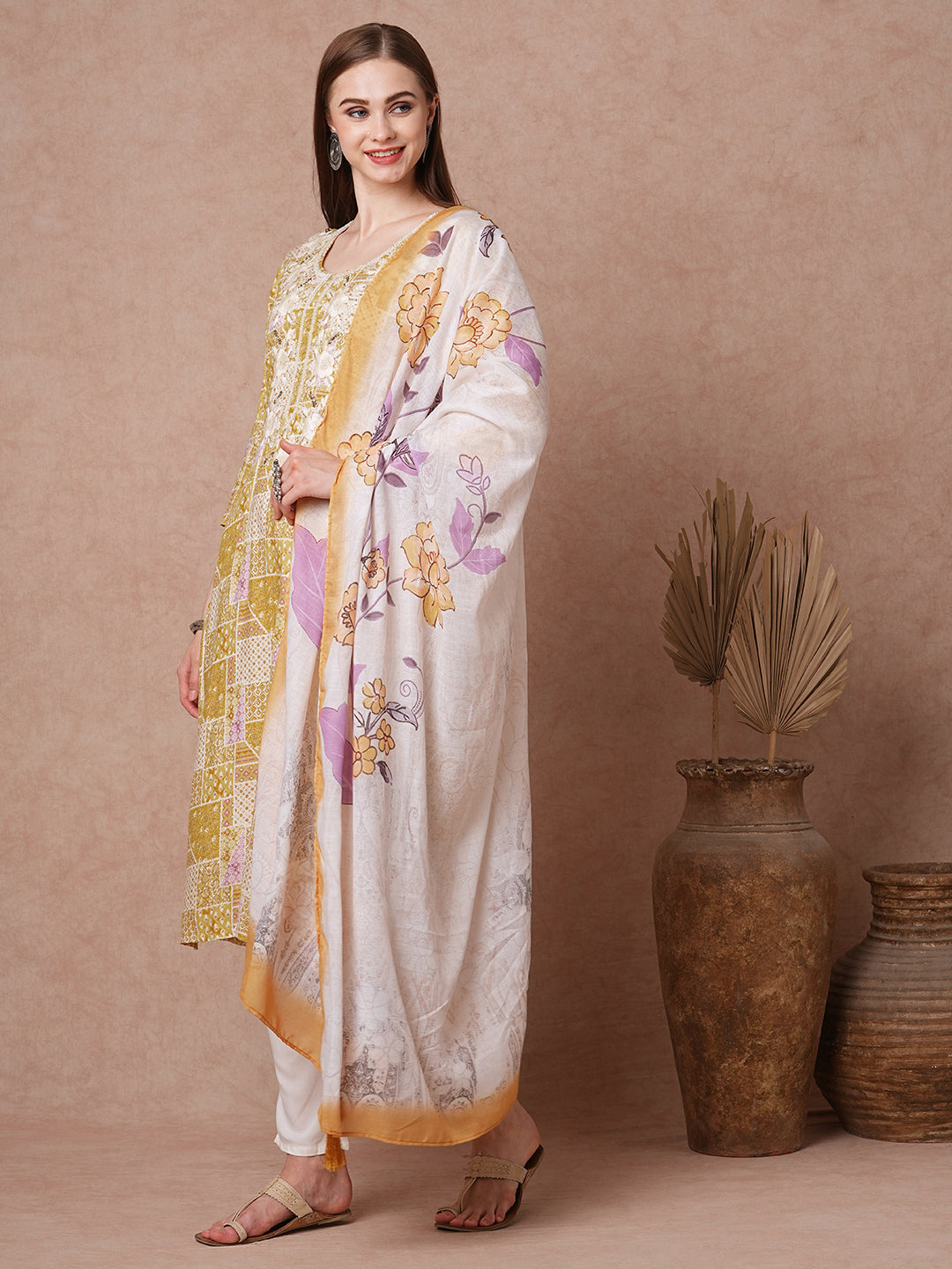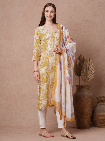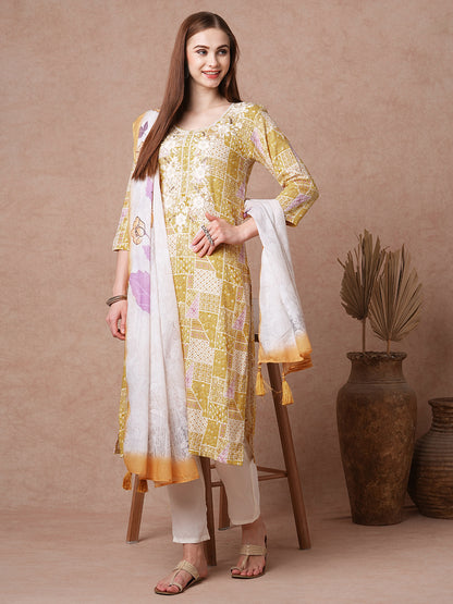 Ethnic Patch Printed & Embroidered Straight Fit Kurta with Pant and Dupatta - Mustard