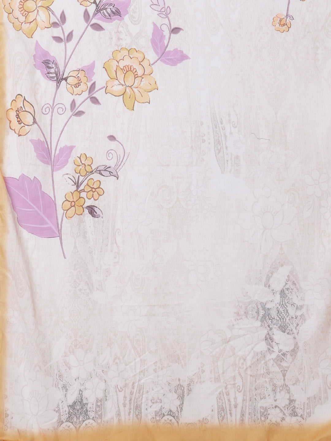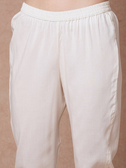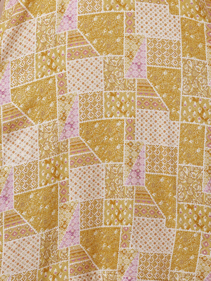 Make a statement in this mustard three-piece set featuring a straight-fit viscose rayon kurta adorned with geometric ethnic prints and intricate resham, sequin, and bead embroidery on the yoke. Styled with a round neckline, it comes with a printed dupatta enhanced with tassels and a pair of solid matching pants. Perfect for festive gatherings and elegant daywear.