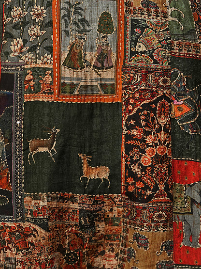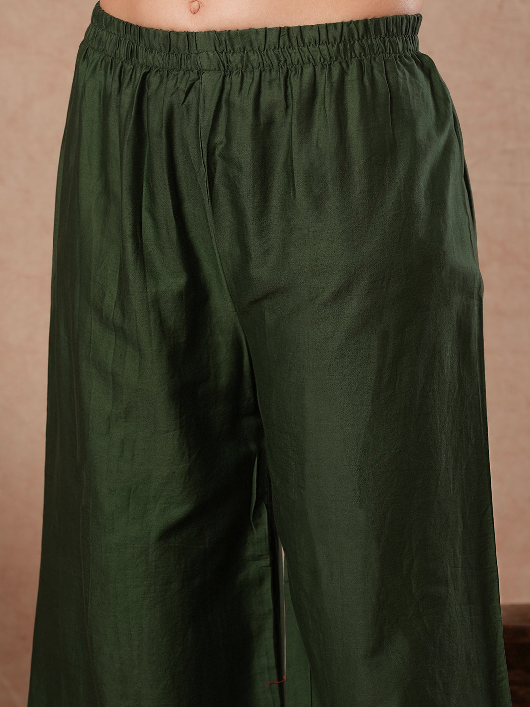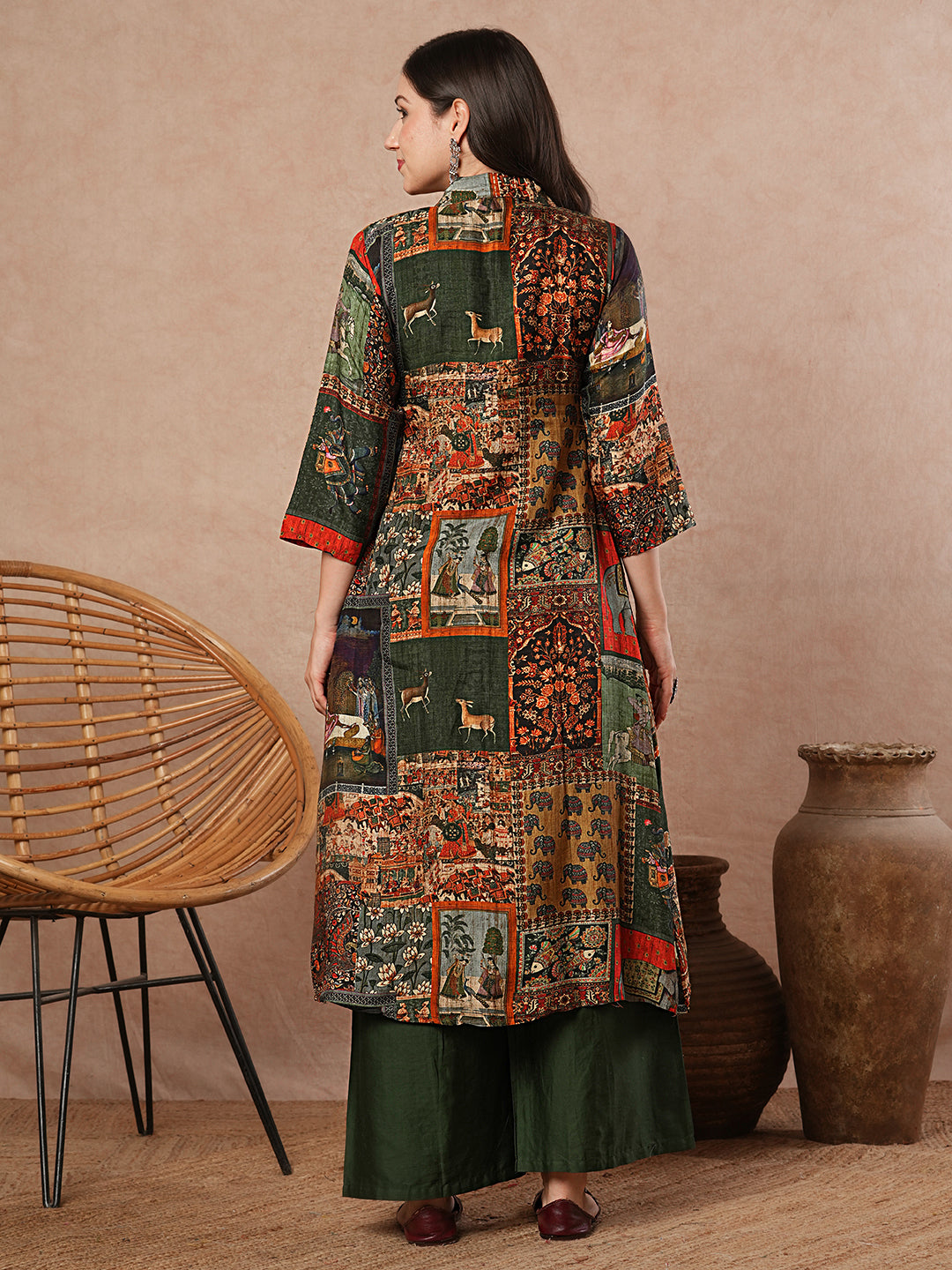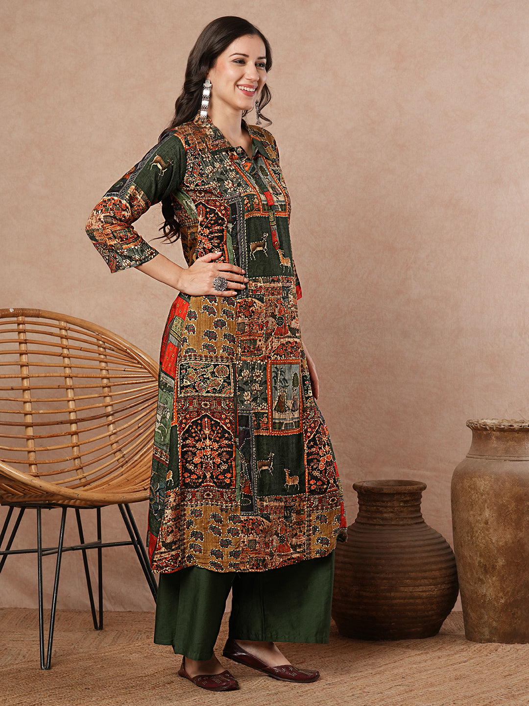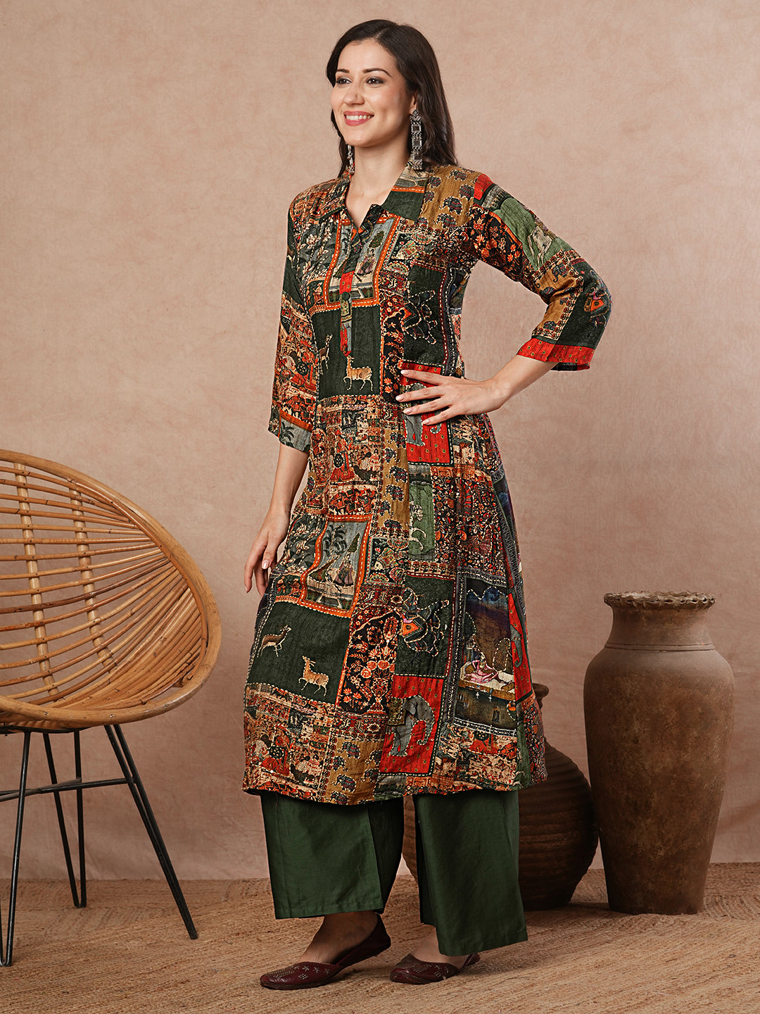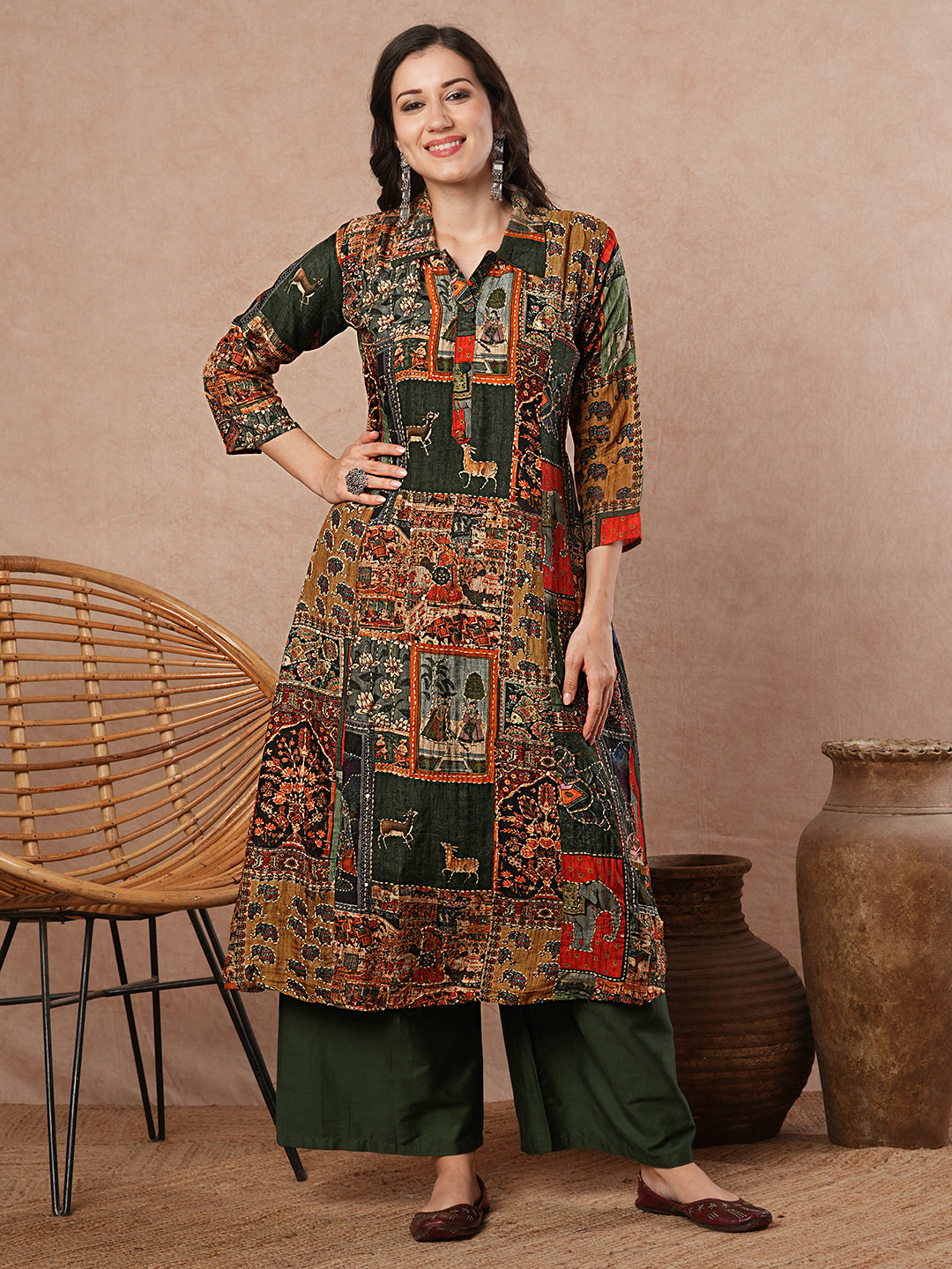 Ethnic Pichwai Printed & Kantha Embroidered Kurta with Palazzo - Green