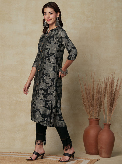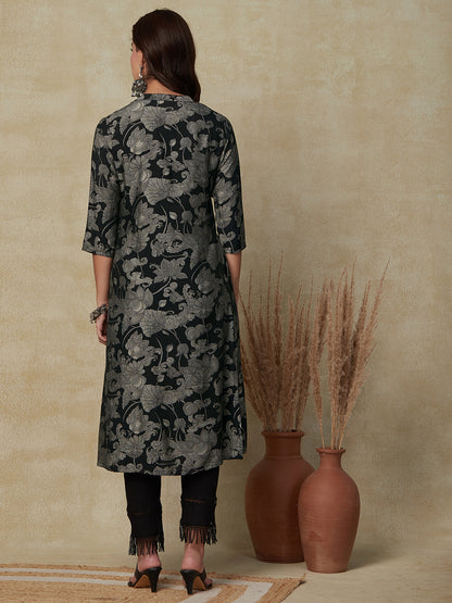 Floral Printed Embroidered Straight Fit Kurta -...