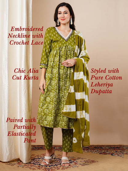 Ethnic Printed & Embroidered A-Line Pleated Kurta with Pant & Dupatta - Green