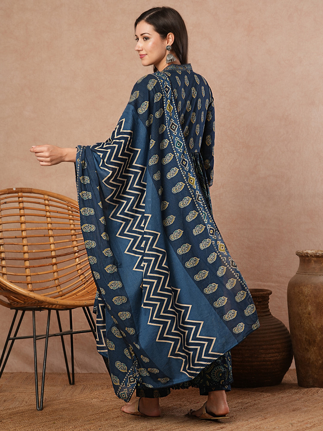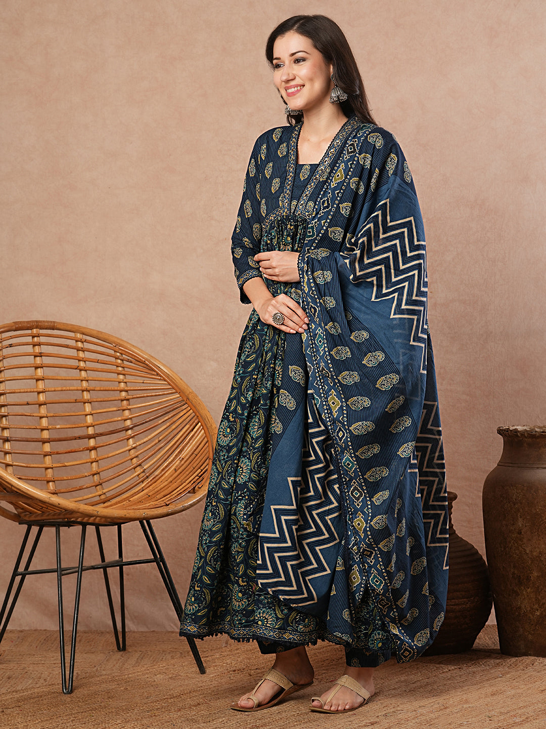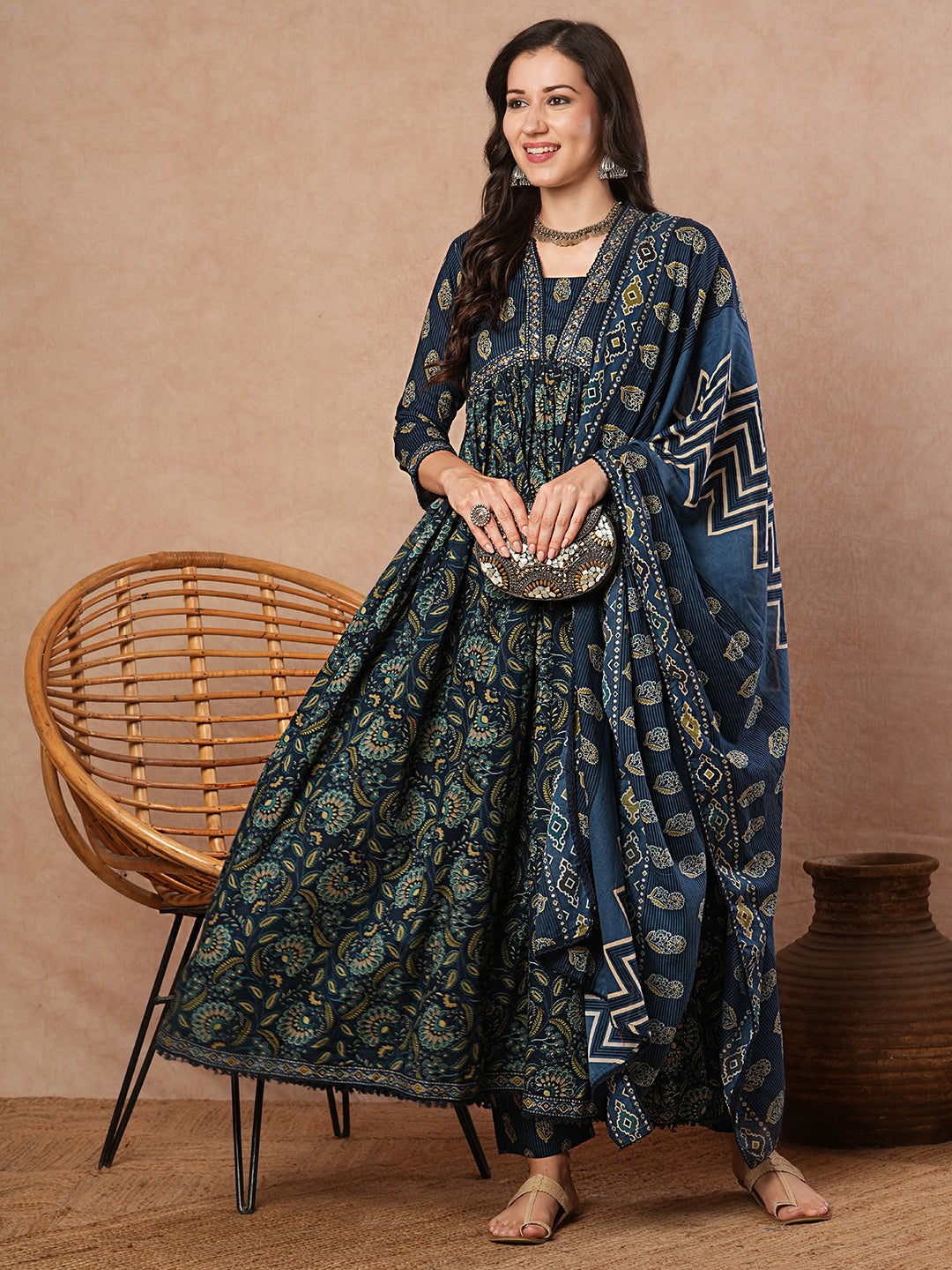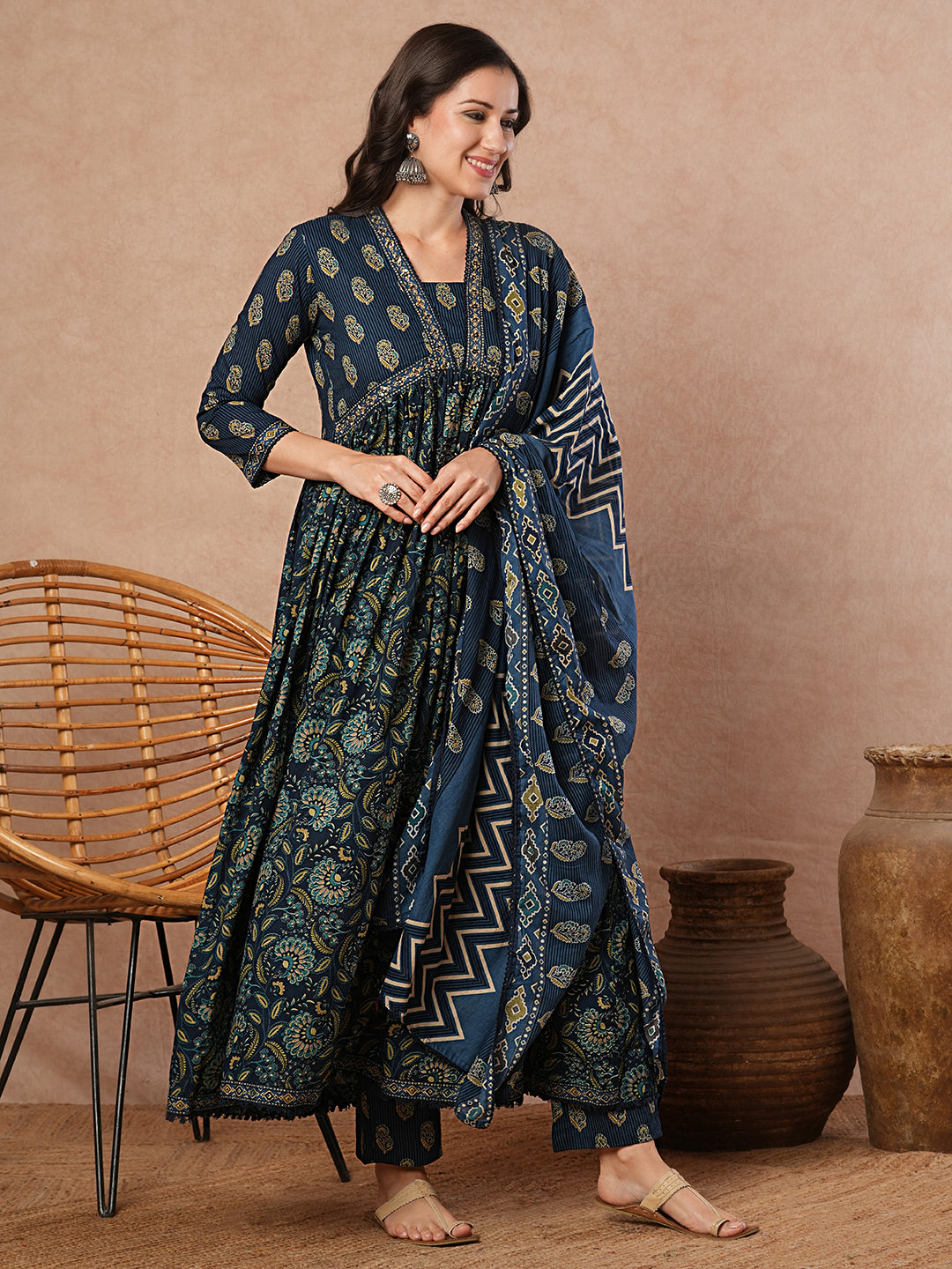 Ethnic Printed & Embroidered Anarkali Flared Kurta with Pant & Dupatta - Blue