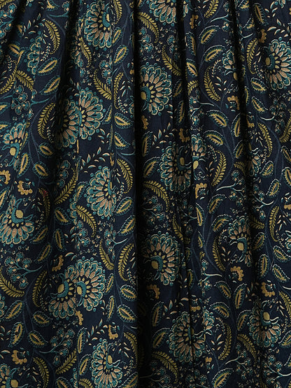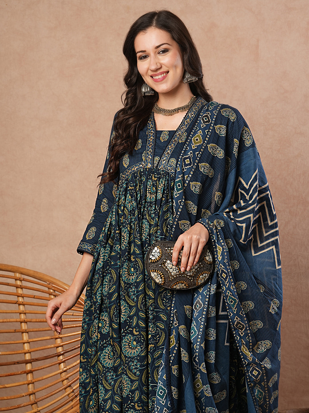 Step into timeless charm with this Ethnic Floral Printed Anarkali Kurta set in soothing blue. Crafted from breathable cotton, the flared silhouette is elevated with delicate crochet lace detailing and a flattering V-neckline. Paired with matching pants and a pure cotton printed dupatta, this set brings effortless elegance to festive and everyday wear.