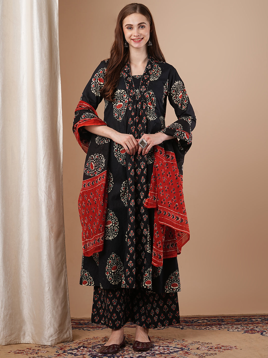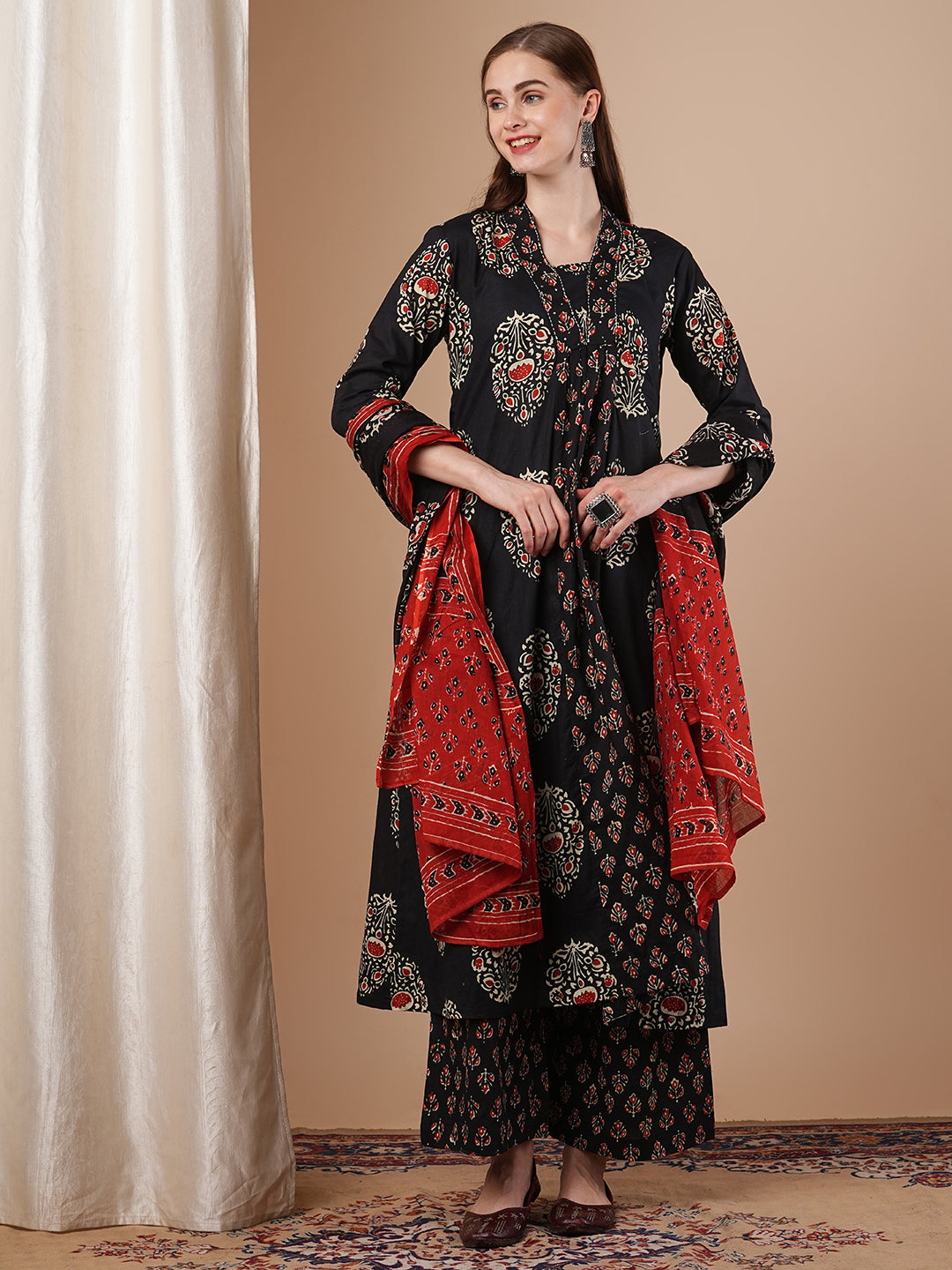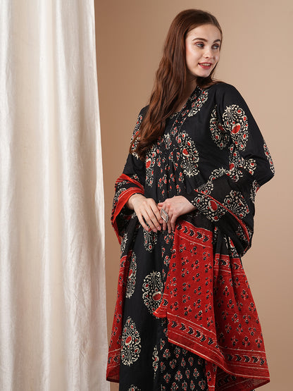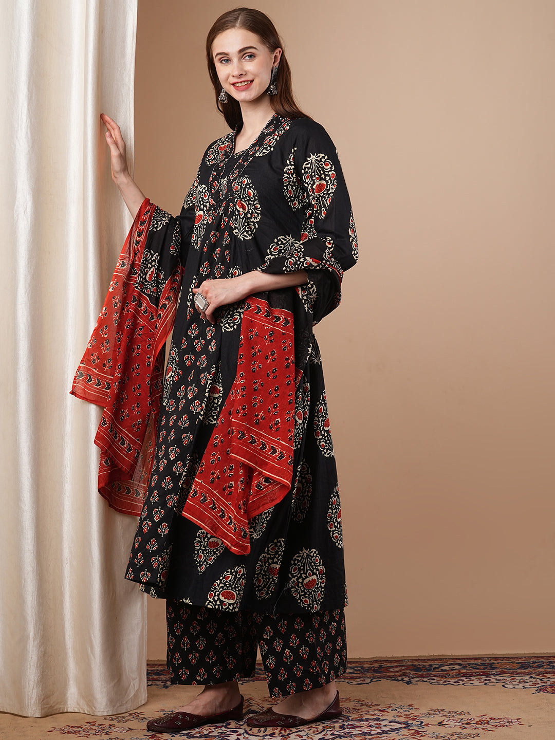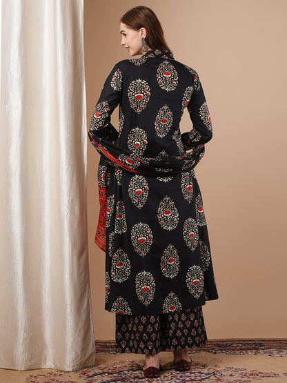 Ethnic Printed & Embroidered Anarkali Kurta with Palazzo & Pure Cotton Dupatta - Black