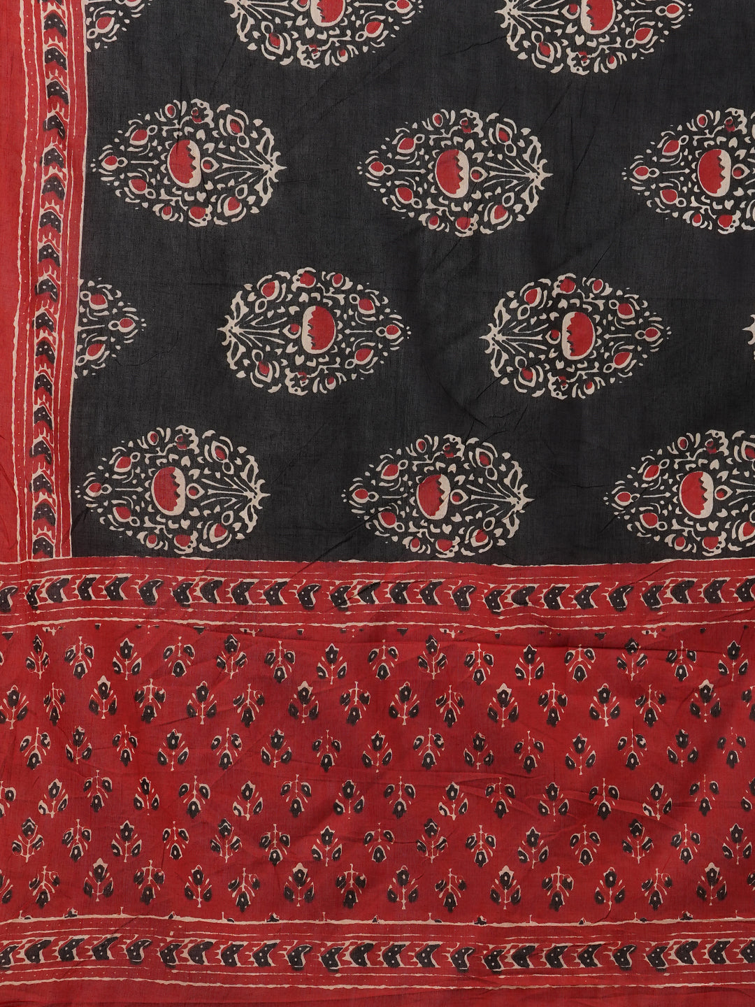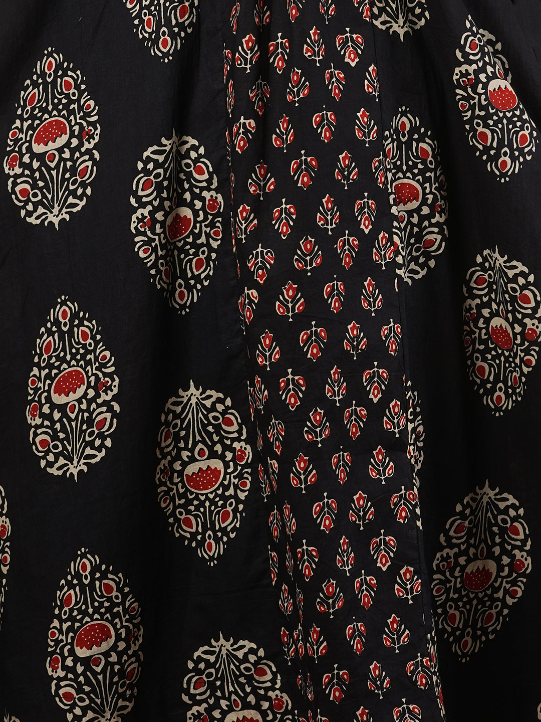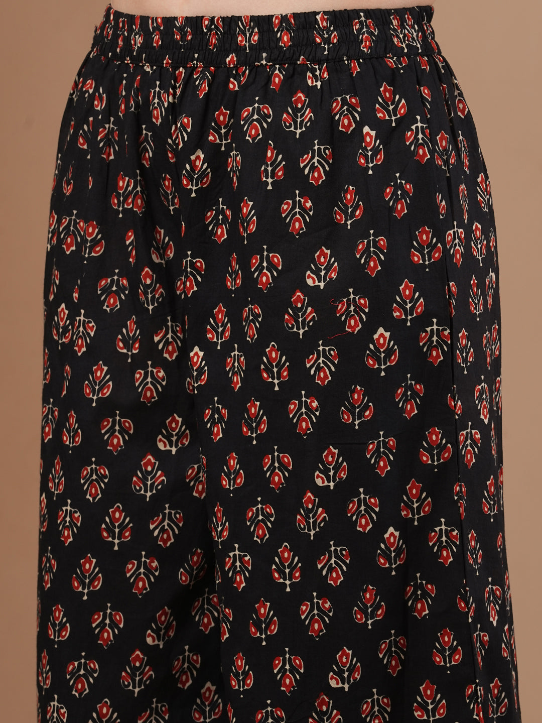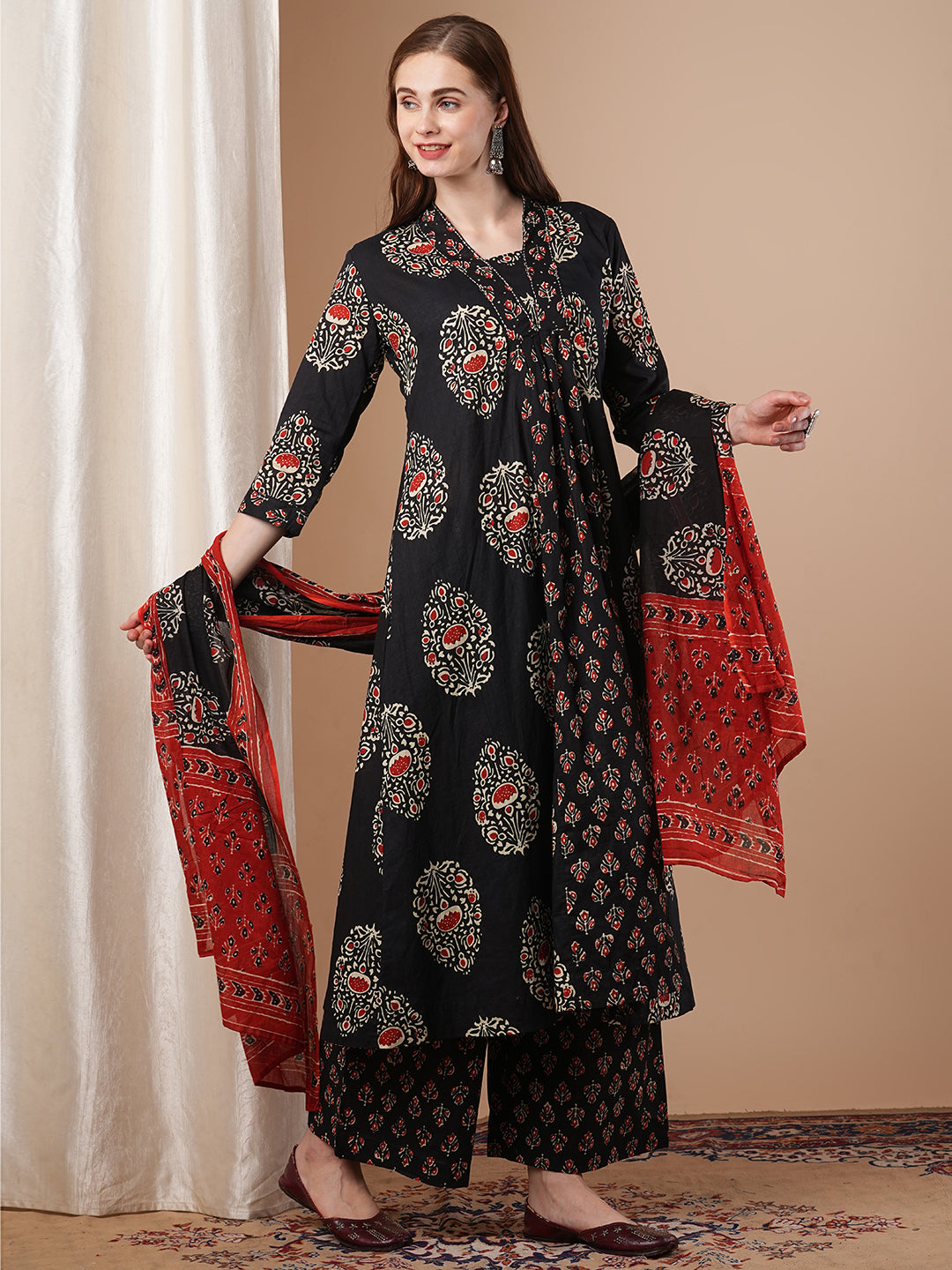 Ethnic Printed & Embroidered Anarkali Kurta with Palazzo & Pure Cotton Dupatta - Black