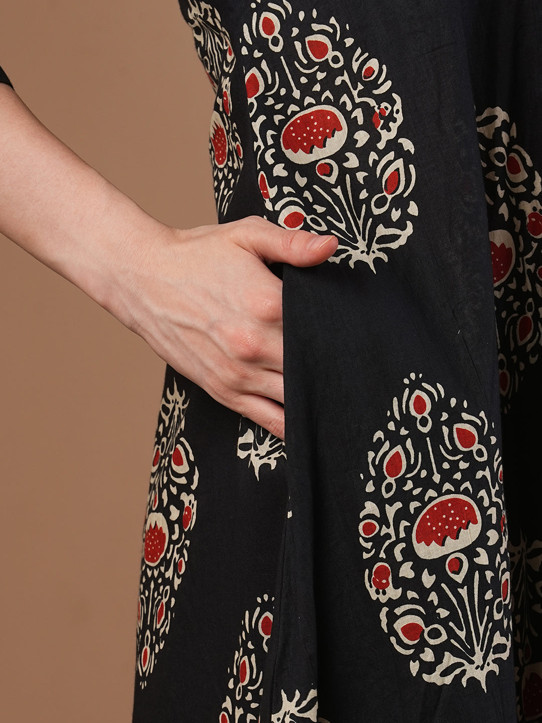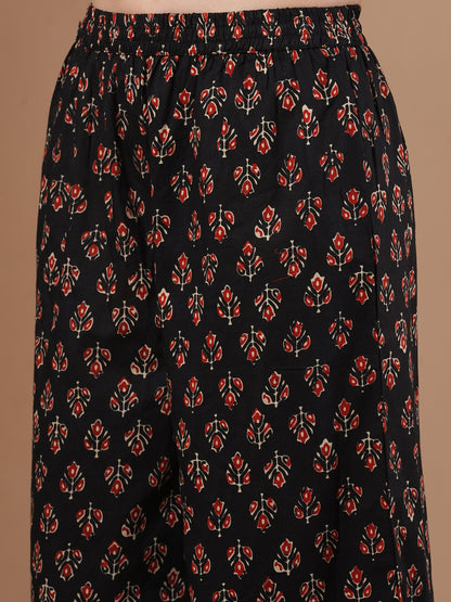 Enhance your ethnic wardrobe with this Black Anarkali Kurta Set, crafted from soft, breathable cotton for ultimate comfort. The kurta showcases an elegant V-neckline with delicate resham embroidery, adding a subtle yet sophisticated touch. It’s paired with a printed palazzo and a pure cotton dupatta, making this ensemble the perfect blend of effortless style and everyday ease. Ideal for both casual wear and festive occasions, this set offers grace, comfort, and a timeless appeal.