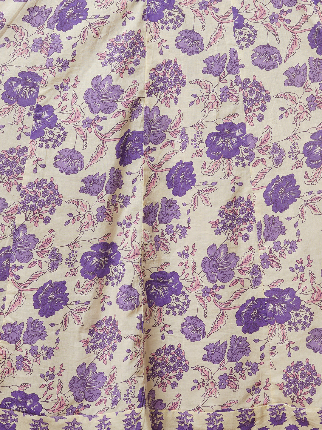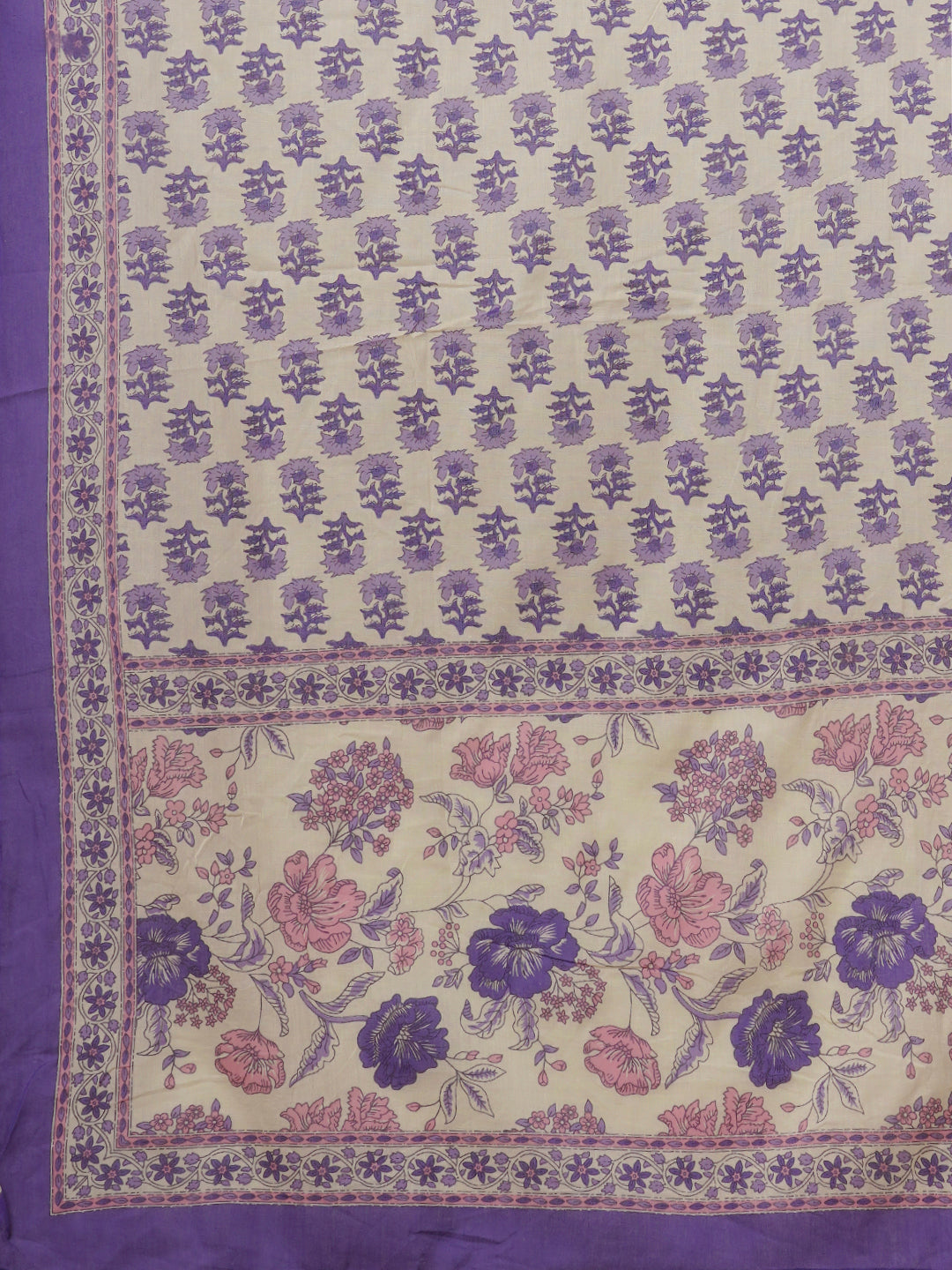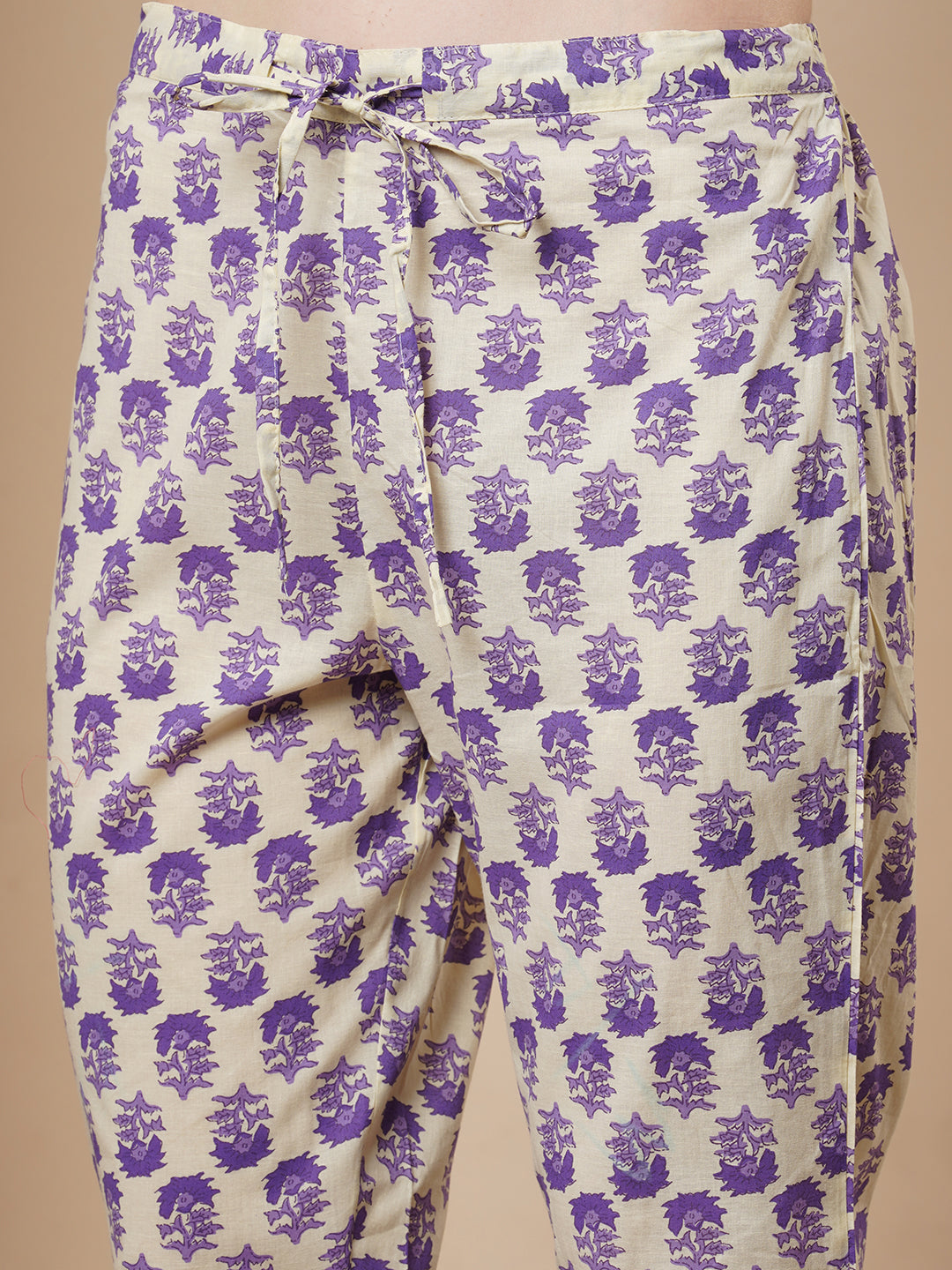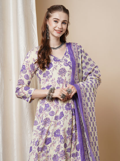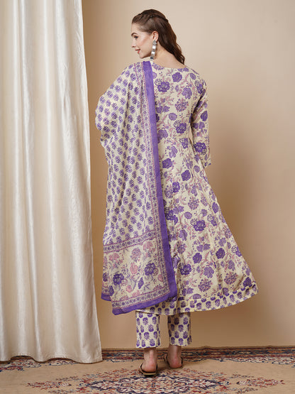 Ethnic Printed & Embroidered Anarkali Kurta with Palazzo & Pure Cotton Dupatta - Off White