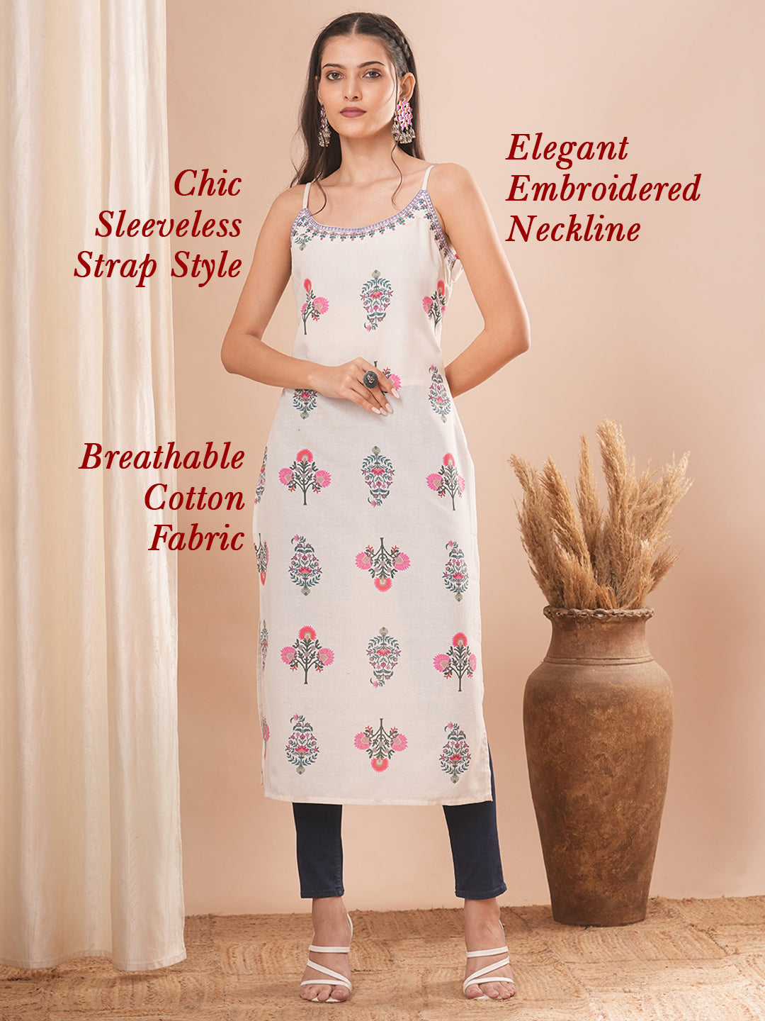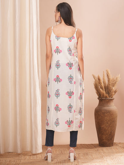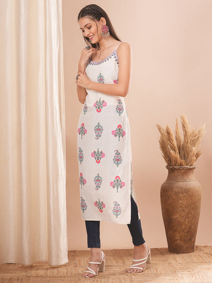 Ethnic Printed & Embroidered Straight Fit Kurta - Off White