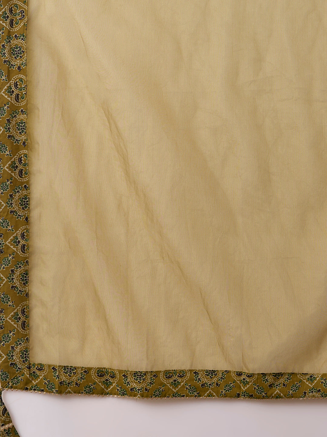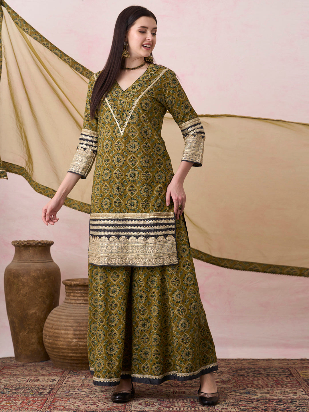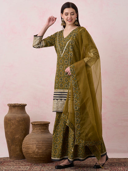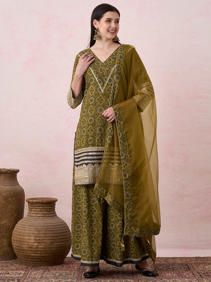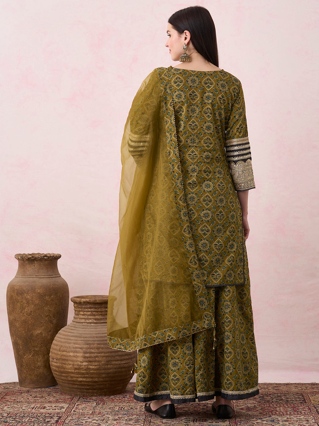 Ethnic Printed & Embroidered Straight Fit Kurta with Flared Palazzo and Dupatta - Green