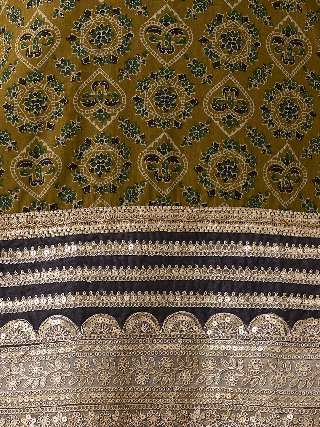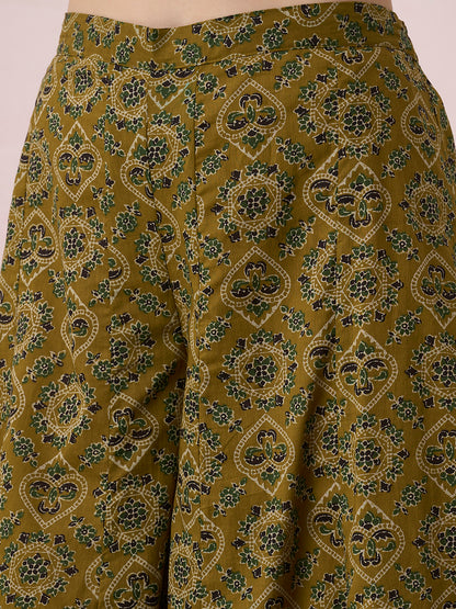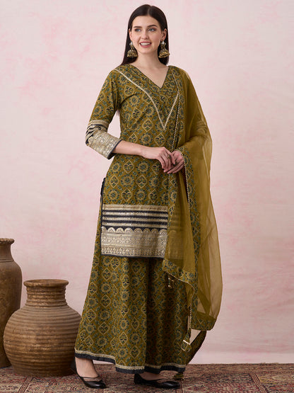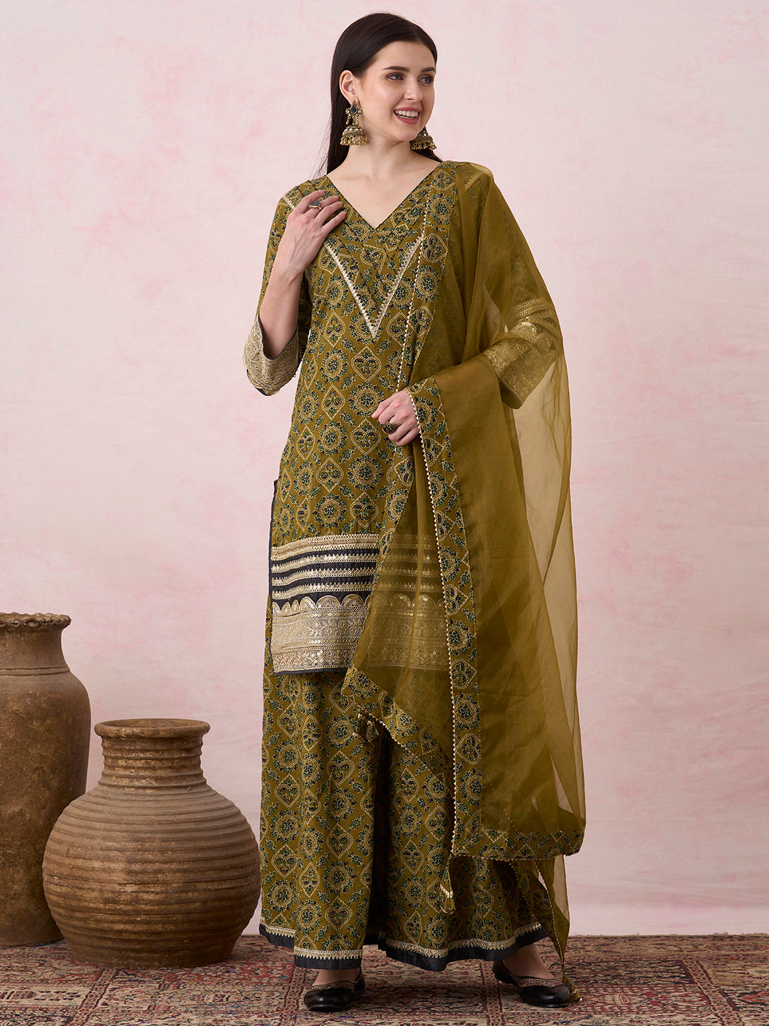 Embrace effortless style with this Green Ethnic Printed Straight Fit Kurta set, crafted from breathable cotton fabric. Highlighted with delicate sequin work on the V-neckline and sleeves, it adds a touch of shimmer to your look. Paired with a flowy flared palazzo and a graceful solid organza dupatta, this ensemble is perfect for festive days and elegant evenings.