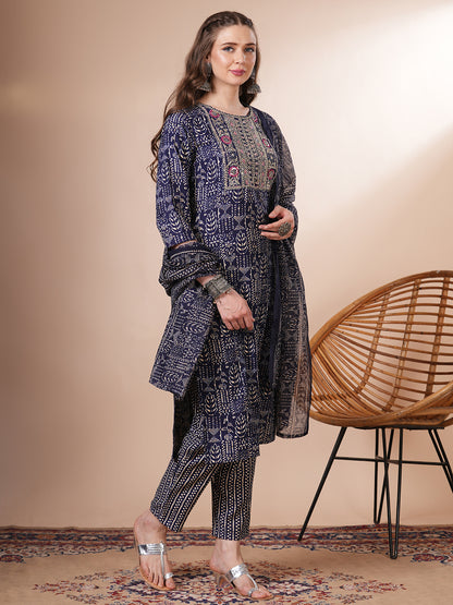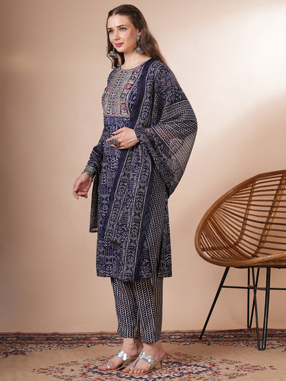 Ethnic Printed & Embroidered Straight Fit Kurta with Pant & Dupatta - Blue