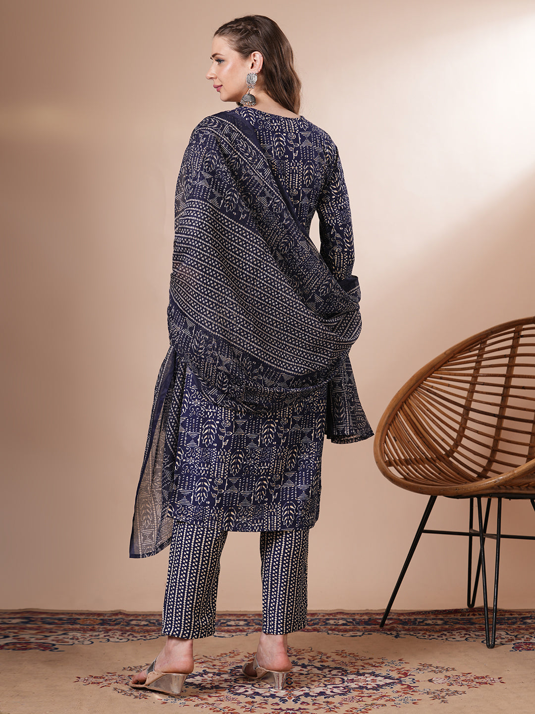 -Turn heads in this Ethnic Printed & Embroidered Straight Fit Kurta with Pant & Dupatta in a striking Blue hue. Made from soft, breathable cotton, it features a round neckline and a beautifully embroidered ethnic yoke. The look is completed with a printed pant and a pure cotton printed dupatta—perfect for festive flair or everyday elegance.