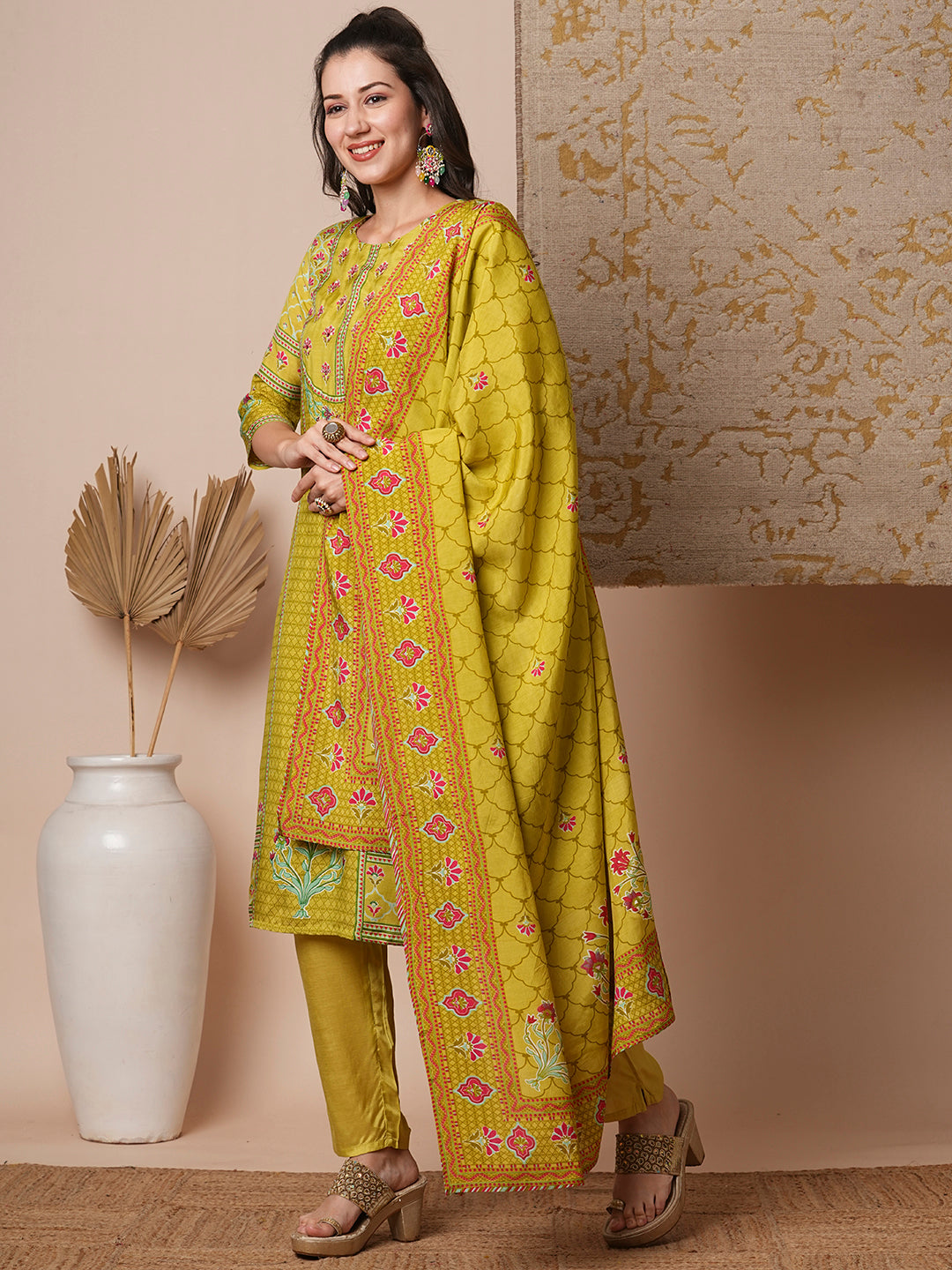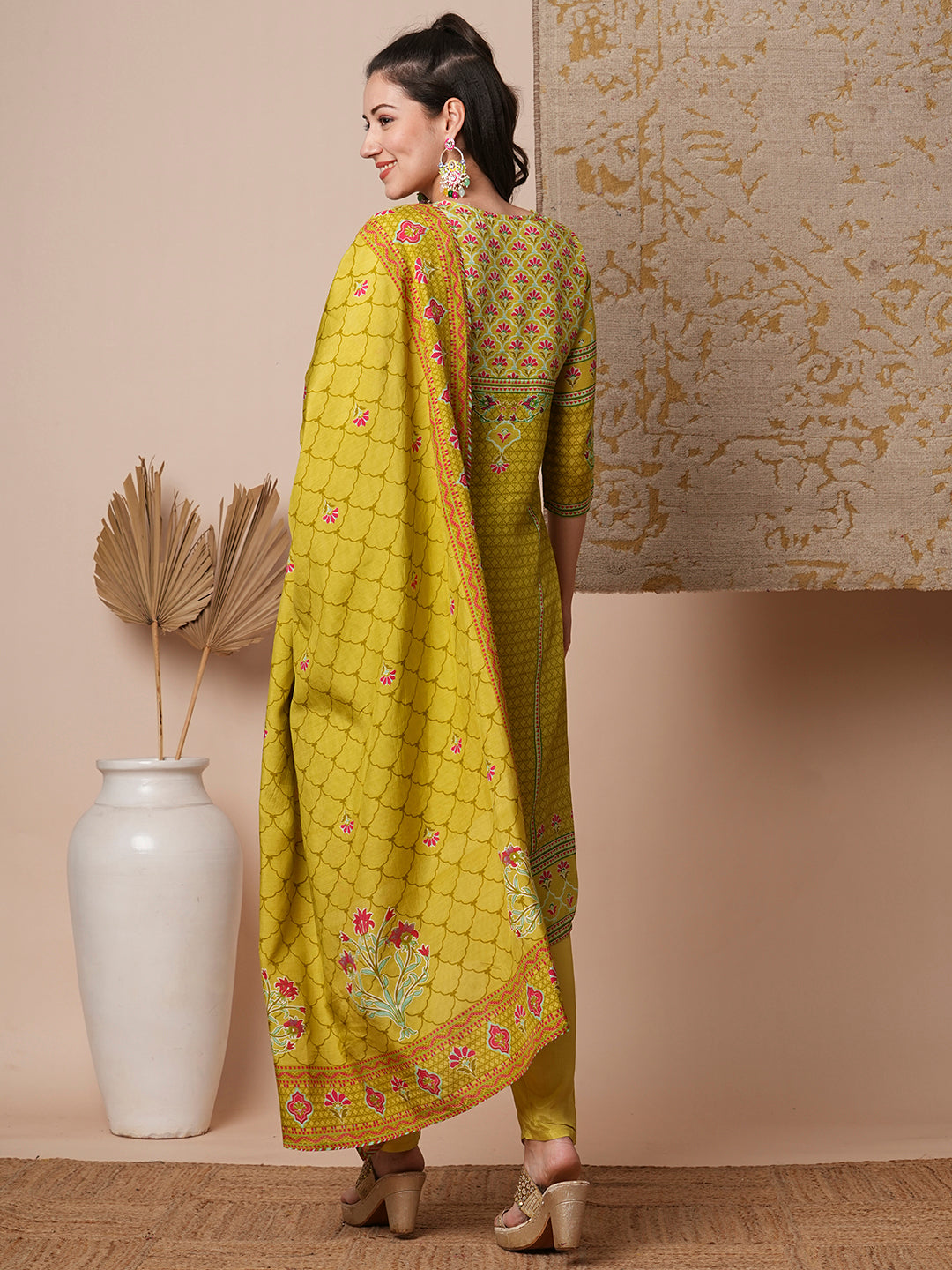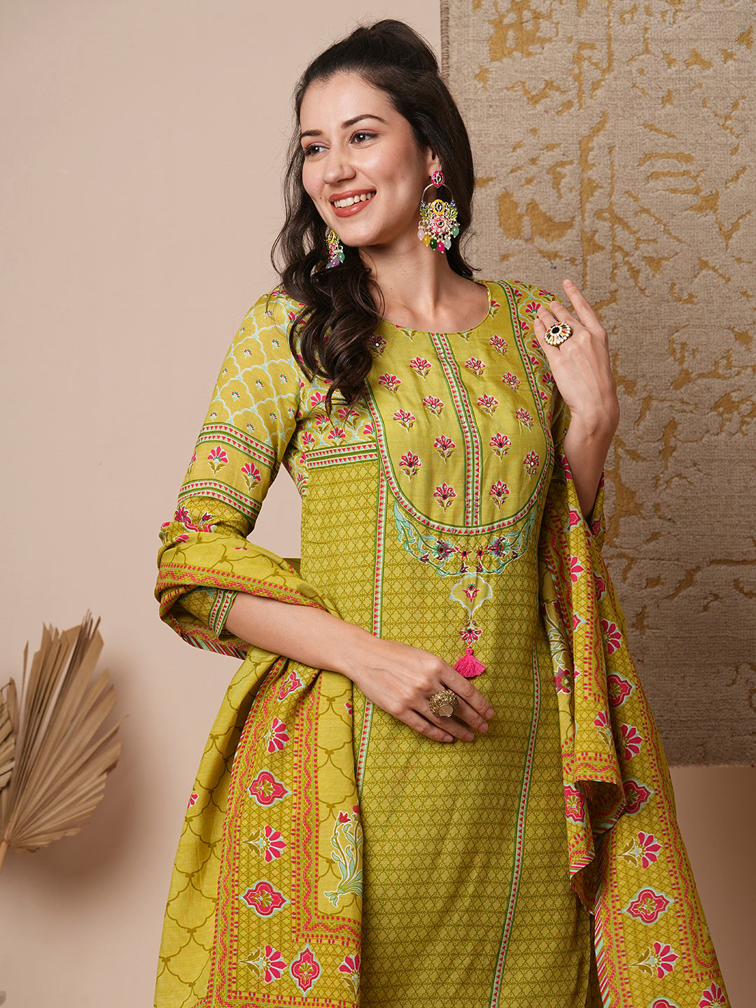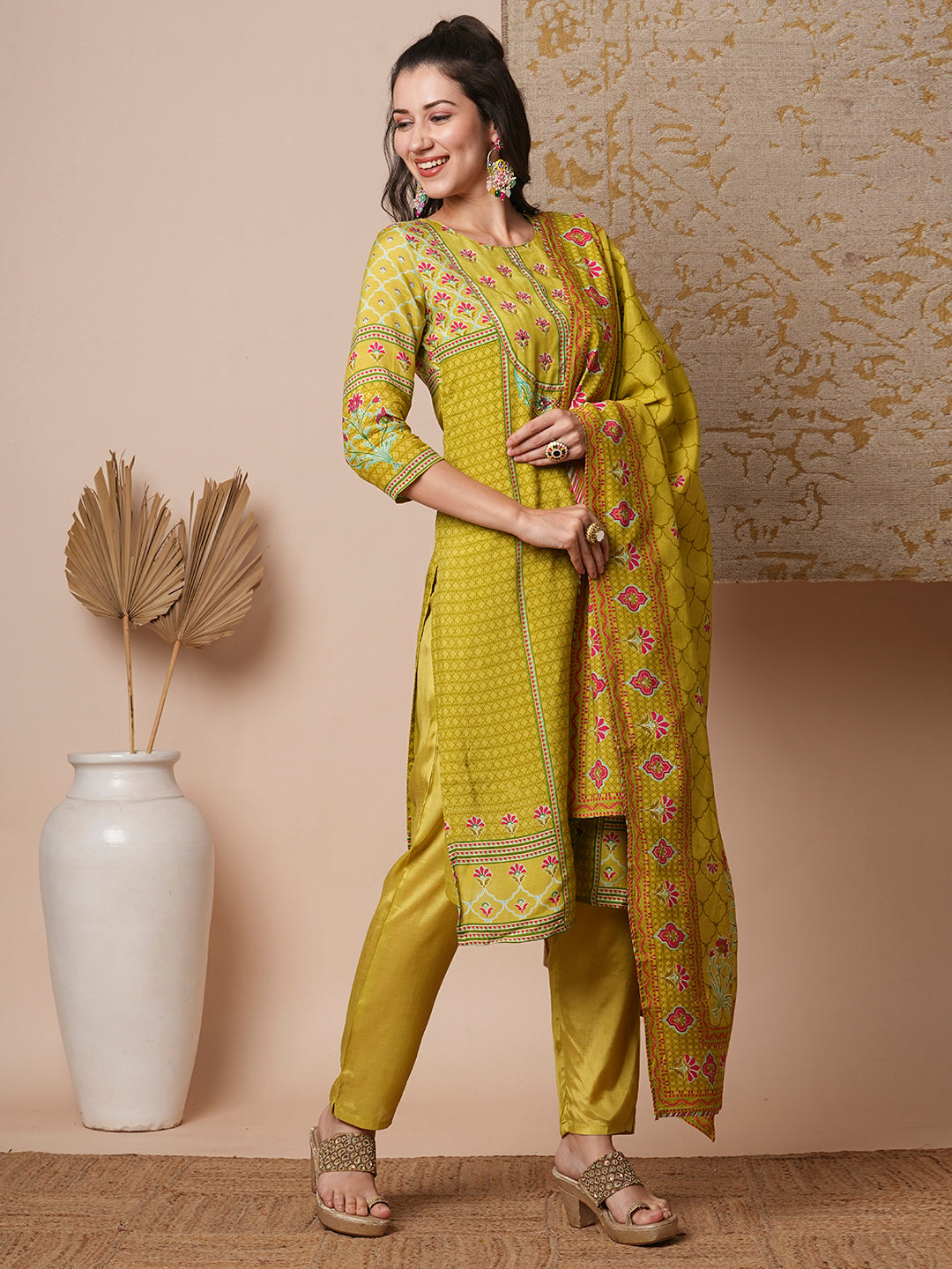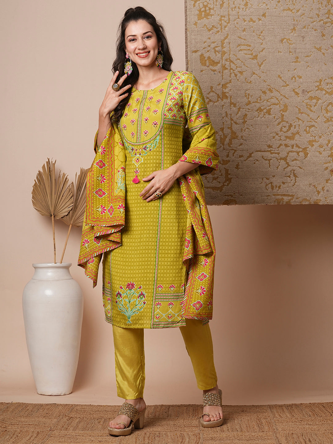Ethnic Printed & Embroidered Straight Fit Kurta with Pant & Dupatta - Lime Green