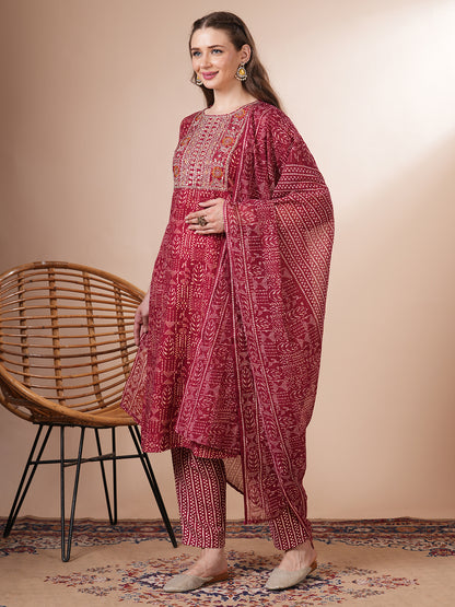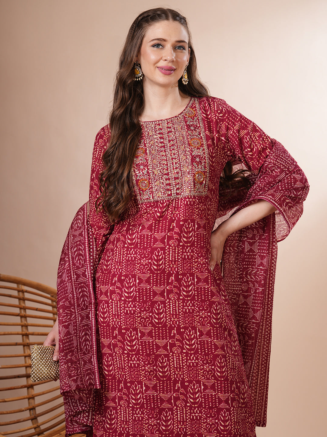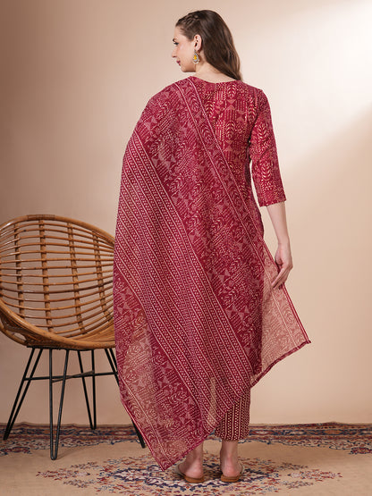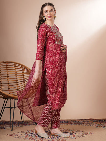 Ethnic Printed & Embroidered Straight Fit Kurta with Pant & Dupatta - Red