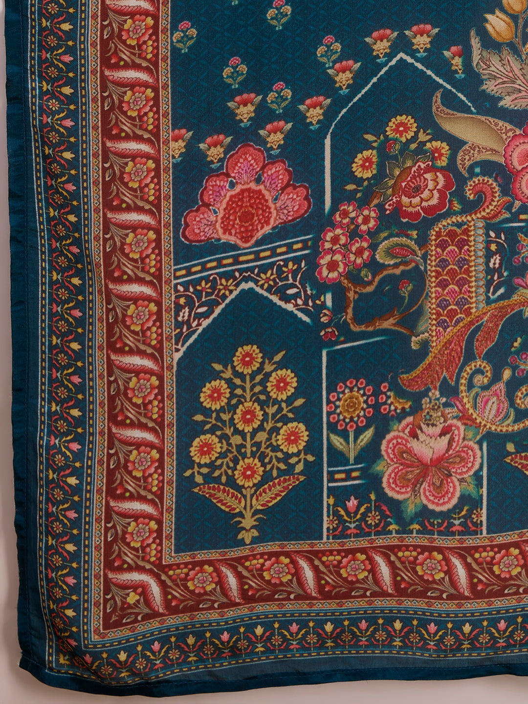 Ethnic Printed & Embroidered Straight Kurta with Palazzo & Dupatta - Navy Blue