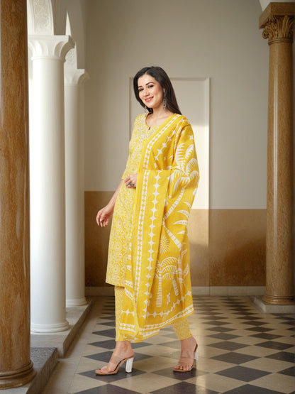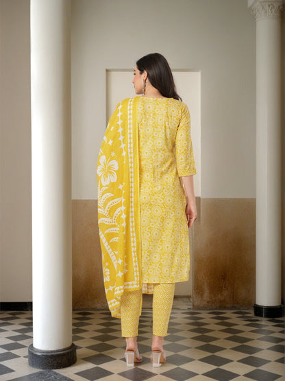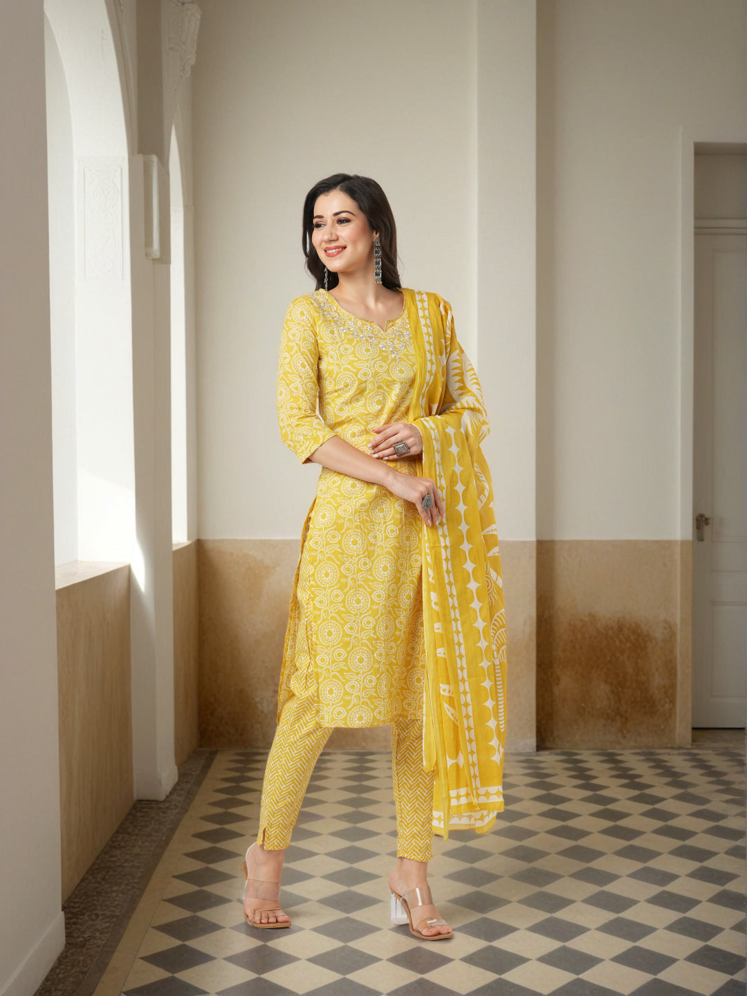 Ethnic Printed & Embroidered Straight Kurta with Pant with Dupatta - Yellow