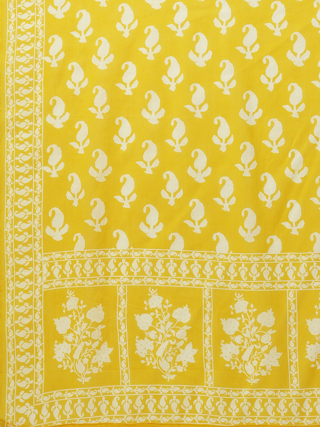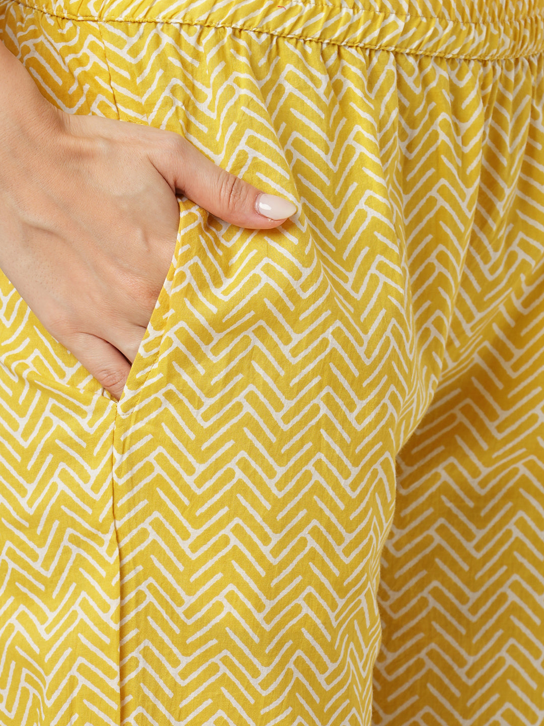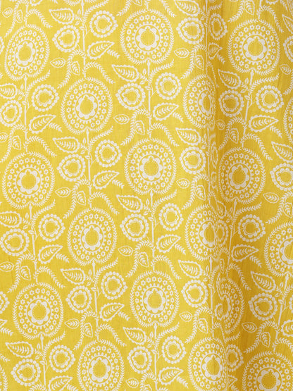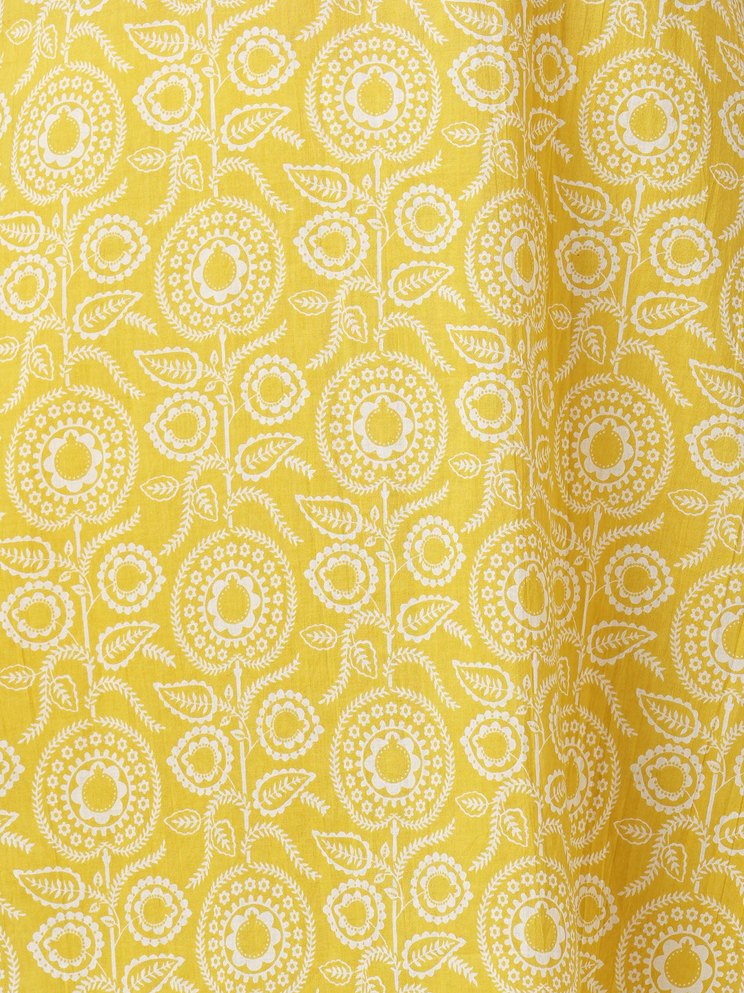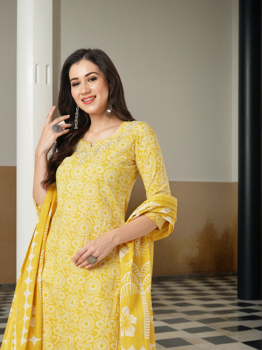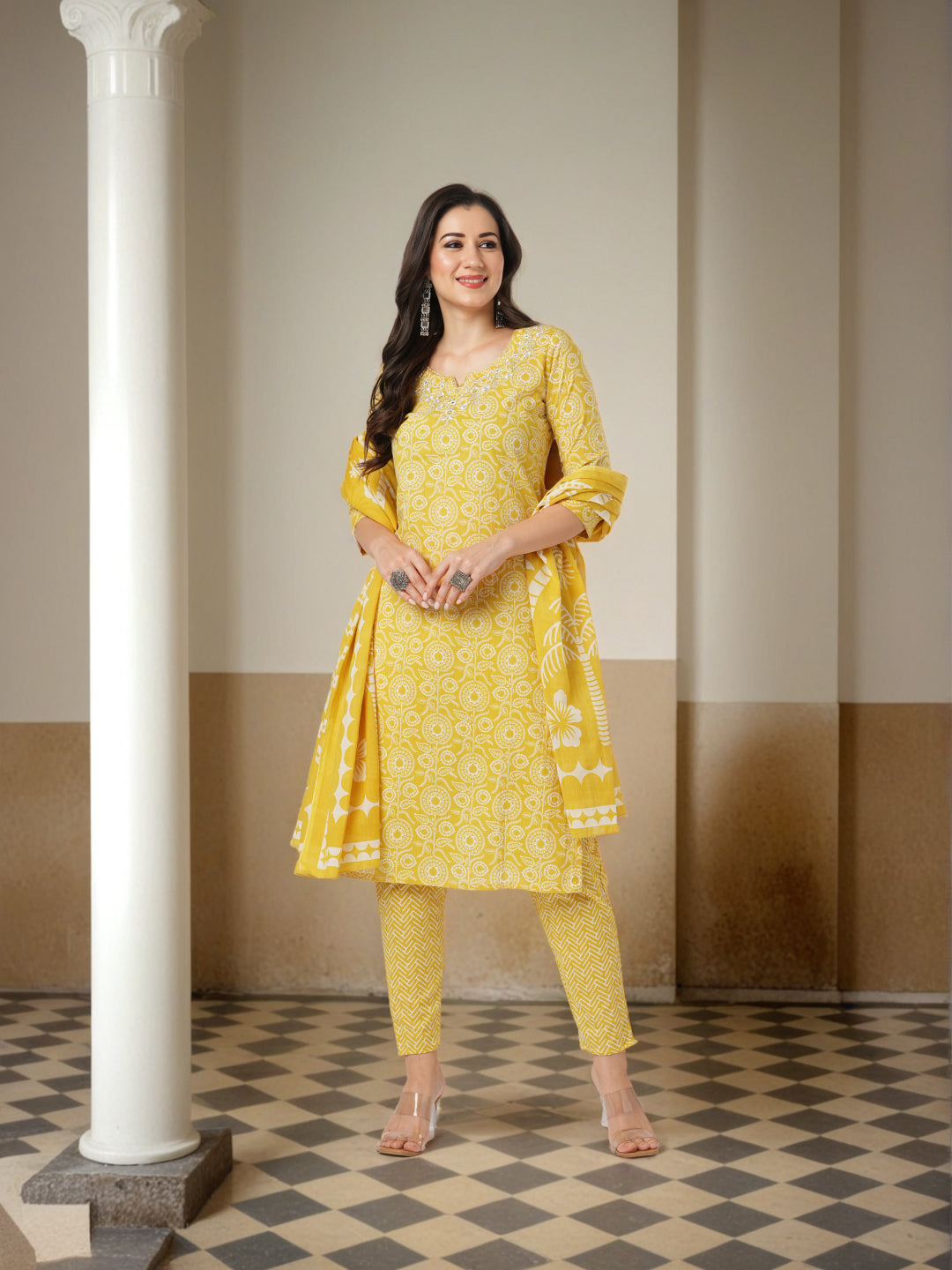 Brighten your ethnic collection with this Ethnic Printed & Embroidered Straight Kurta with Pant and Dupatta in Yellow. Crafted from soft, breathable cotton, the kurta offers all-day comfort with a vibrant festive vibe. The yoke is richly adorned with mirror, zari, and resham embroidery, adding a beautiful handcrafted sparkle. A round neckline and straight silhouette give it a clean, flattering fit. It is paired with a printed pant that adds a touch of contrast and a pure cotton dupatta for a complete, elegant look. Perfect for festive mornings, casual celebrations, or ethnic day-outs.