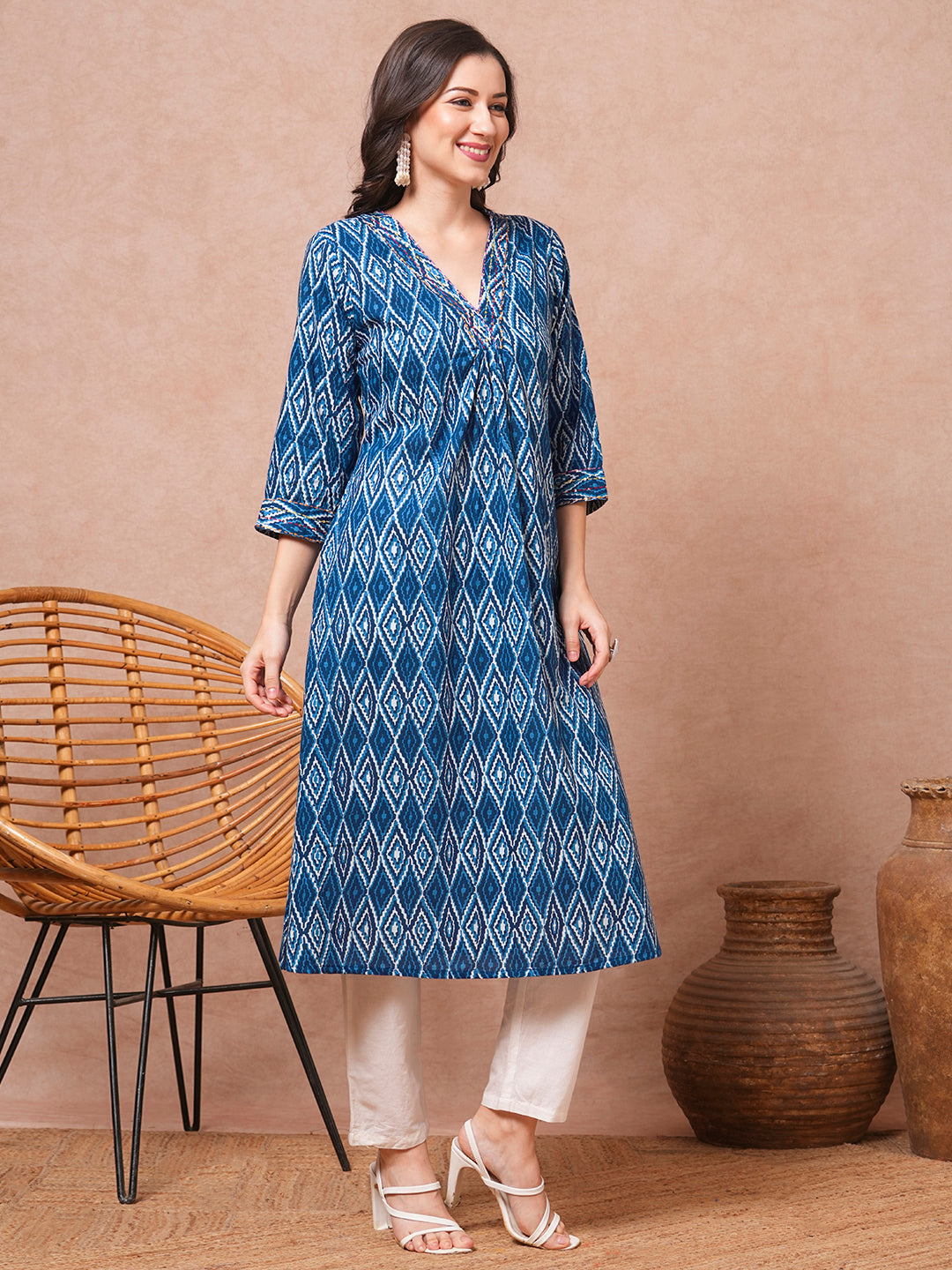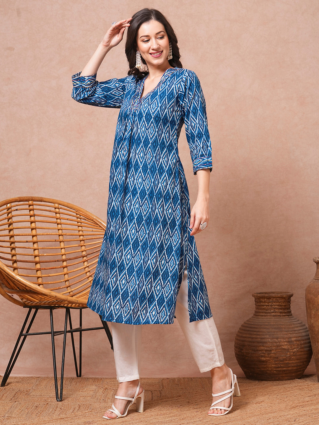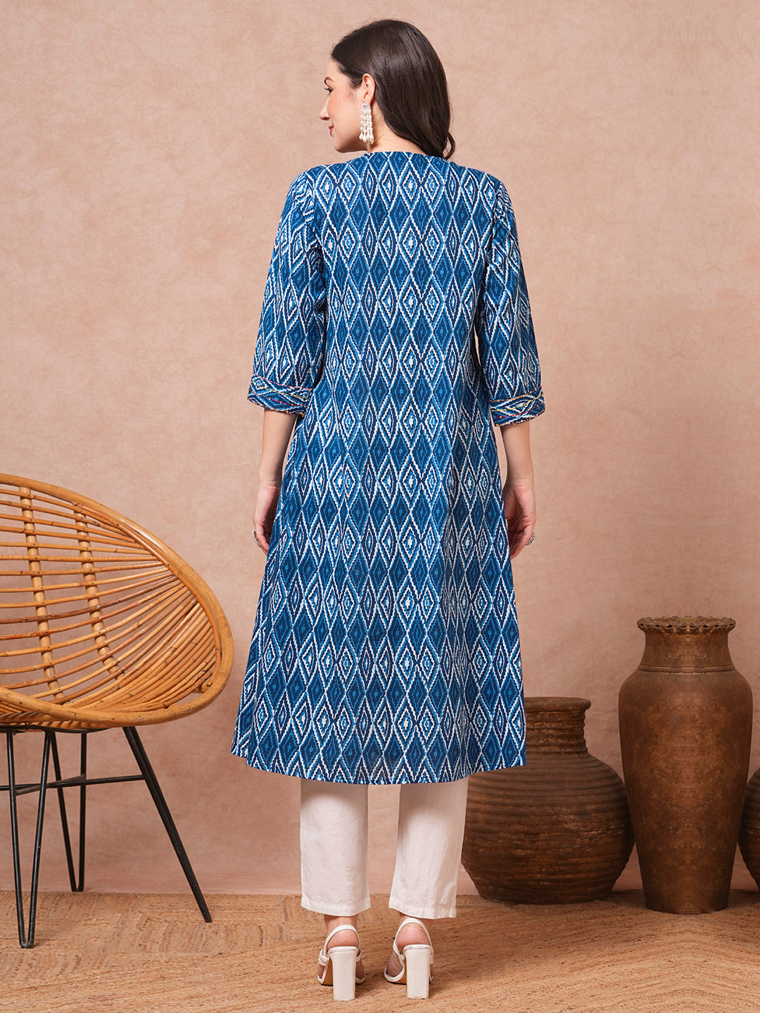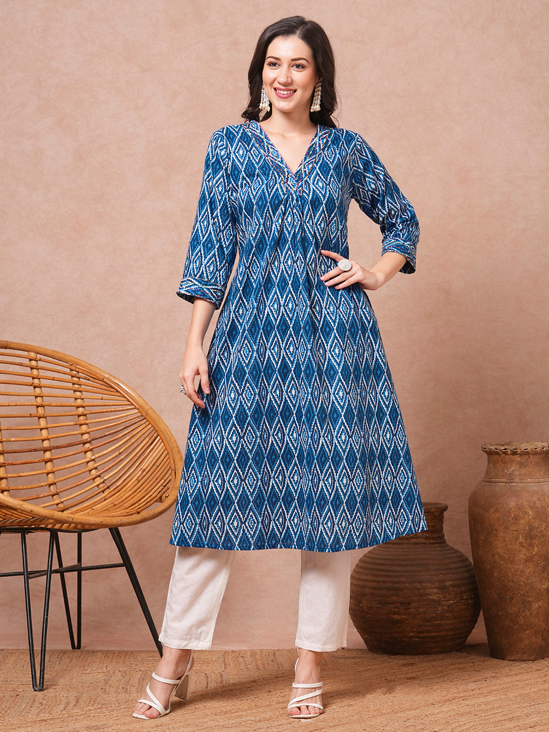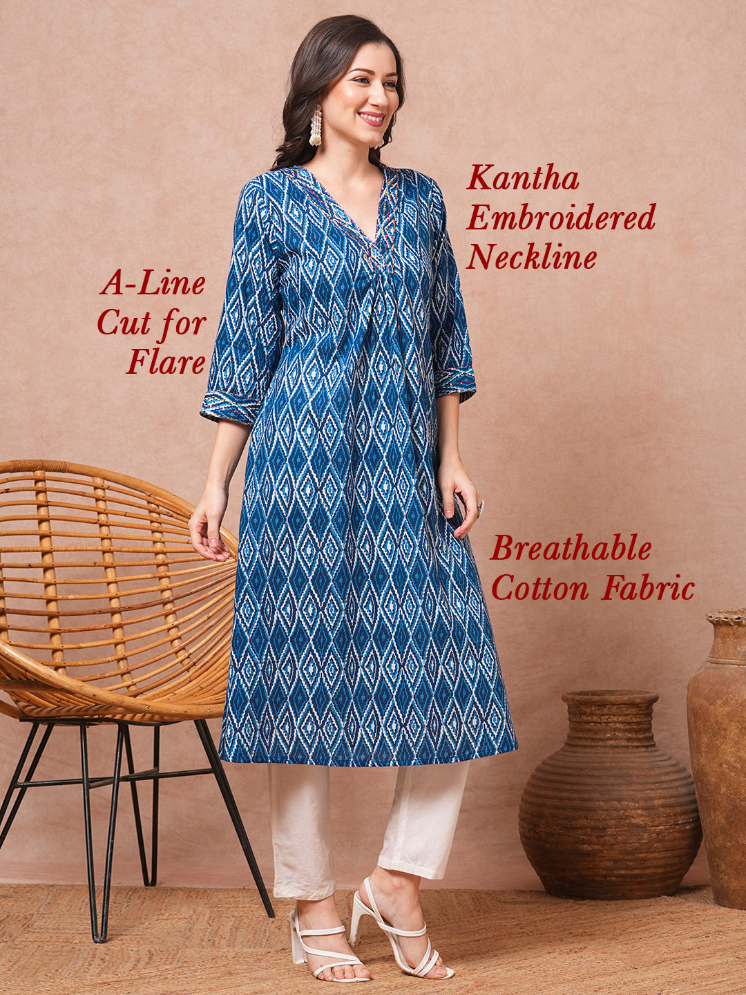Ethnic Printed & Kantha Embroidered A-Line Kurta - Blue