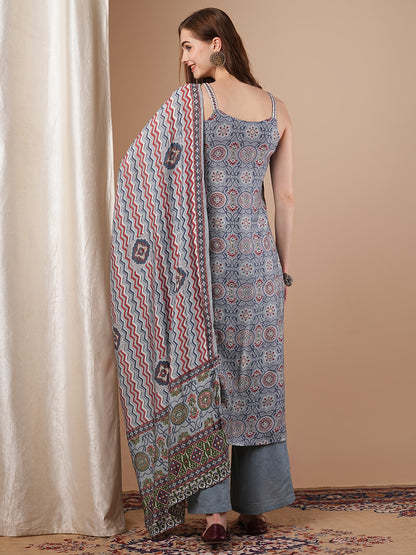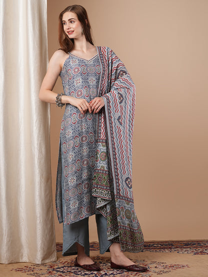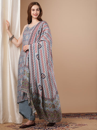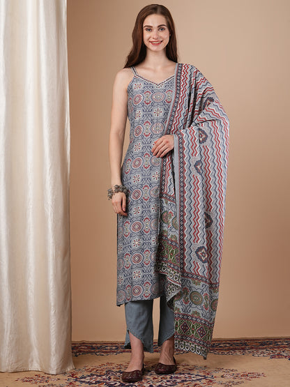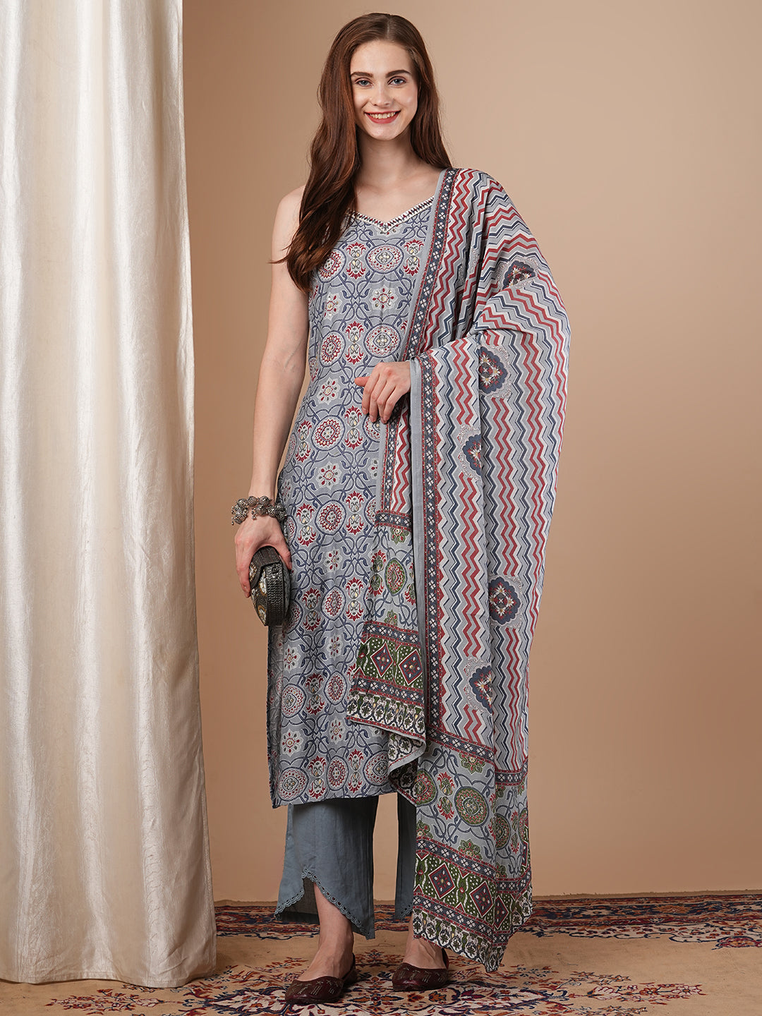 Ethnic Printed & Mirror Embroidered Straight Kurta with Pant & Dupatta - Blue
