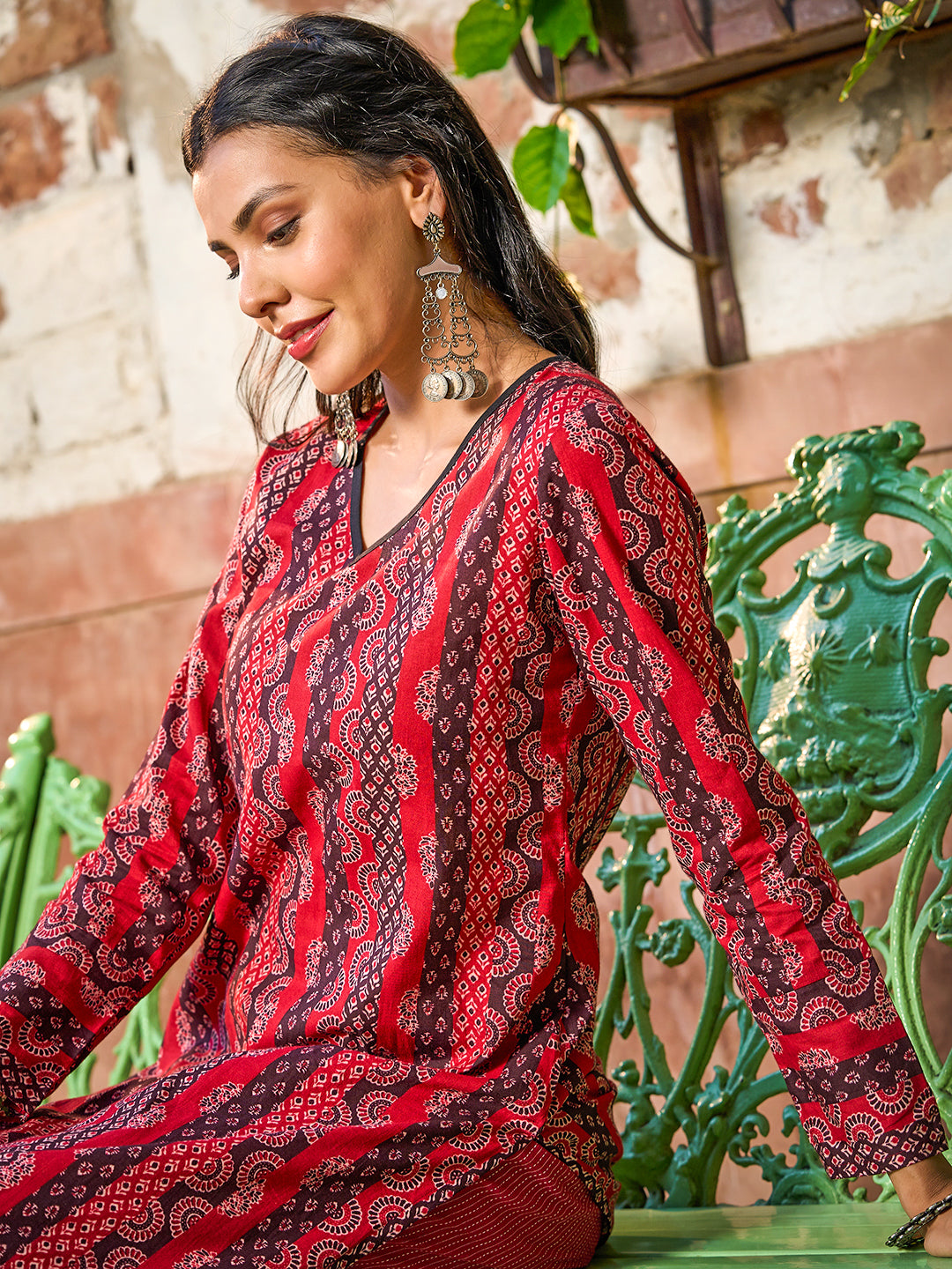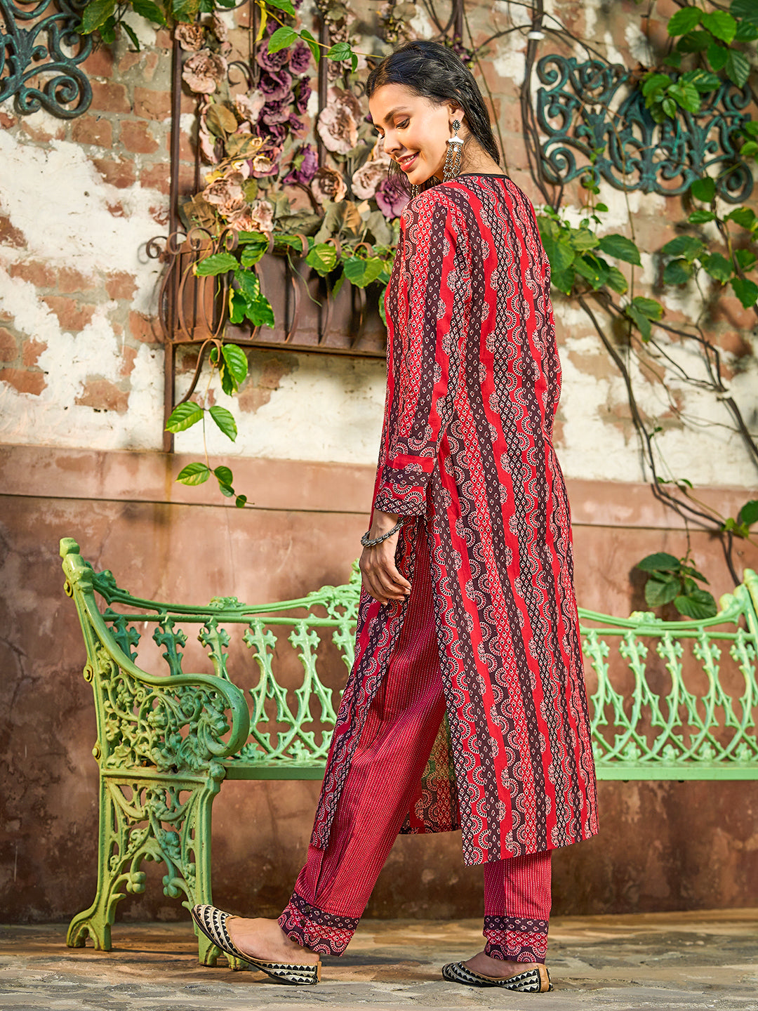 Ethnic Stripes Printed Straight Fit Kurta with Pant - Red