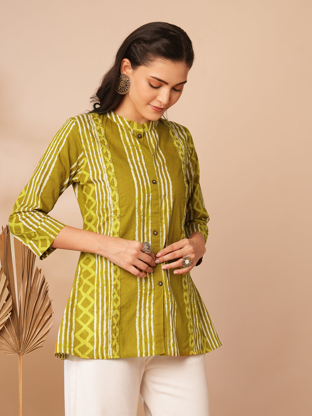 Ethnic Stripes Printed Straight Fit Kurti - Mustard Green