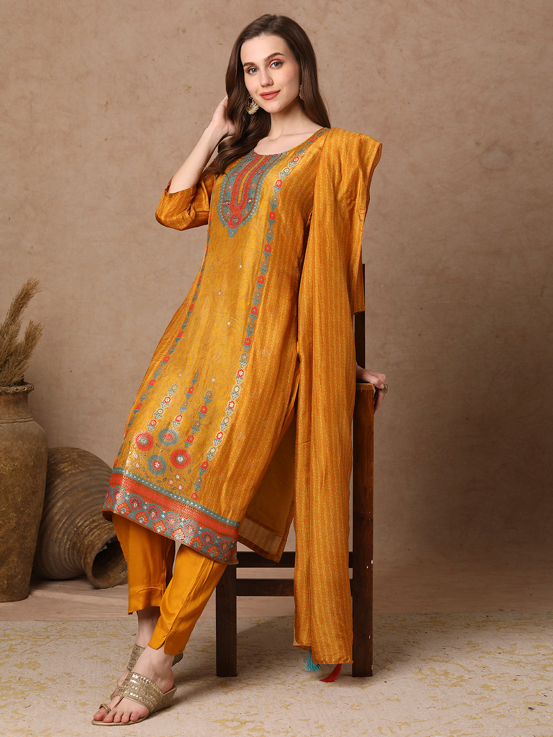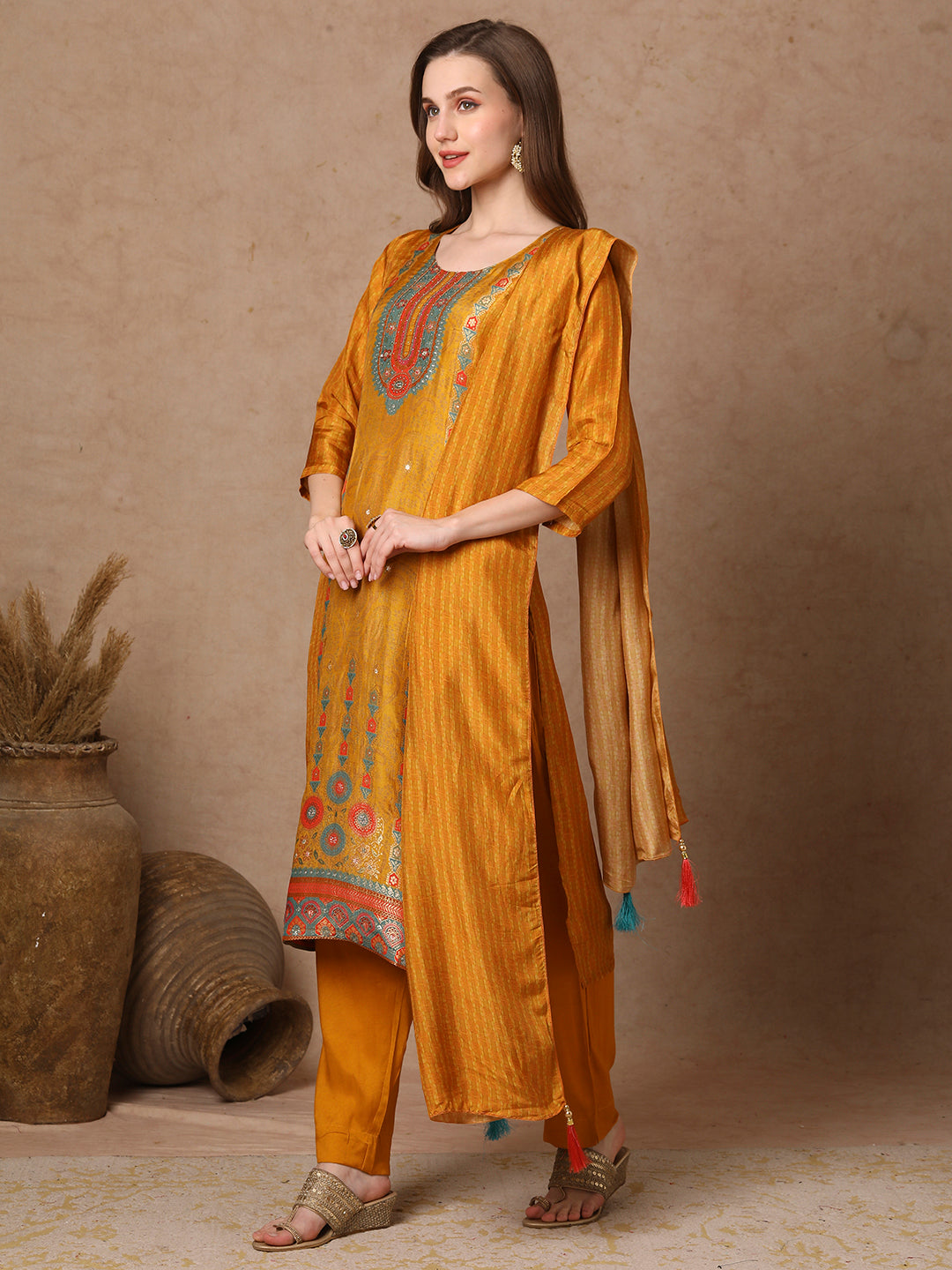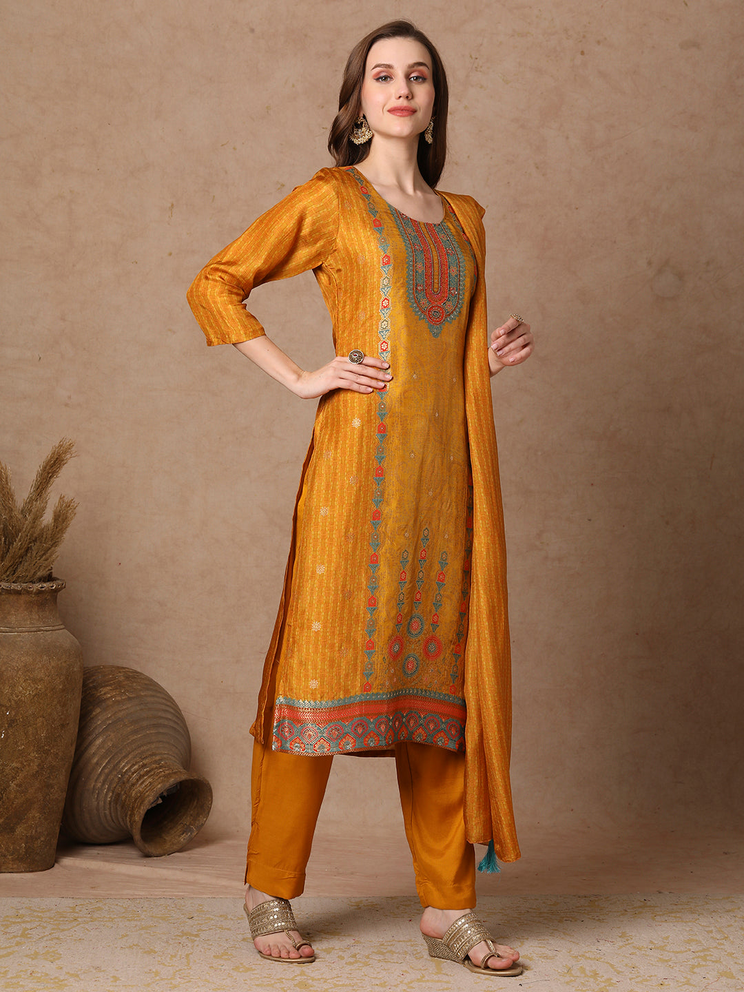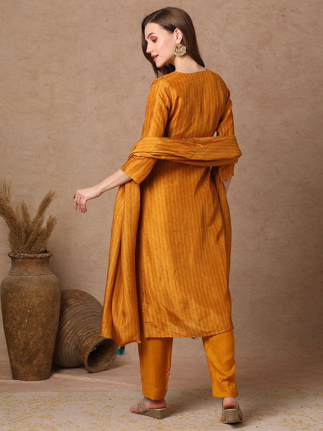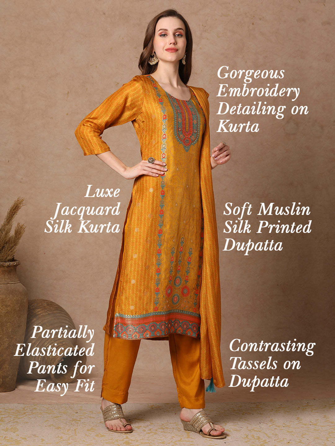 Ethnic Woven & Embroidered Straight Kurta with Pant & Dupatta - Mustard