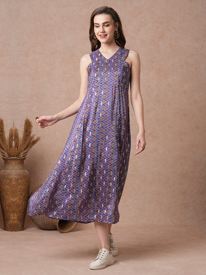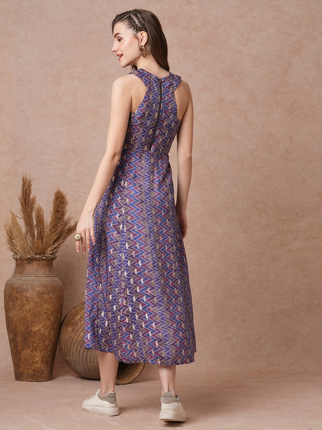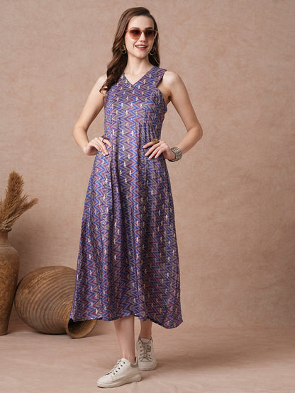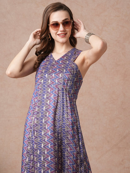 Ethnic Woven Ikat Printed A-Line Paneled Midi Dress - Blue