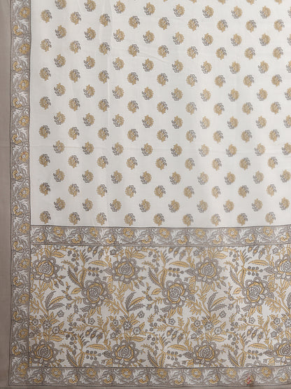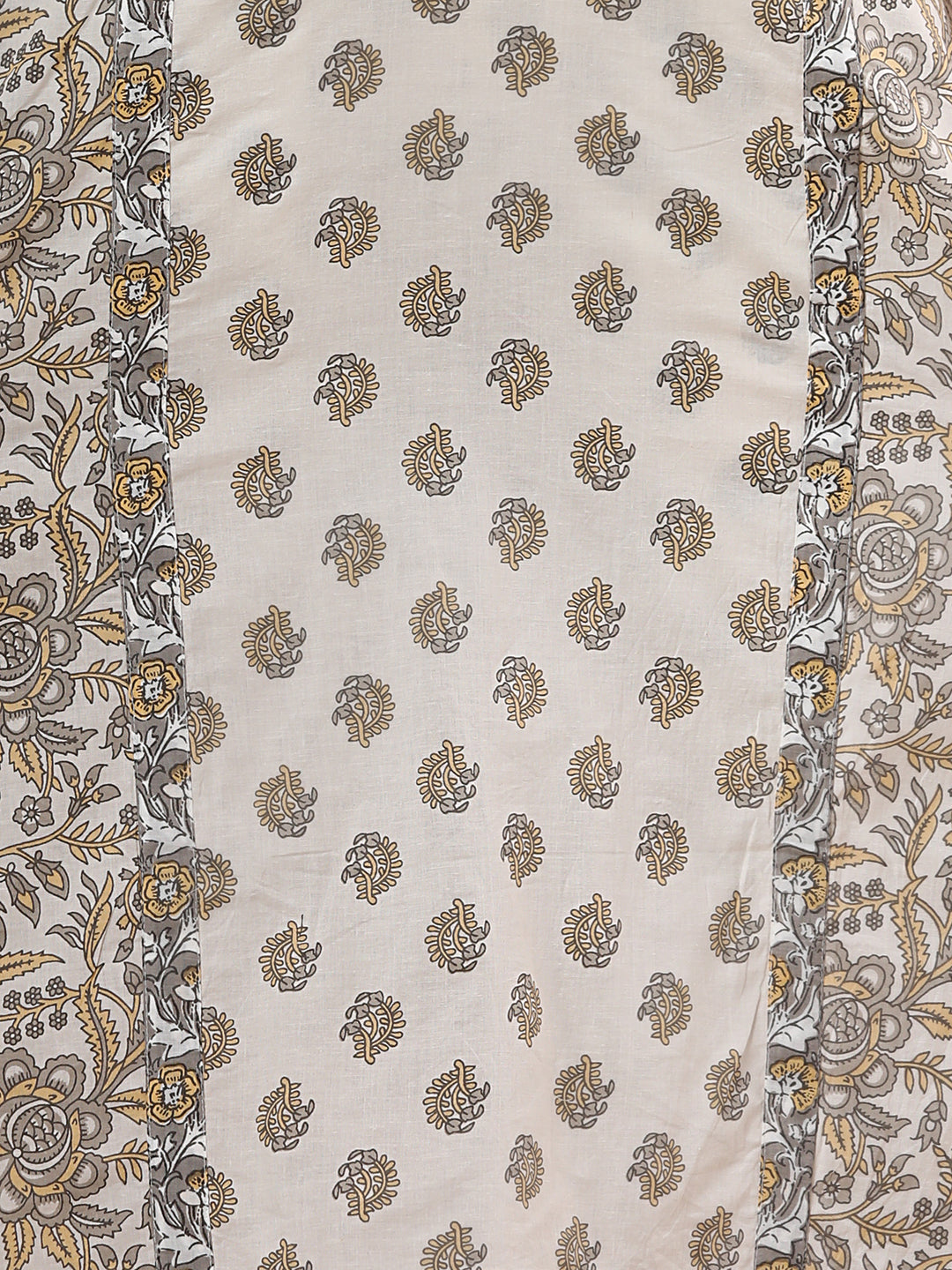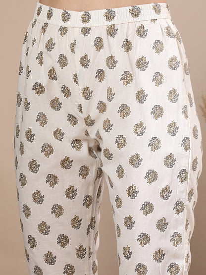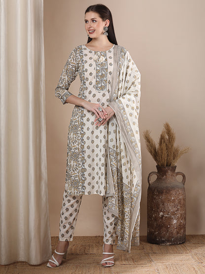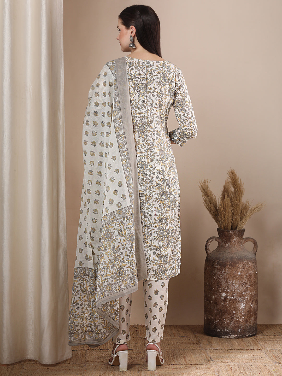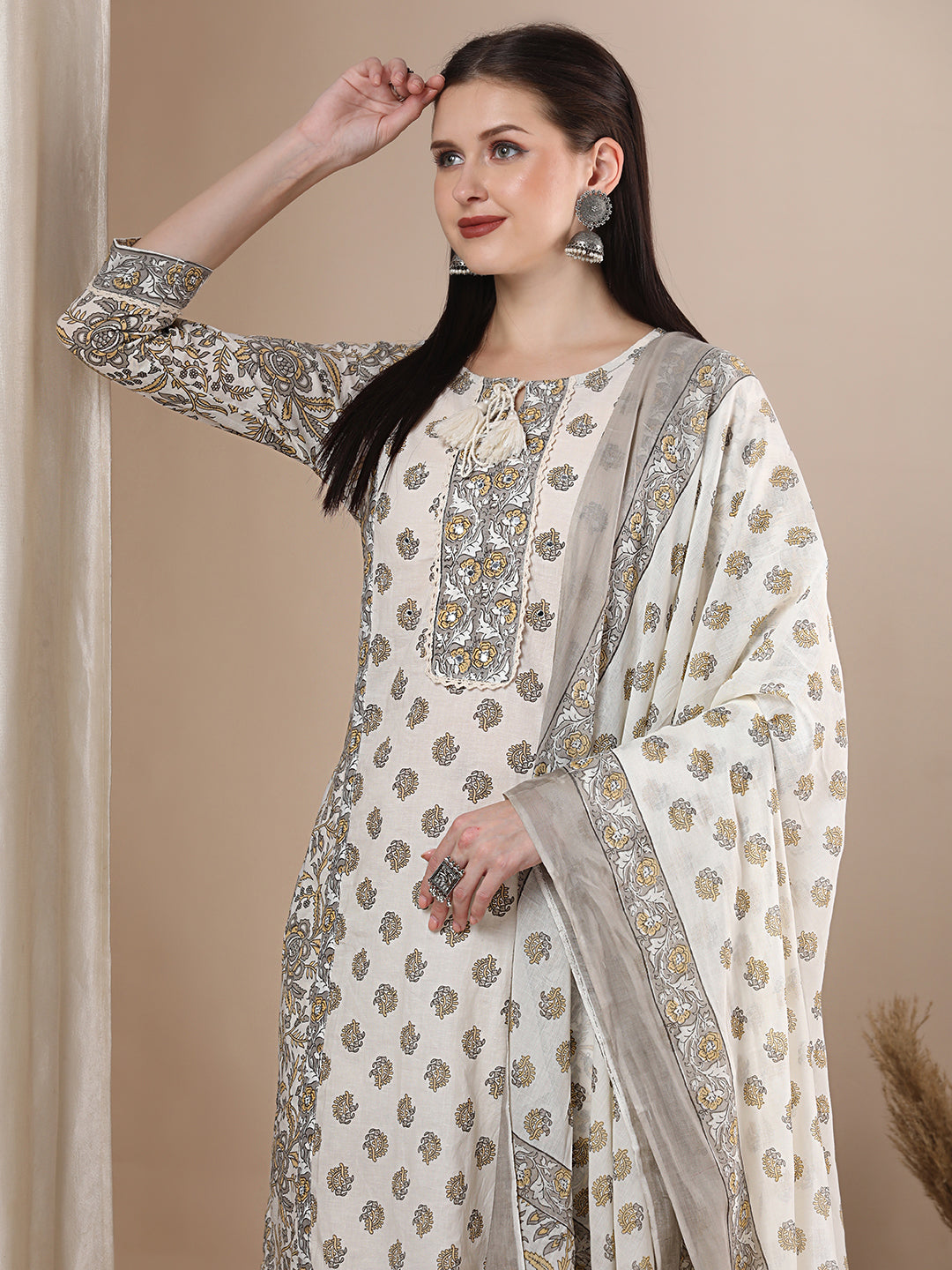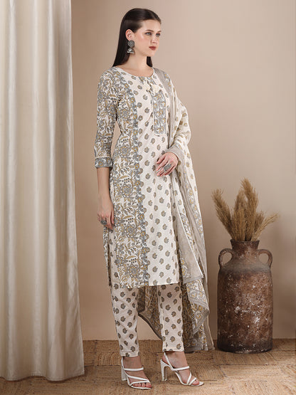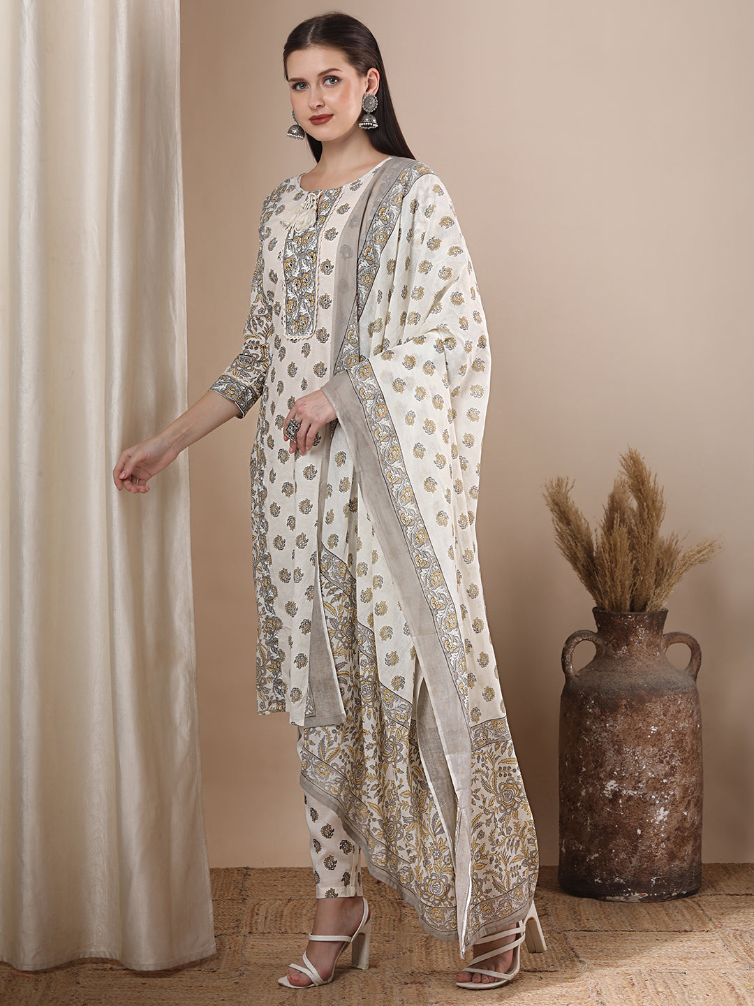 Floral Block Printed & Embroidered Straight Cut Kurta with Pant & Dupatta - Off White