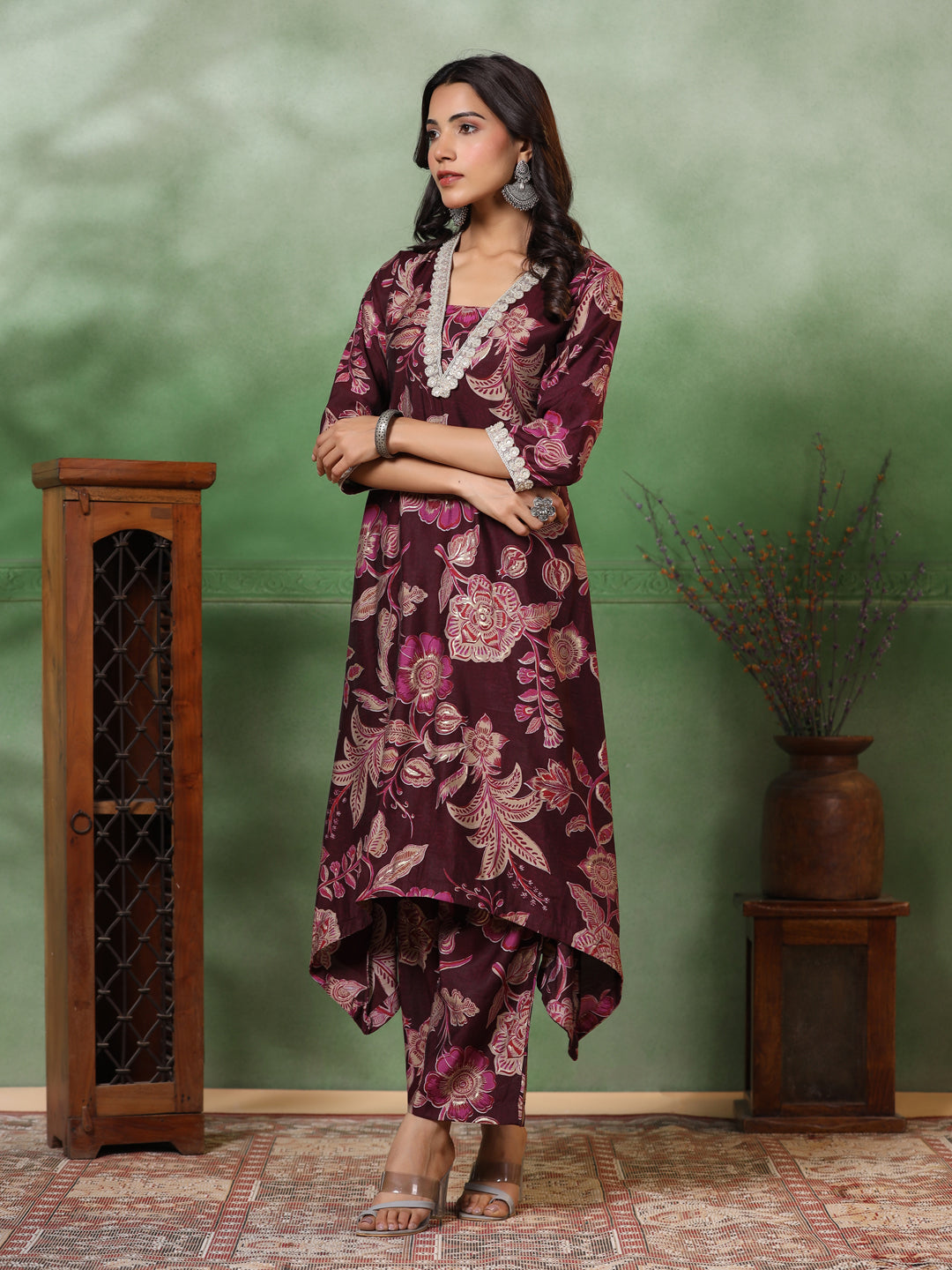 Floral Foil Printed & Embroidered A-Line High-Low Kurta with Pant - Deep Purple