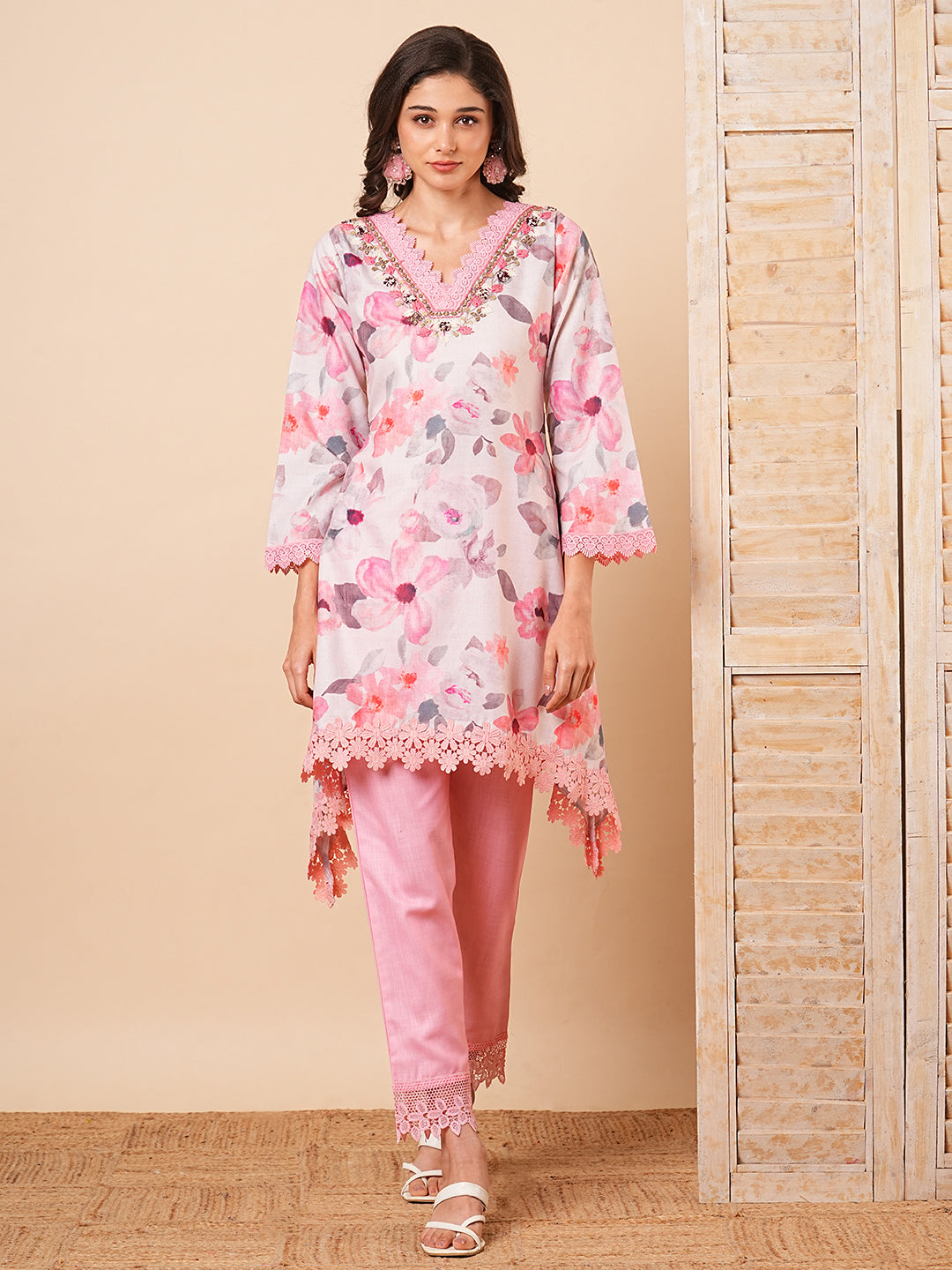 Floral Foil Printed & Embroidered A-Line High-Low Kurta with Pant