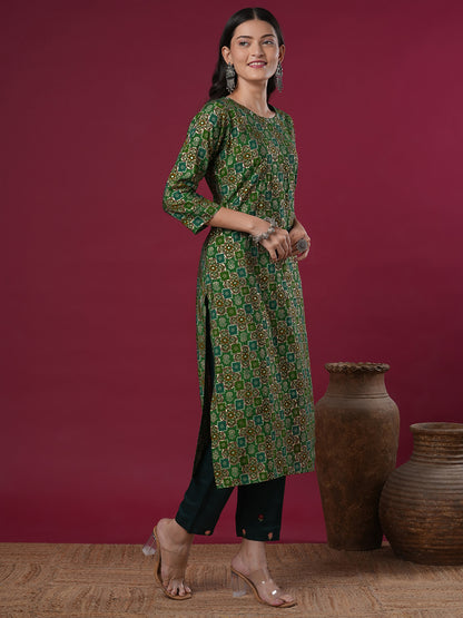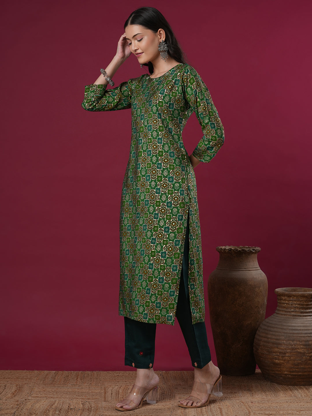 Floral Foil Printed & Embroidered Straight Fit Kurta - Green