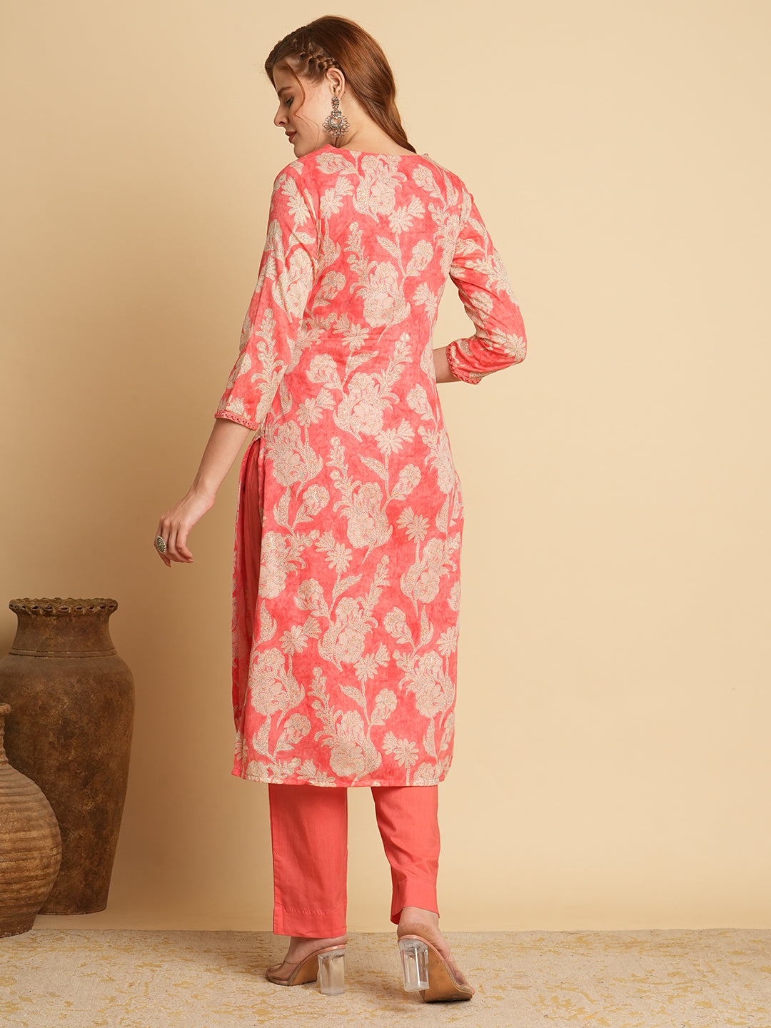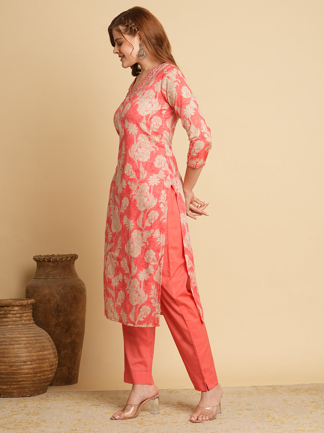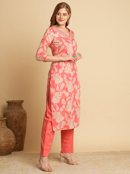 Floral Foil Printed & Embroidered Straight Fit Kurta with Pant - Pink