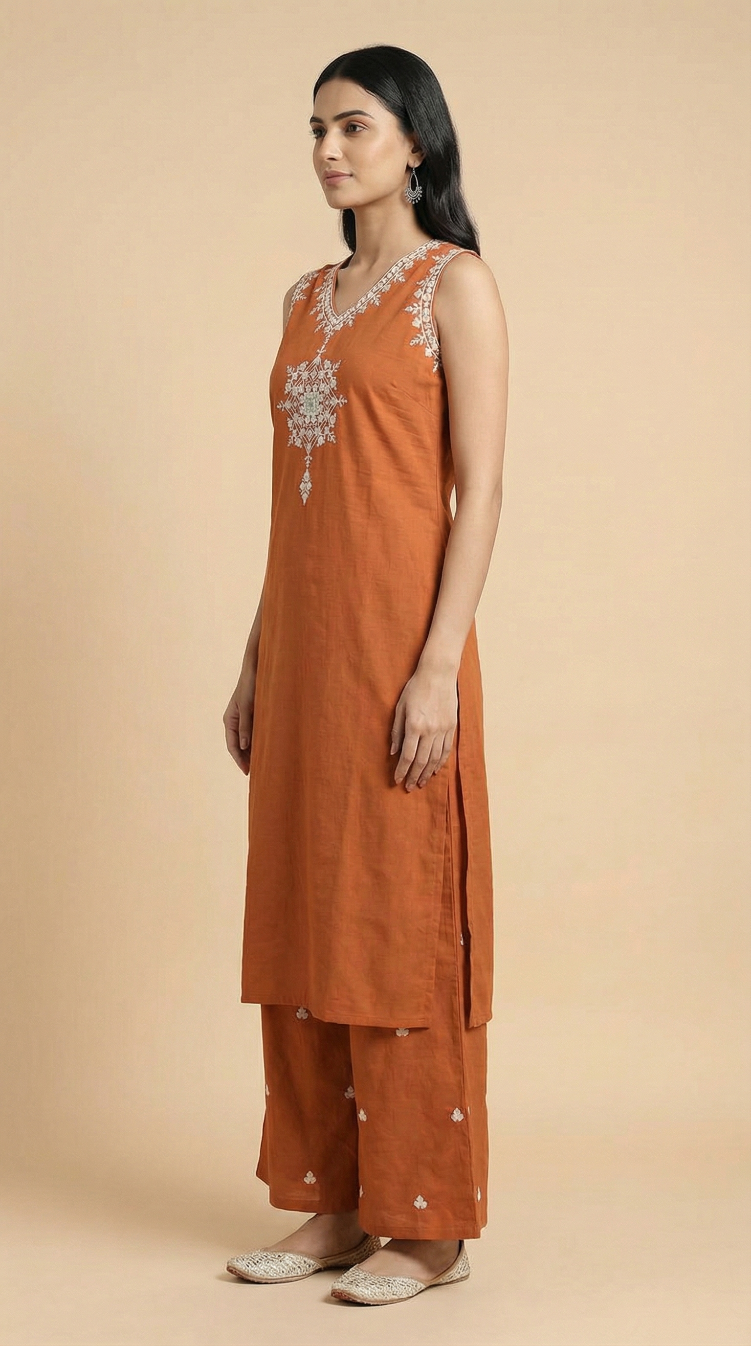 Elevate your ethnic style with this Solid Rust Mirror & Threadwork Embroidered Straight Co-ord Set, designed for effortless sophistication. Crafted from breathable viscose rayon, it ensures comfort while maintaining a polished look. The elegant v neckline and intricate threadwork embroidery add a touch of refined ethnic charm, while the Straight silhouette creates a flattering, graceful flow. Perfect for festive occasions, daytime events, or stylish everyday wear, this co-ord set is where comfort meets timeless elegance.