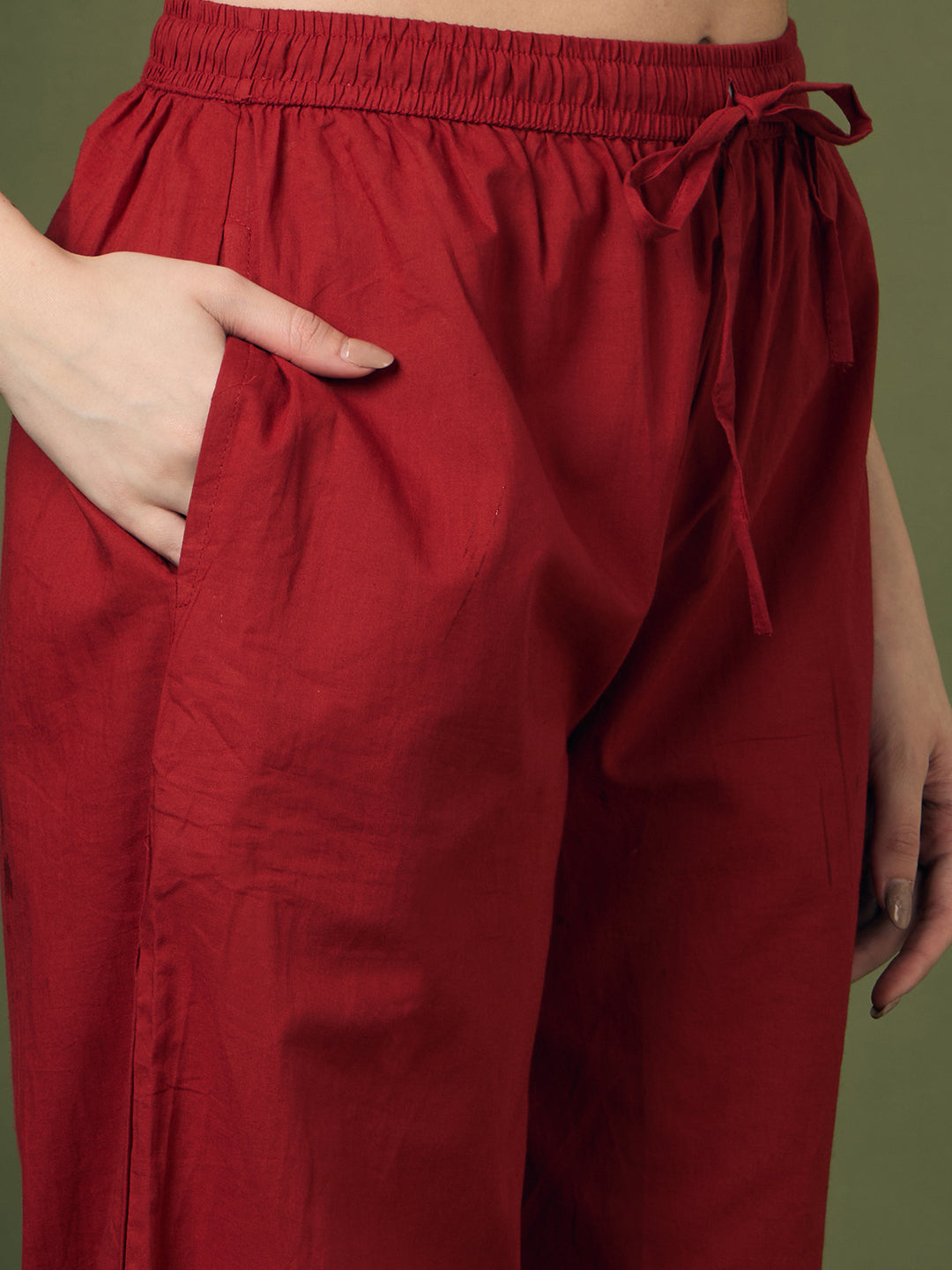 Floral Printed & Sequin Embroidered A-Line Pleated Kurta with Palazzo and Dupatta – Maroon– crafted in breathable cotton with a flattering V-neckline, Applique work, and elegant pin-tuck detailing at the front. Paired with a solid Flared palazzo and a pure cotton printed dupatta, this set blends festive charm with effortless grace.