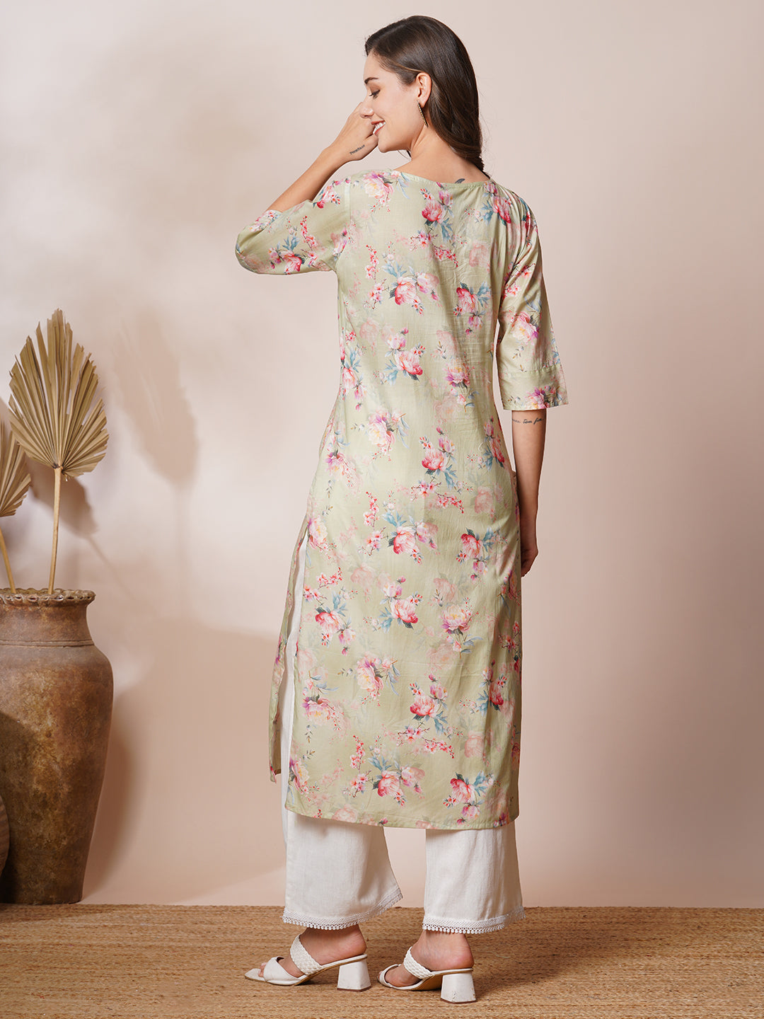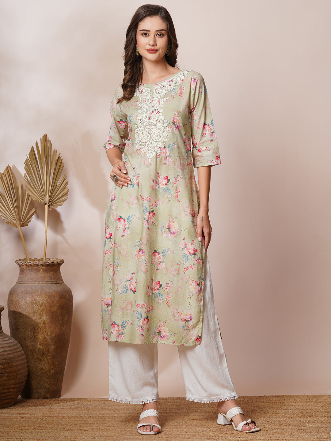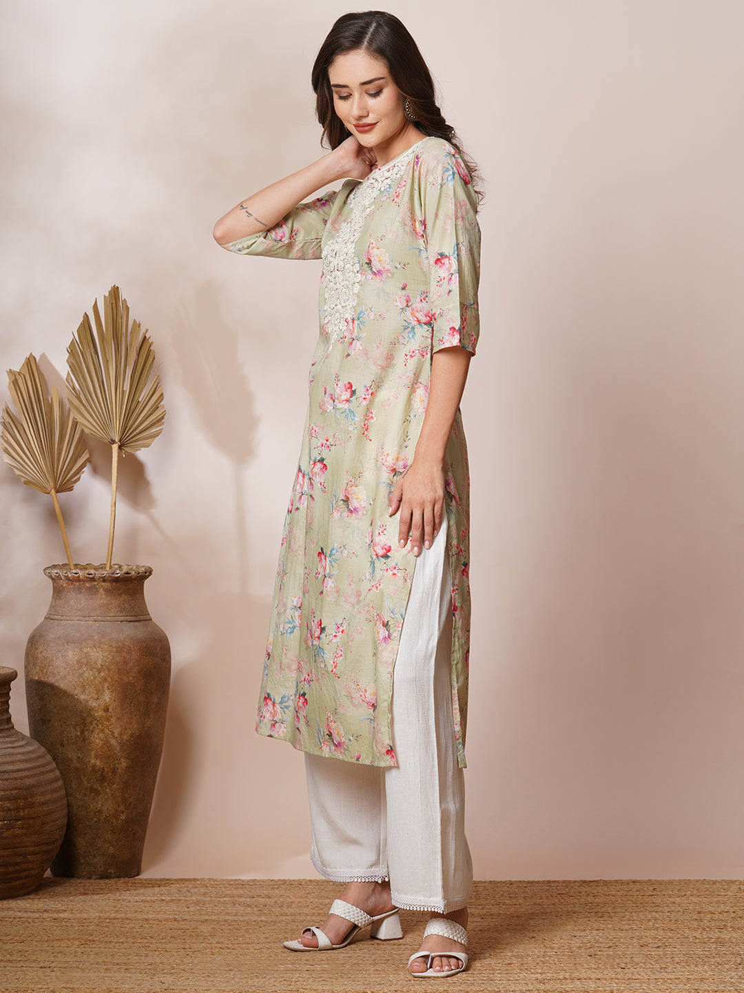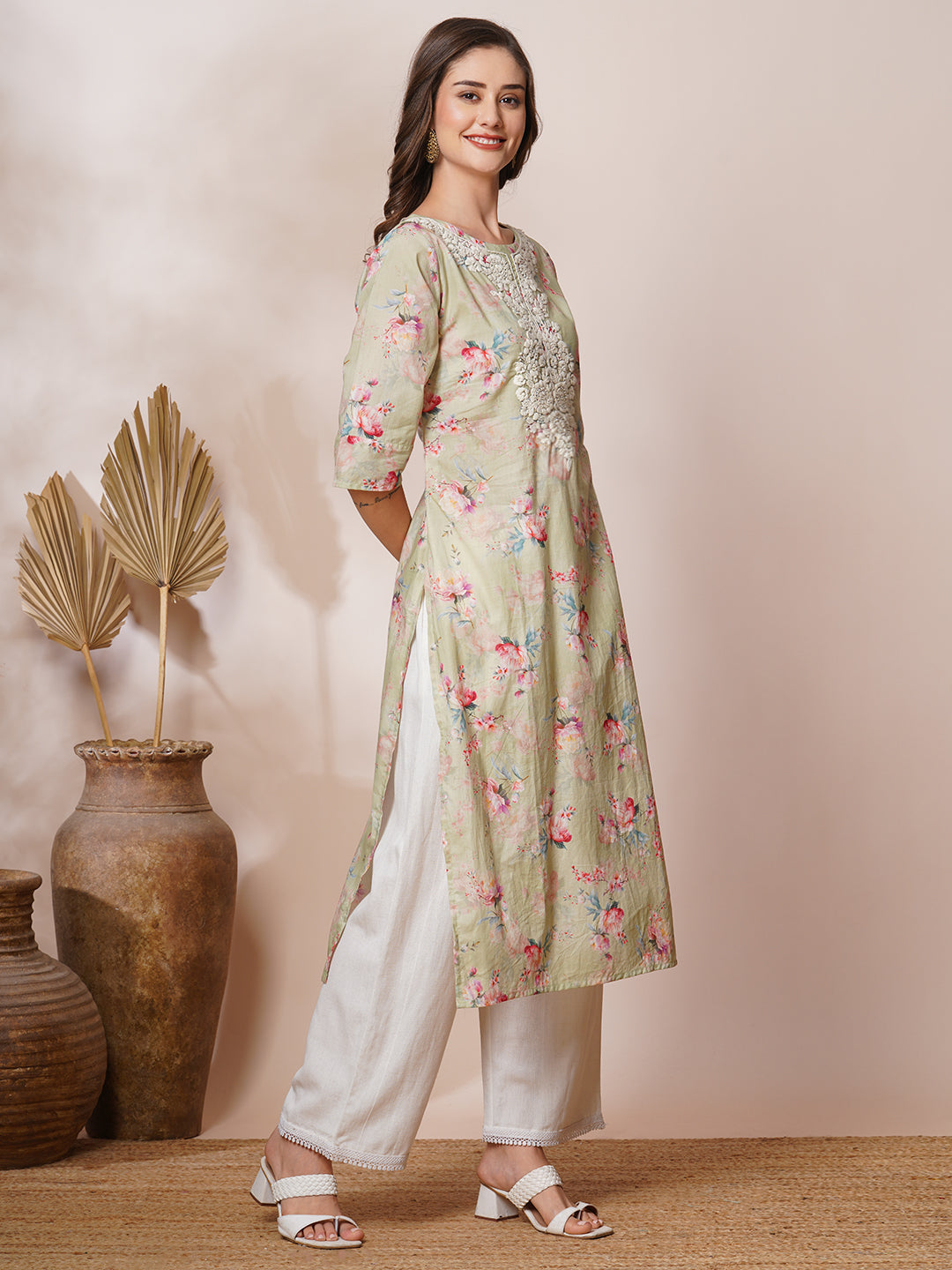 Floral Printed & Chikankari Embroidered Straight Fit Kurta - Mint Green