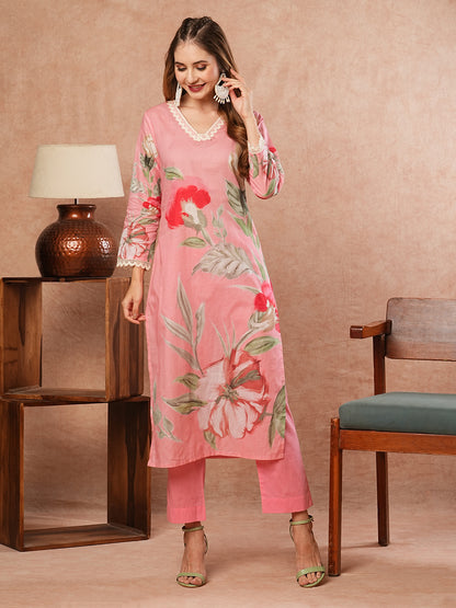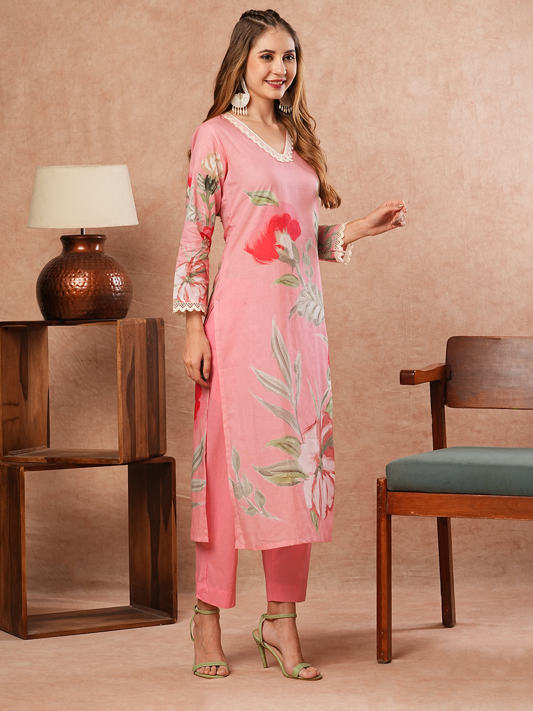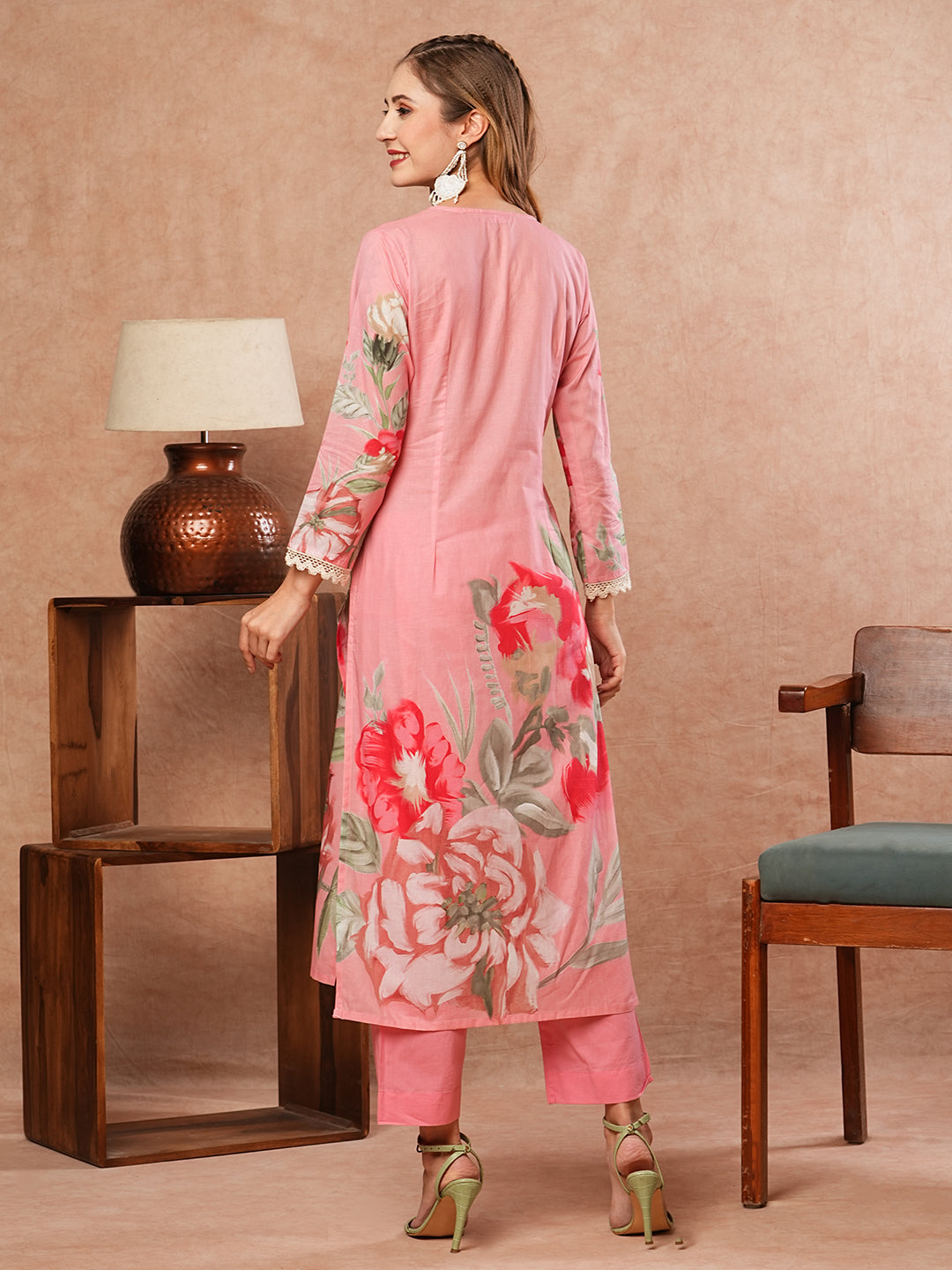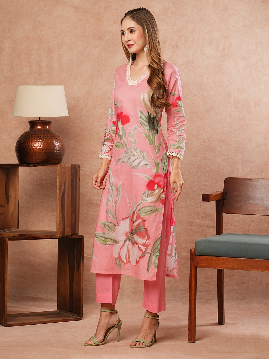 Floral Printed Crochet Lace Embellished Kurta with Pants - Pink