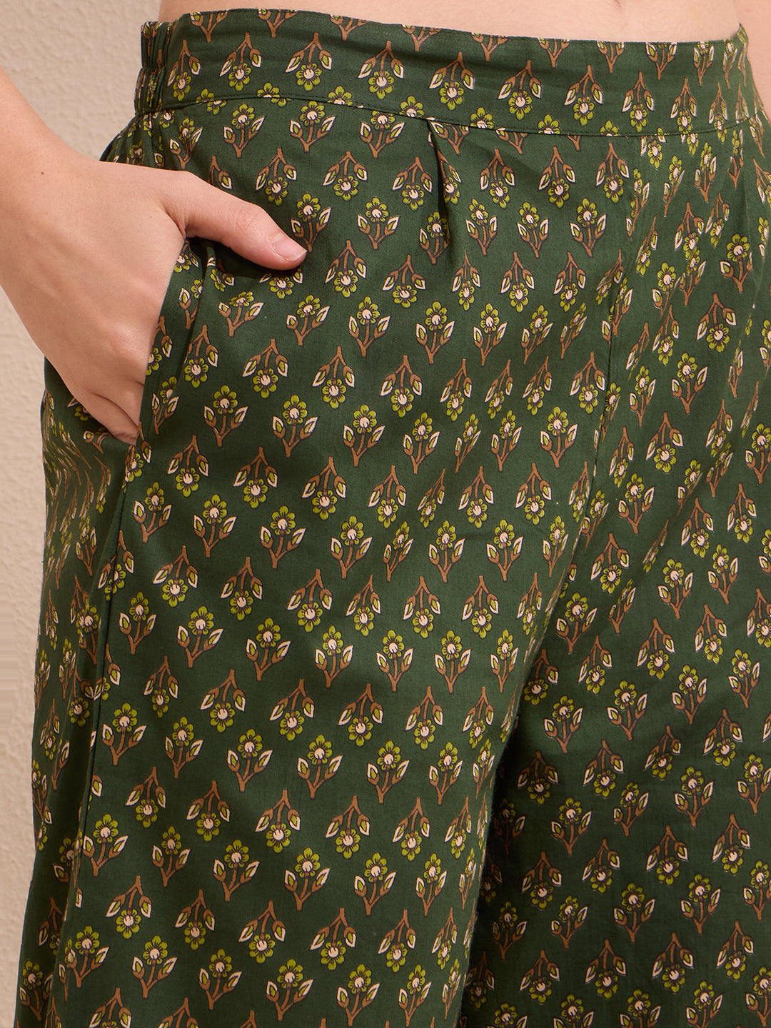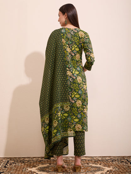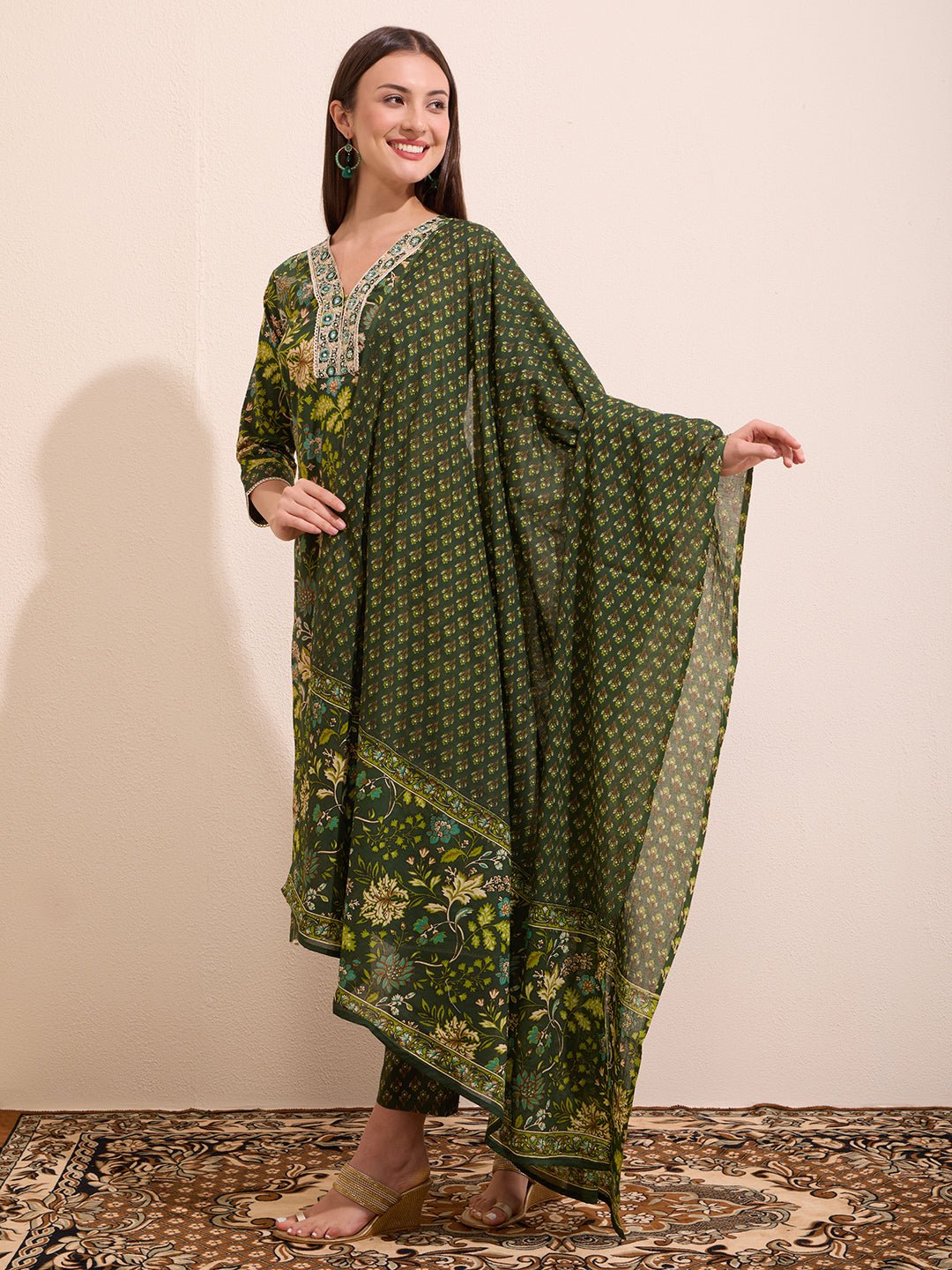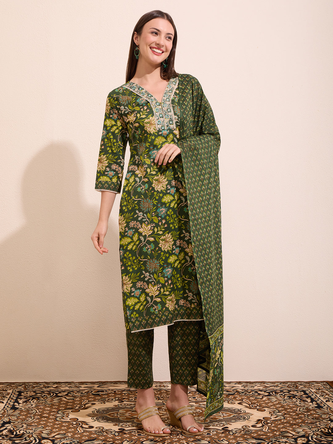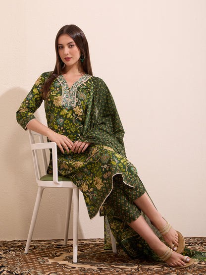 Floral Printed Embellished Straight Cut Kurta with Pant & Dupatta - Green