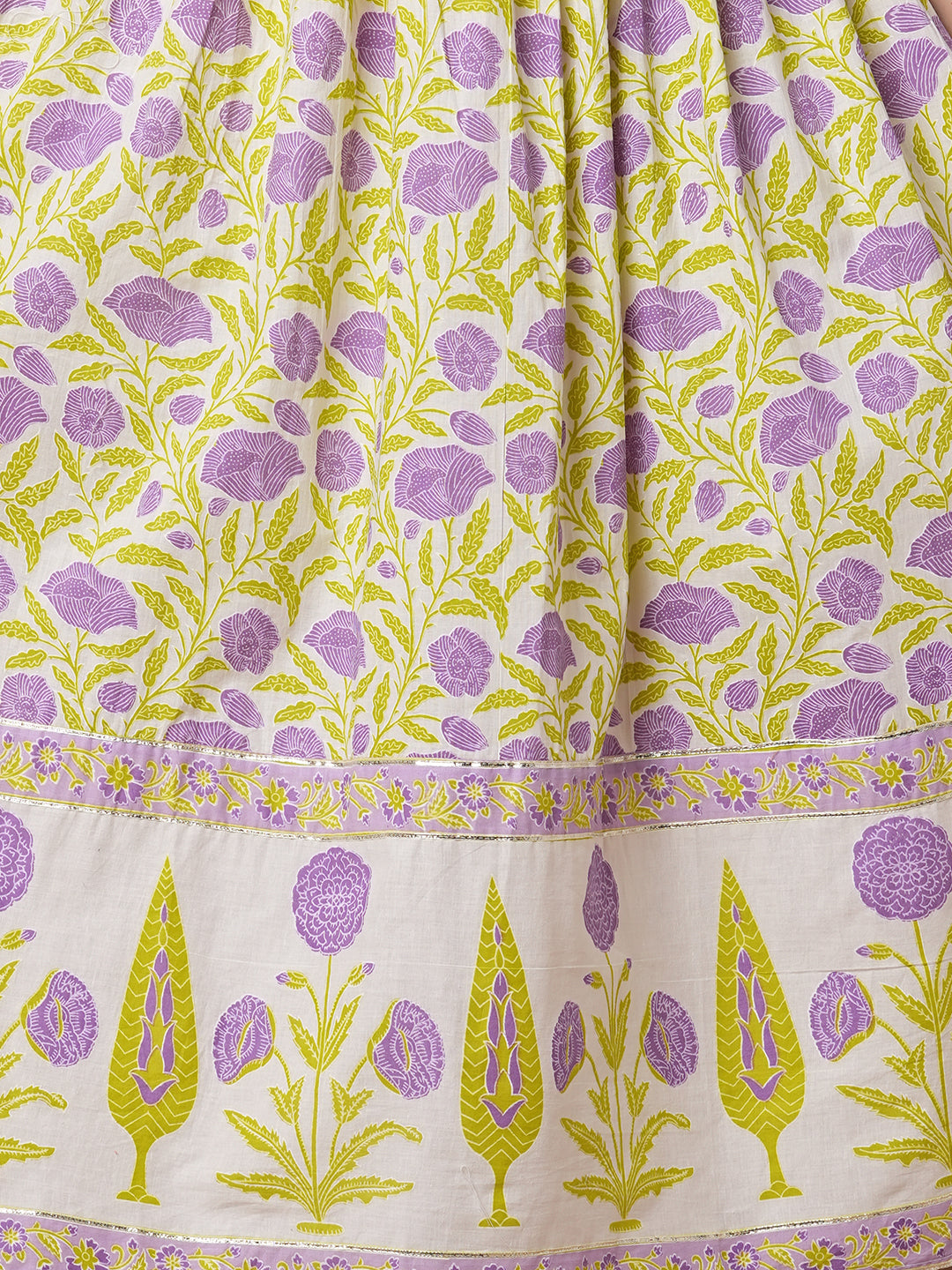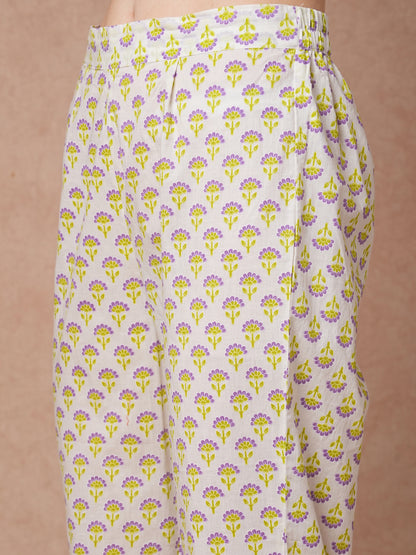 Step into effortless grace with this Anarkali flared kurta set in soft cotton. Featuring delicate floral prints, hand-done anchor thread embroidery on the neckline, and charming side tie-ups, the kurta is finished with elegant crochet lace at the hem. Paired with a printed cotton pant and a breezy pure cotton printed dupatta, this set blends traditional craftsmanship with modern comfort—perfect for everyday elegance or light festive moments.