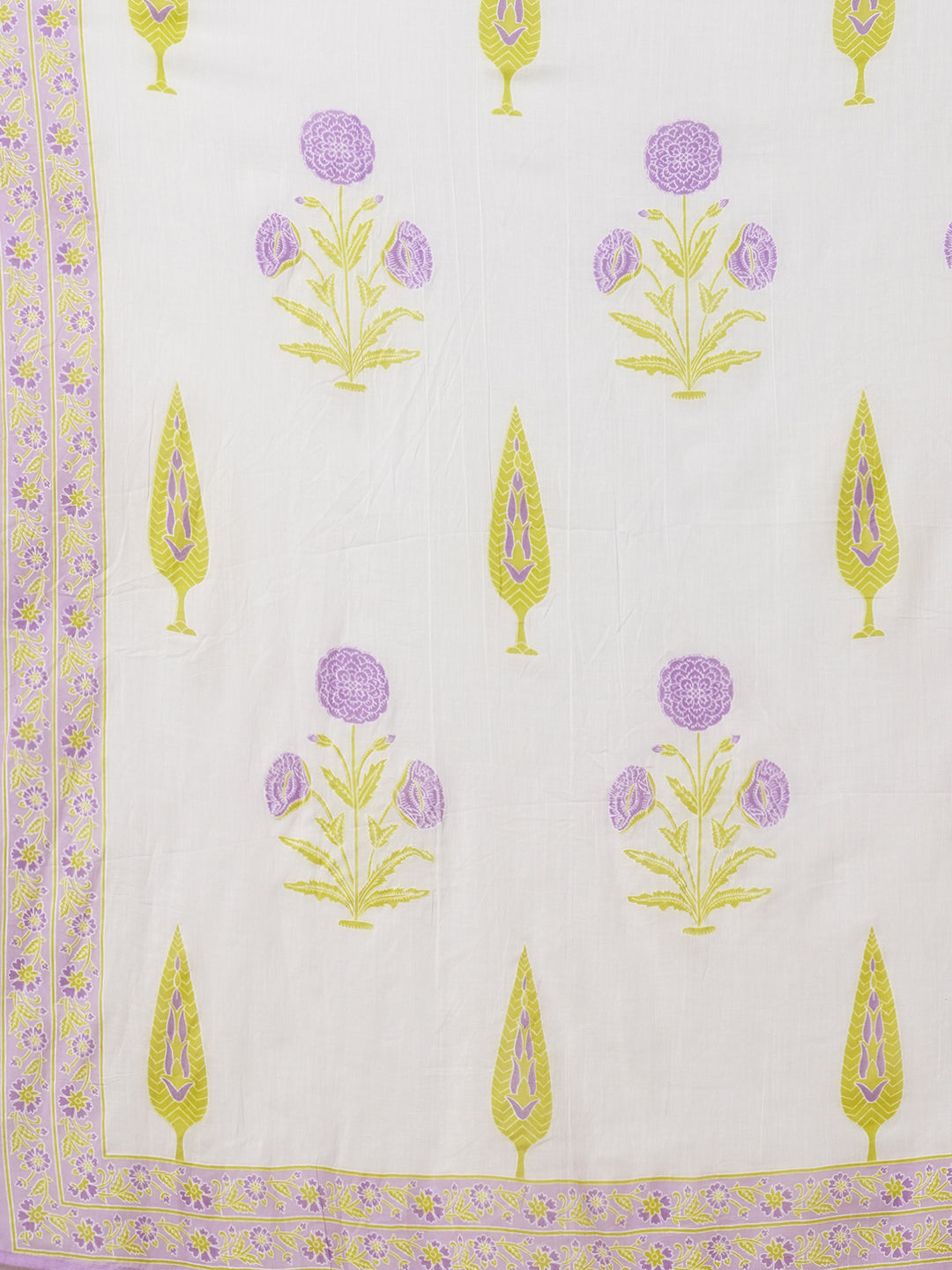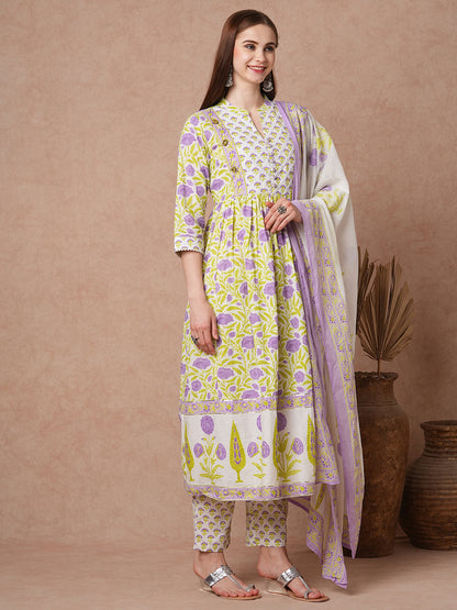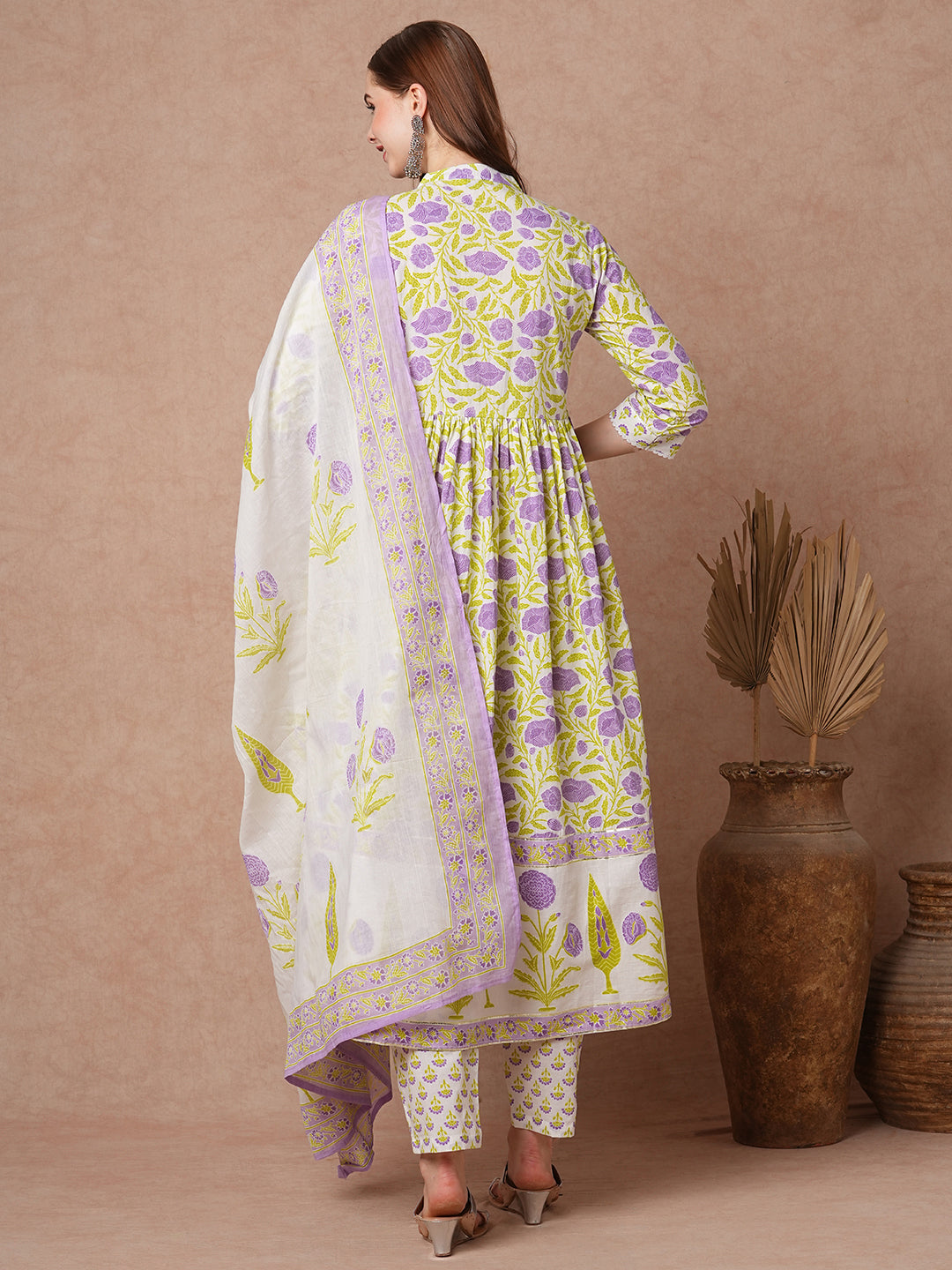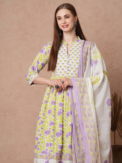 Floral Printed & Embroidered Anarkali Flared Kurta with Pant & Dupatta - White