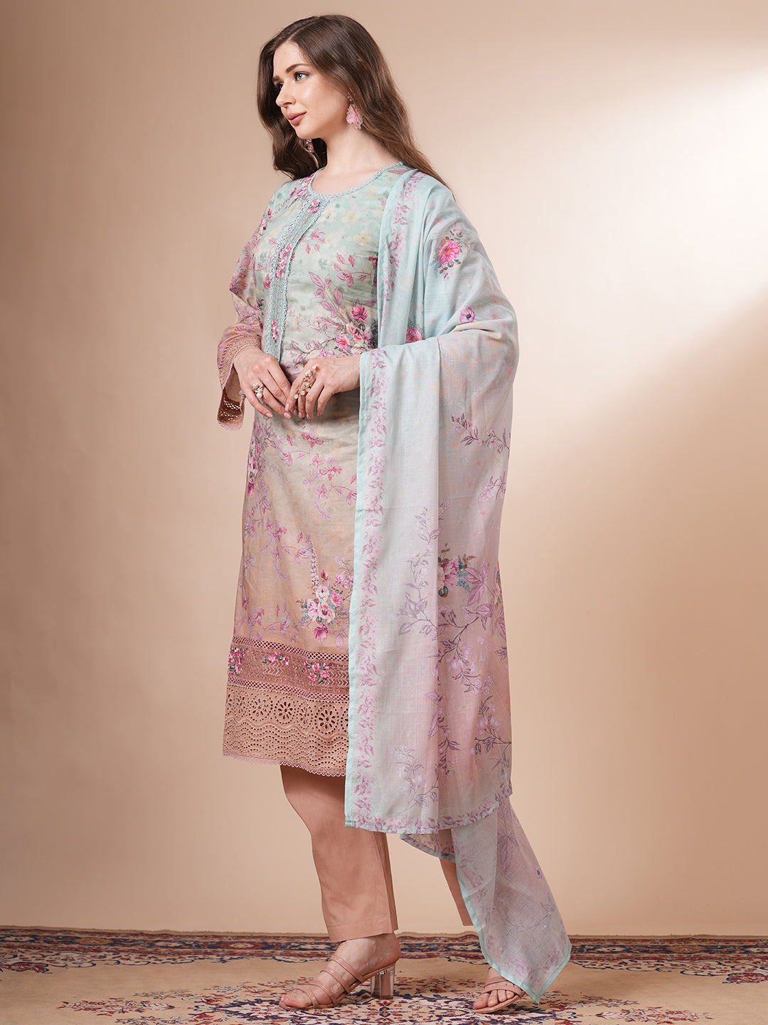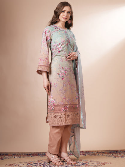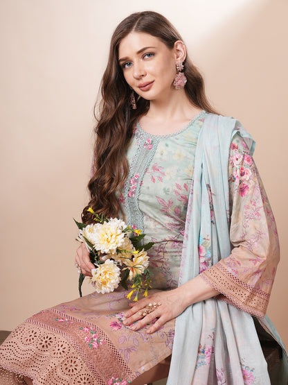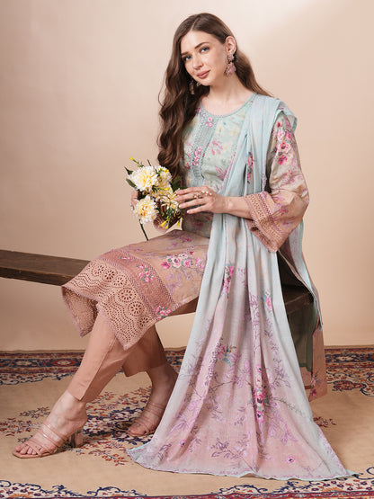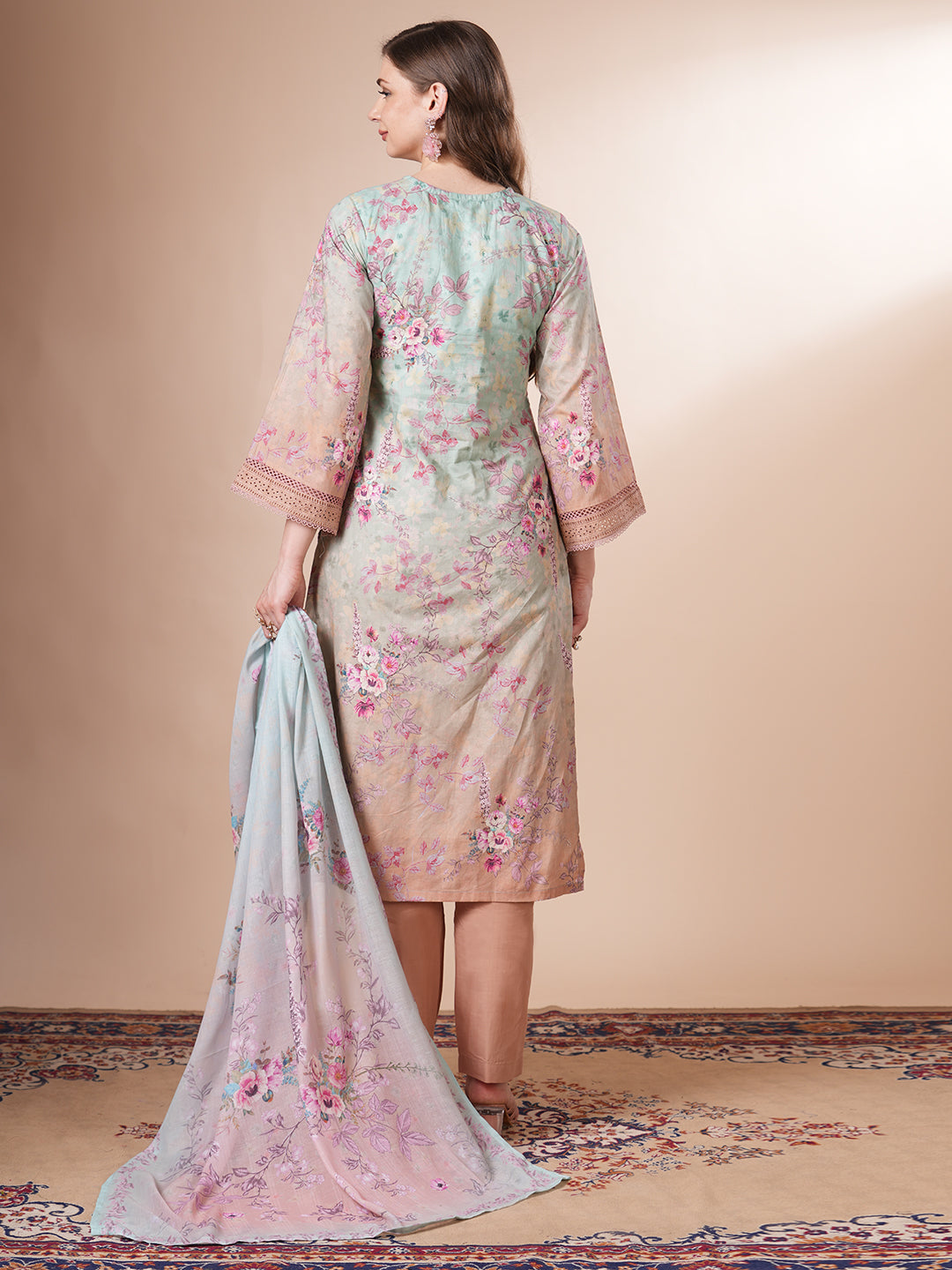 Floral Printed Embroidered Straight Fit Kurta with Pant and Dupatta - Mutli