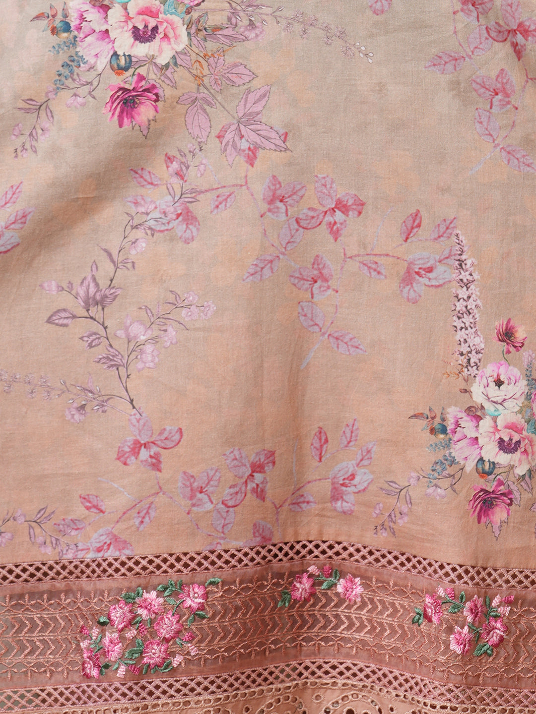Step into a world of vibrant elegance with this Multi Floral Printed Embroidered Straight Fit Kurta set. Crafted from soft cotton, the kurta features delicate Schiffli embroidery on the front, adding a hint of handcrafted charm. A classic round neckline and flared sleeves enhance the feminine silhouette. Intricate crochet lace detailing lends an artisanal finish. It’s paired with a solid pant for balance and a beautifully printed dupatta for a splash of color. Perfect for daytime festivities or elegant casual outings.
