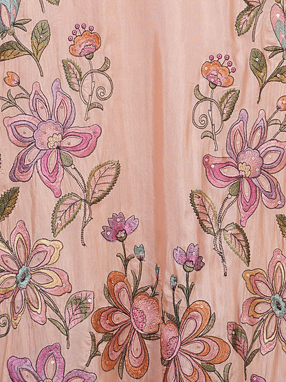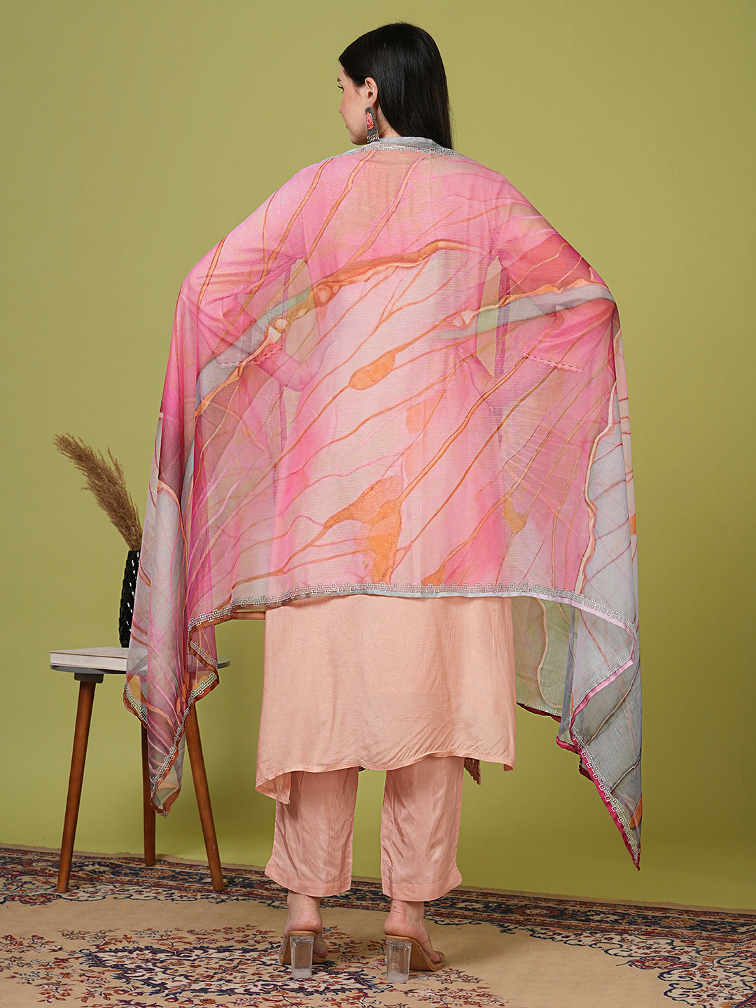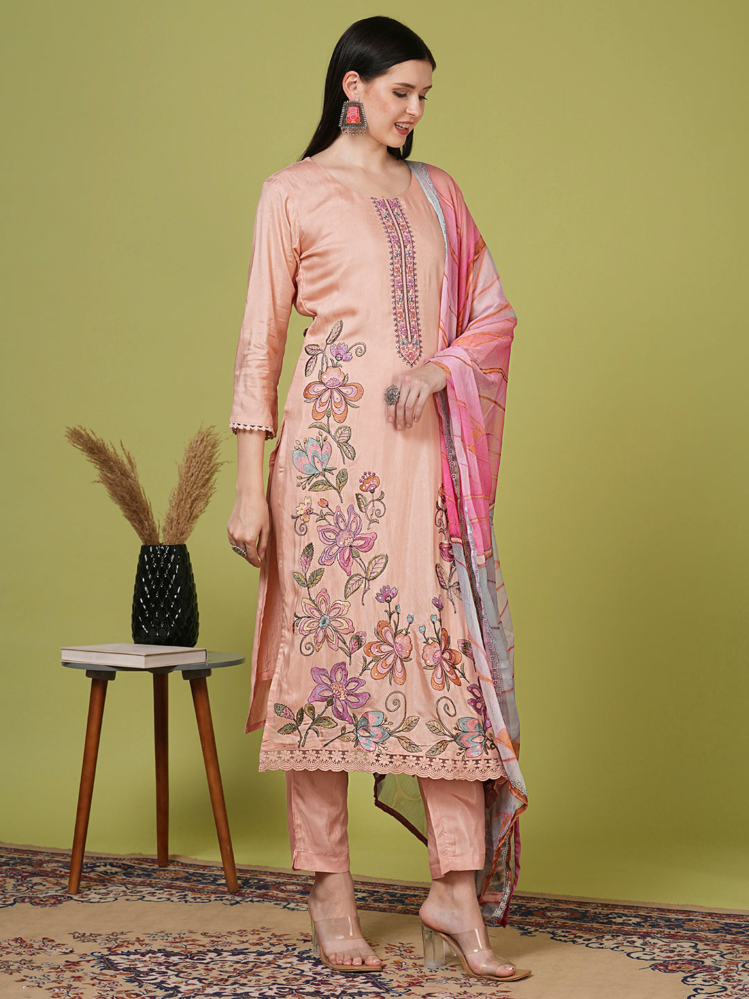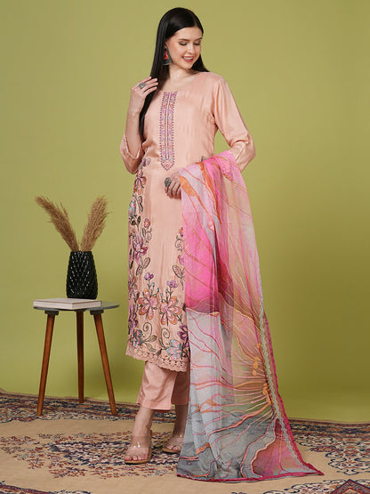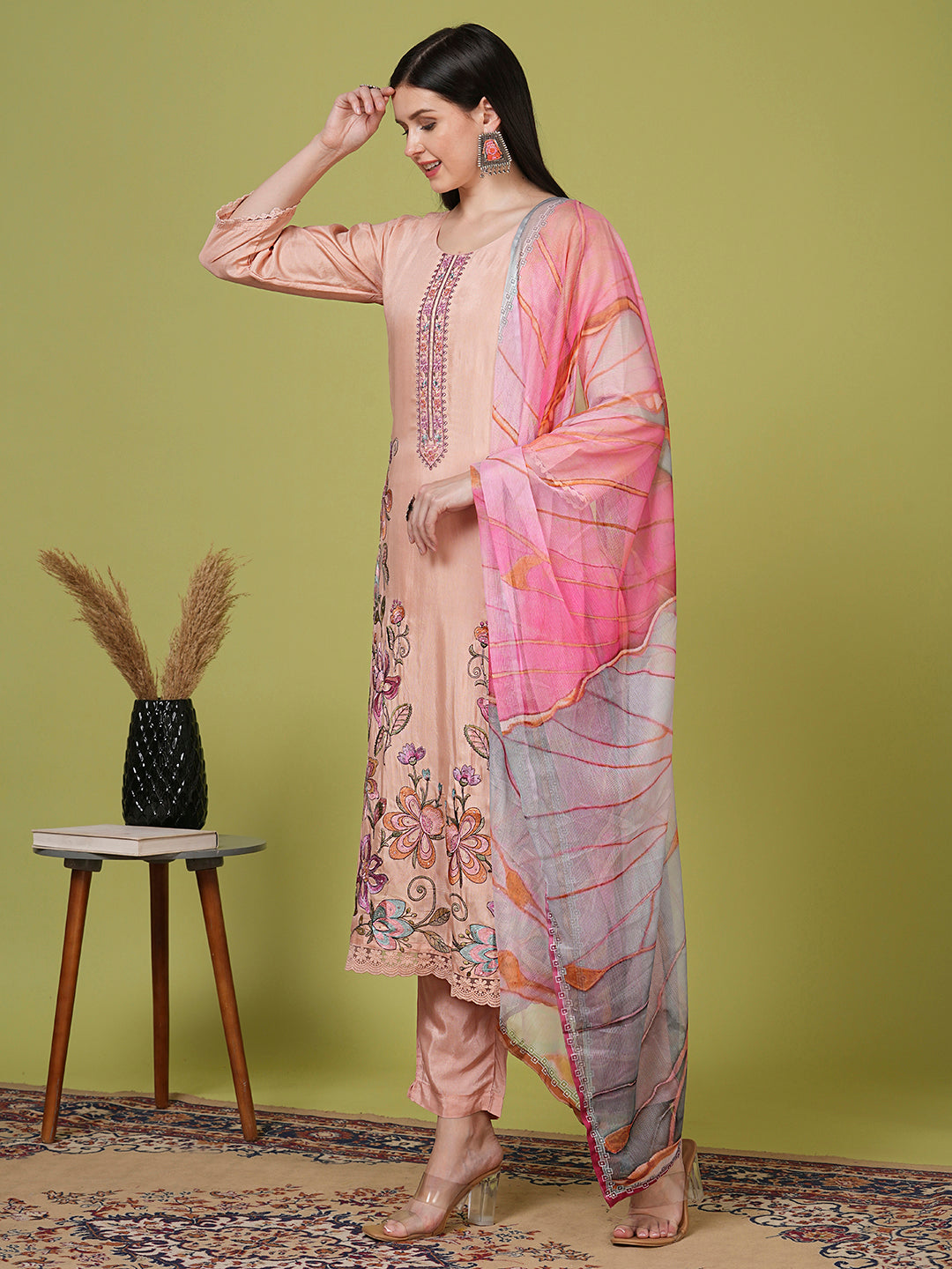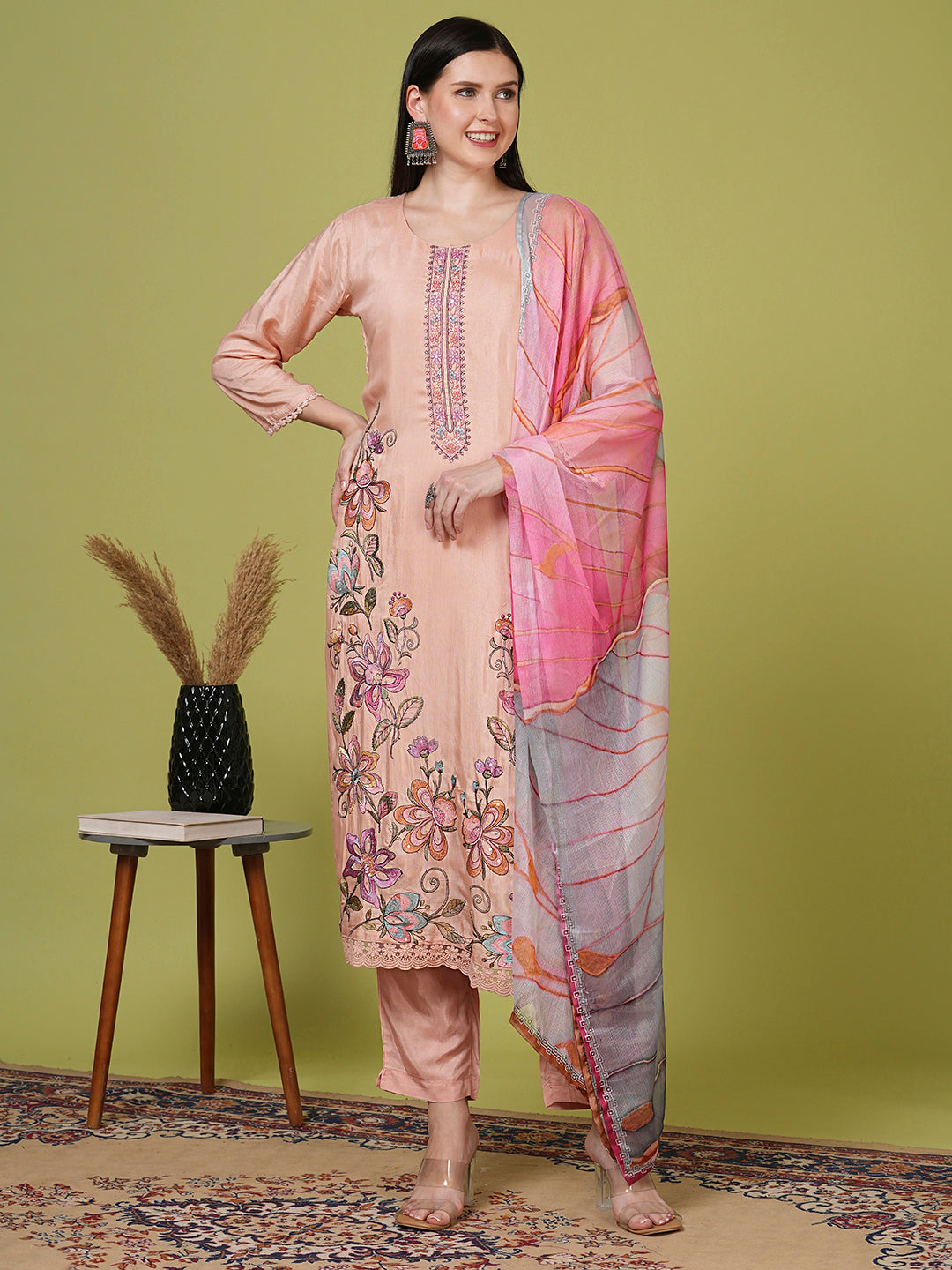 Floral Printed & Embroidered Straight Fit Kurta with Pant and Dupatta - Peach