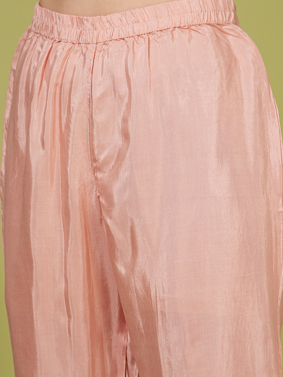 Elevate your festive wardrobe with this exquisite Peach Floral Printed & Embroidered Straight Fit Kurta Set. Crafted from luxurious muslin silk, the kurta features a flattering straight silhouette, a round neckline, and an intricately embroidered placket that adds a touch of elegance. The ensemble is completed with solid straight pants and a printed chiffon dupatta, offering a harmonious blend of comfort and style. Perfect for celebrations, this set ensures you make a graceful statement at any occasion.