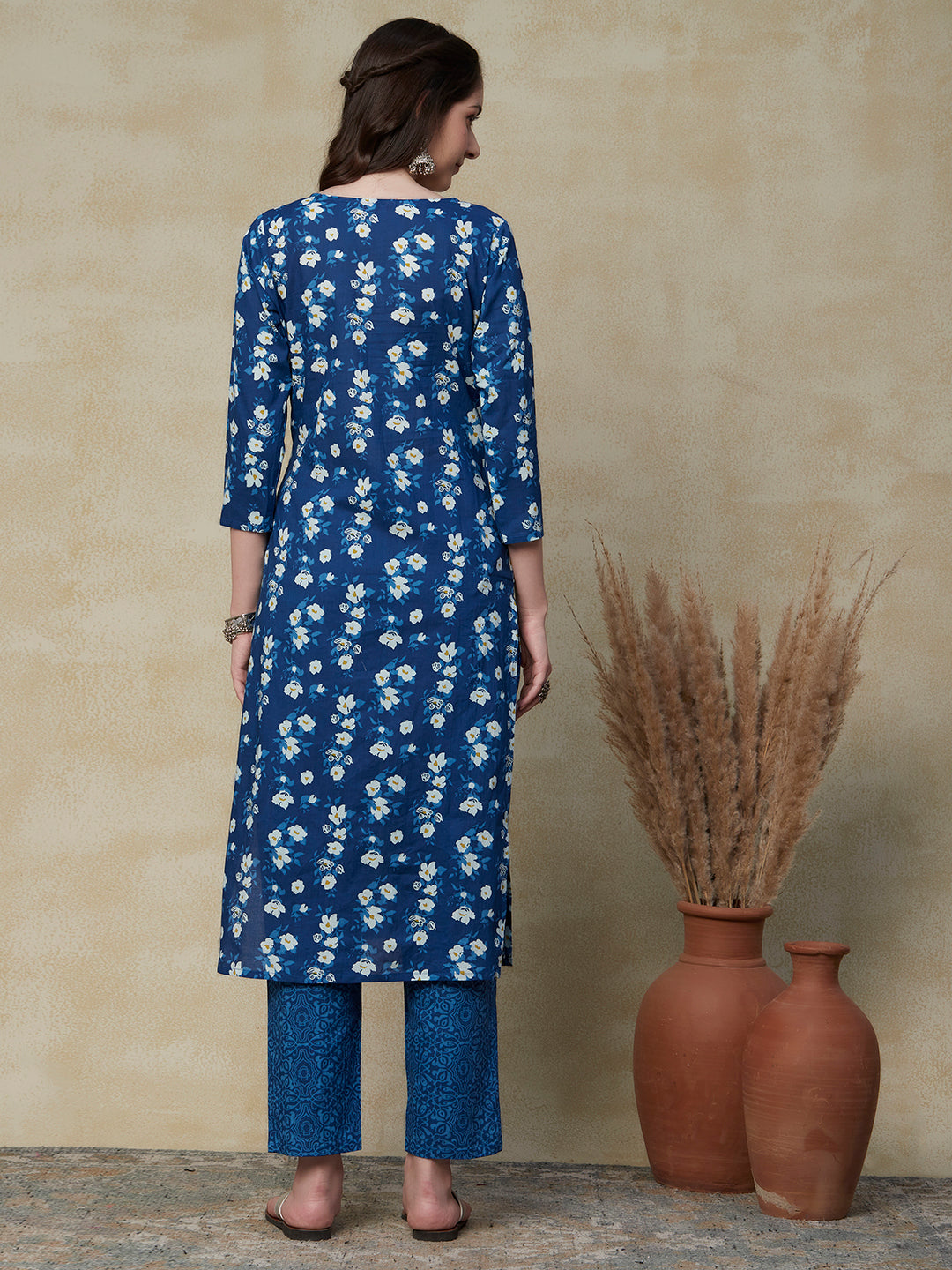 Floral Printed & Embroidered Straight Fit Kurta with Pant - Blue