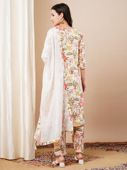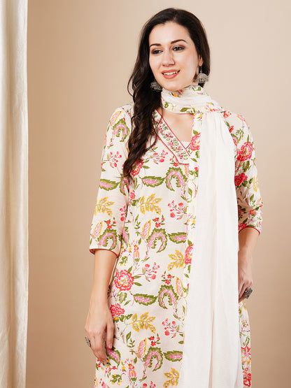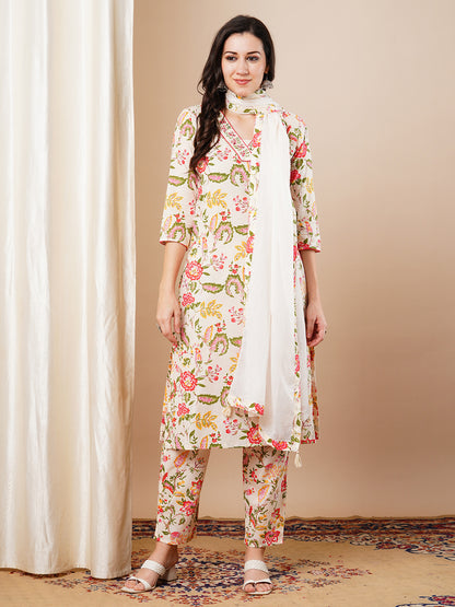 Floral Printed Embroidered Straight Fit Kurta with Pant & Dupatta - Cream