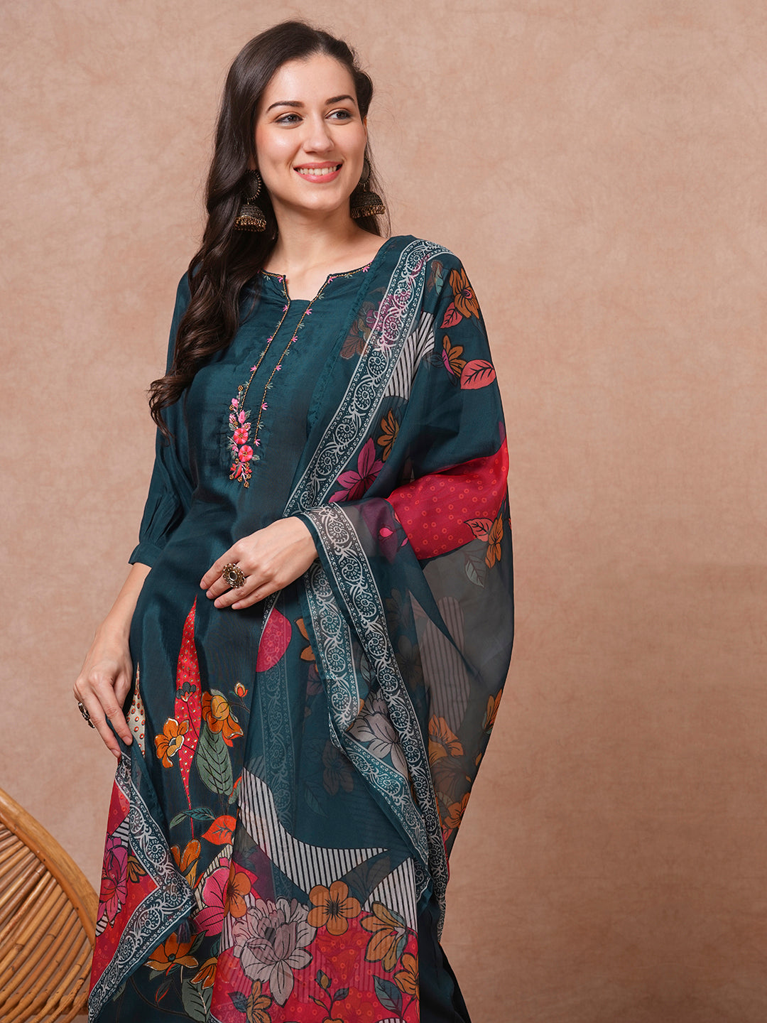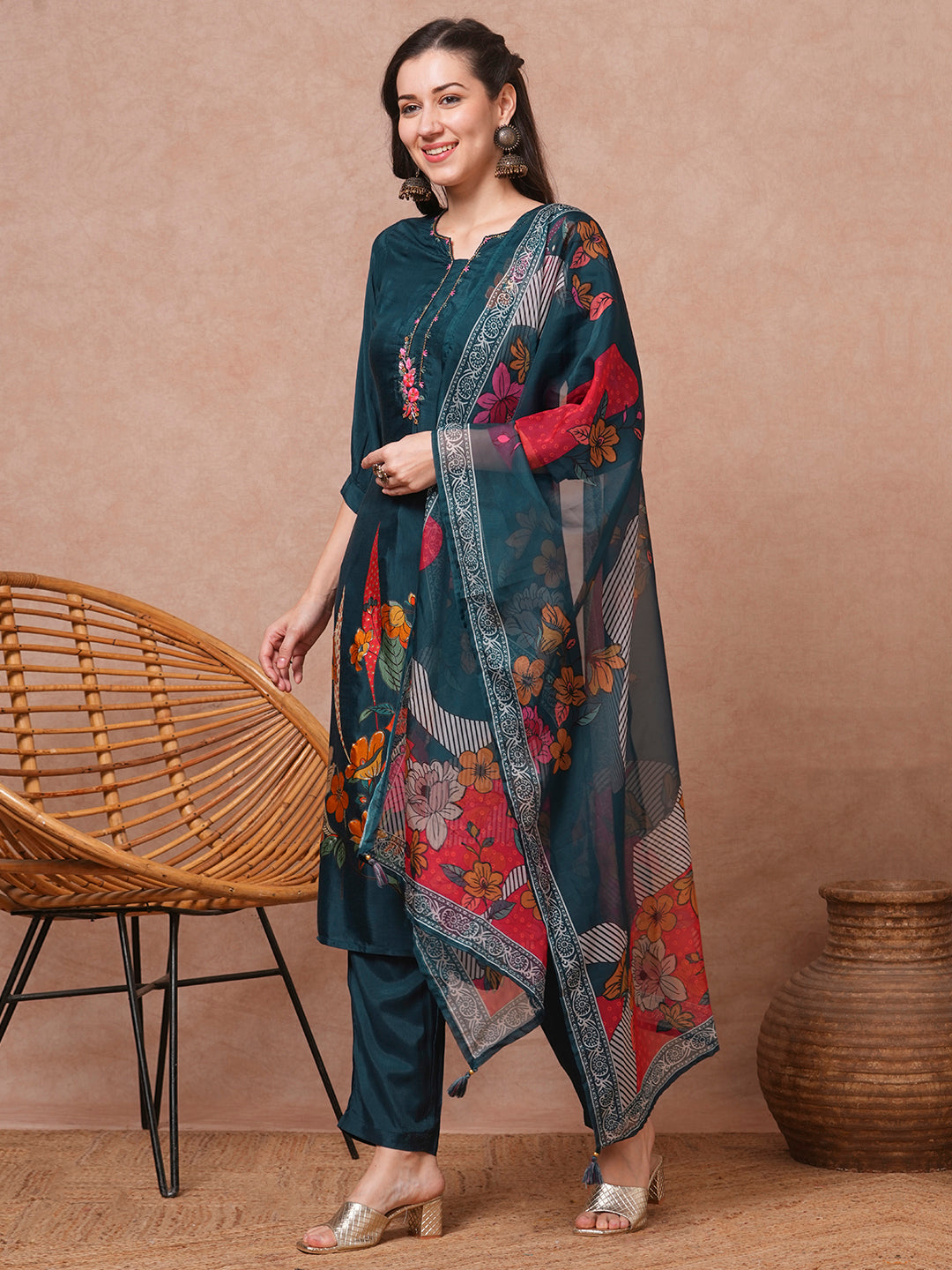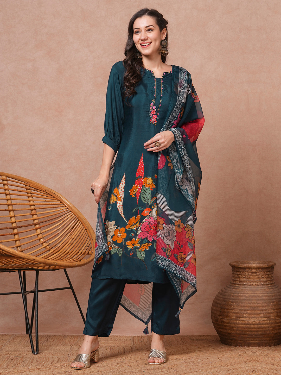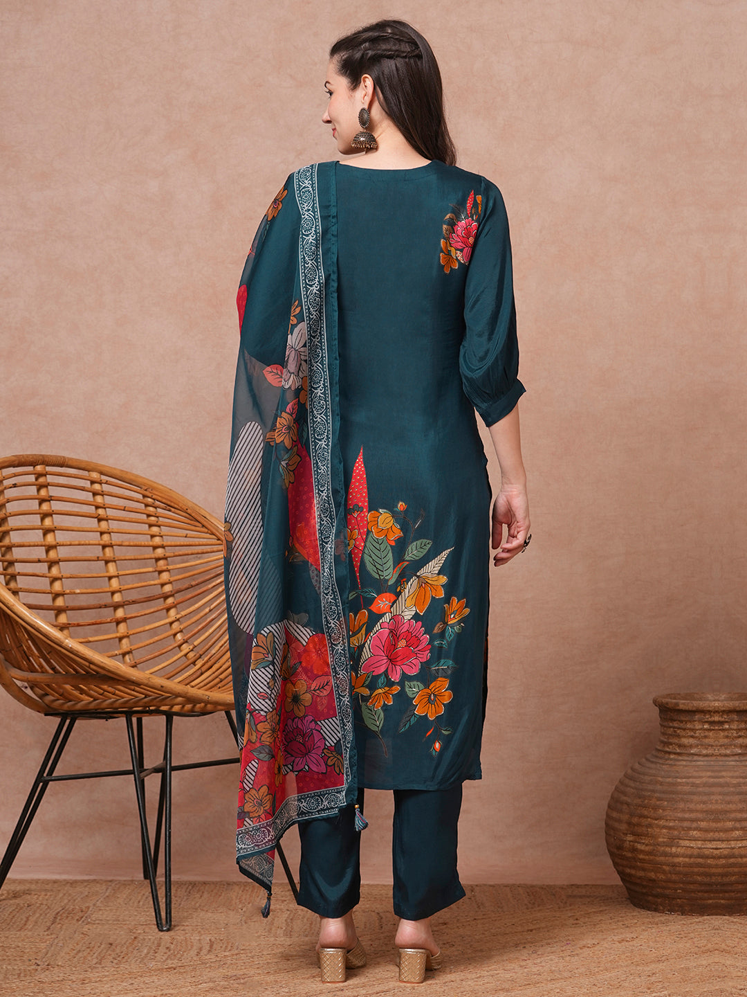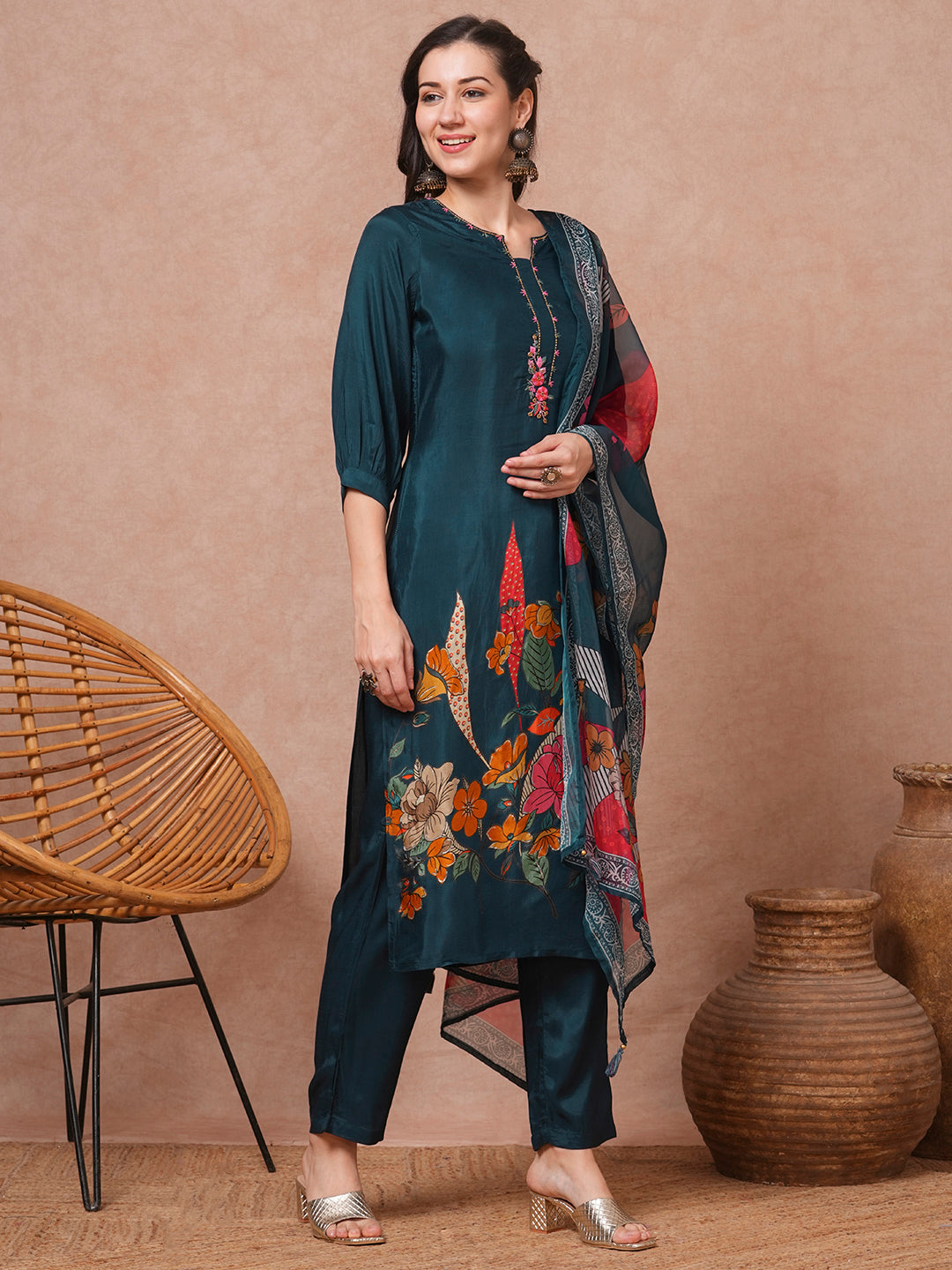 Floral Printed & Embroidered Straight Fit Kurta with Pant & Dupatta - Green