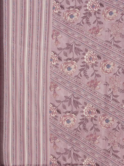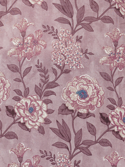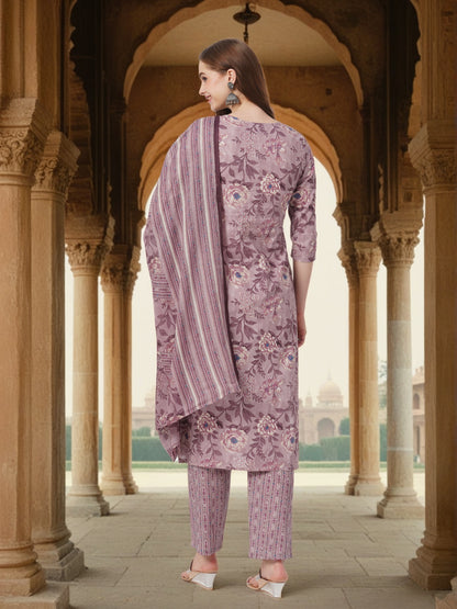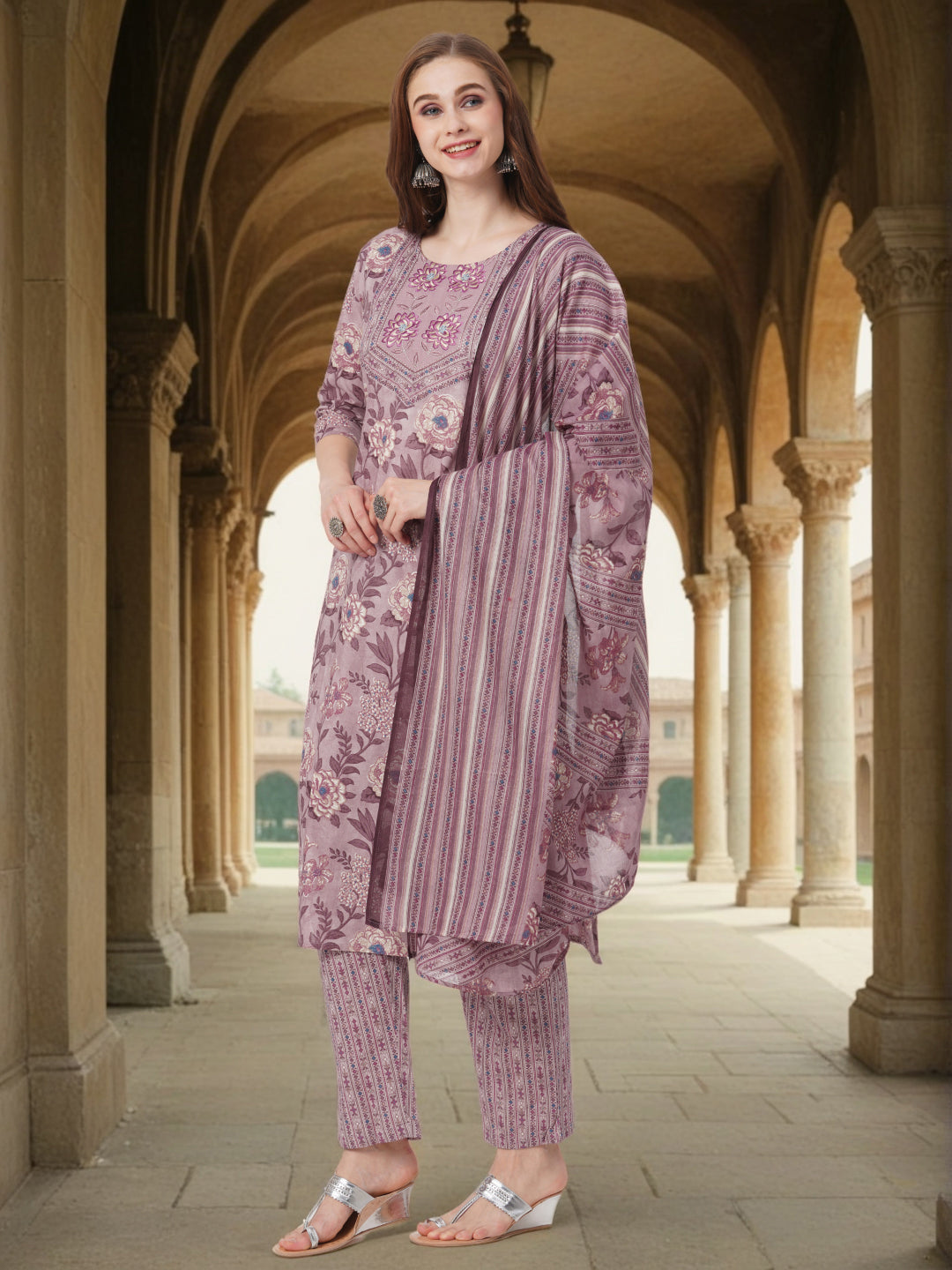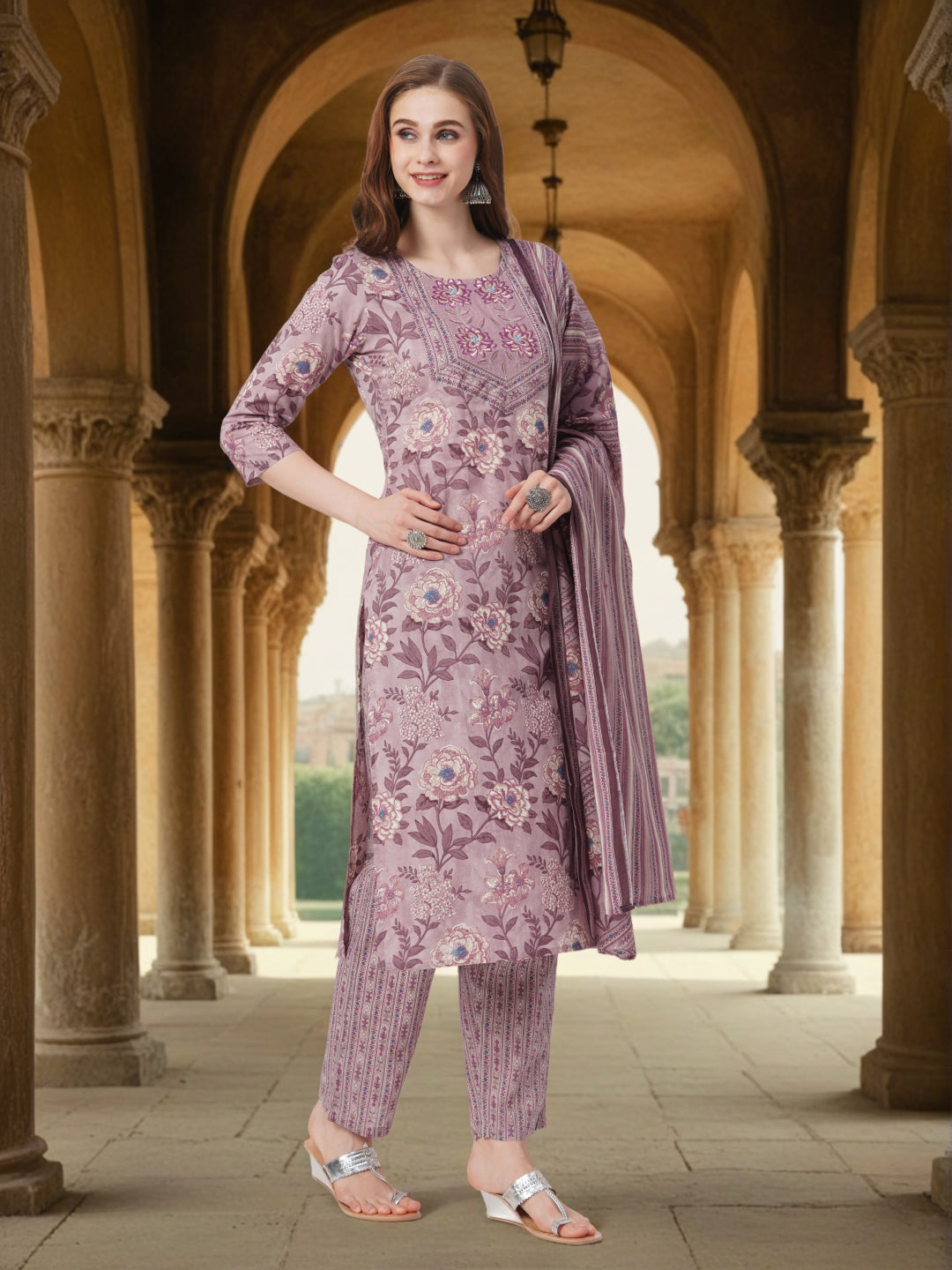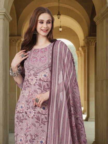 Floral Printed & Embroidered Straight Fit Kurta with Pant & Dupatta - Mauve