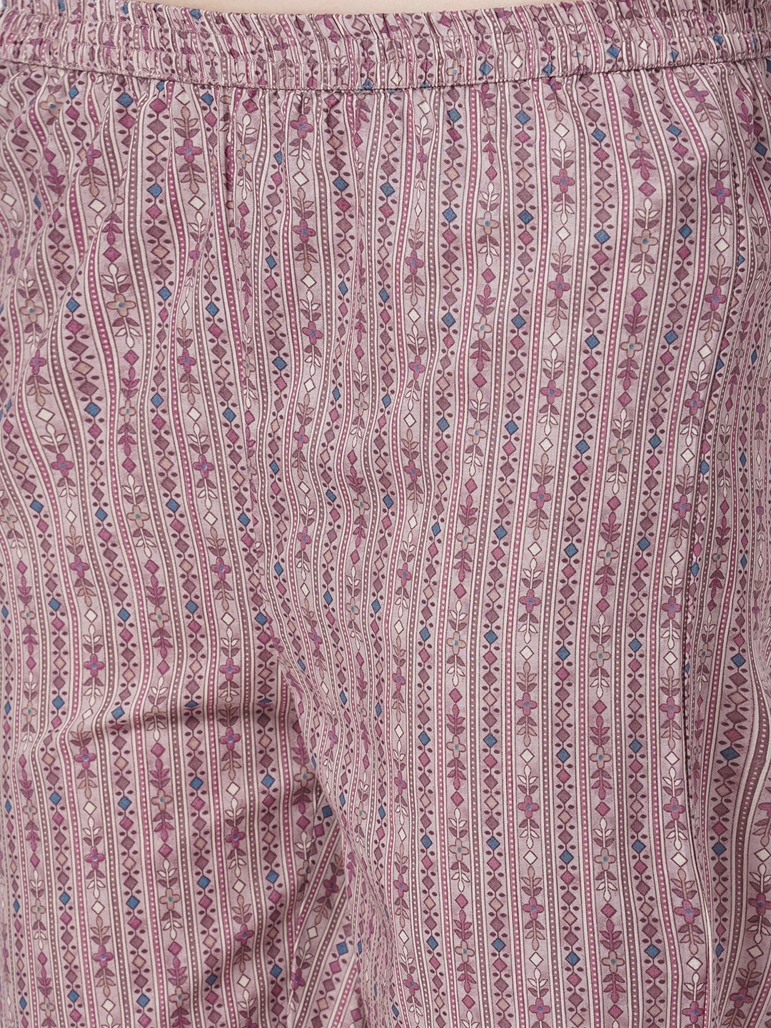 Embrace effortless elegance with the Floral Printed & Embroidered Straight Fit Kurta Set in a graceful mauve hue. Made from soft cotton, the kurta features a beautifully crafted resham and zari embroidered yoke that adds a hint of opulence. Paired with a chic striped pant and a pure cotton dupatta, this ensemble blends tradition with modern charm for a refined ethnic look