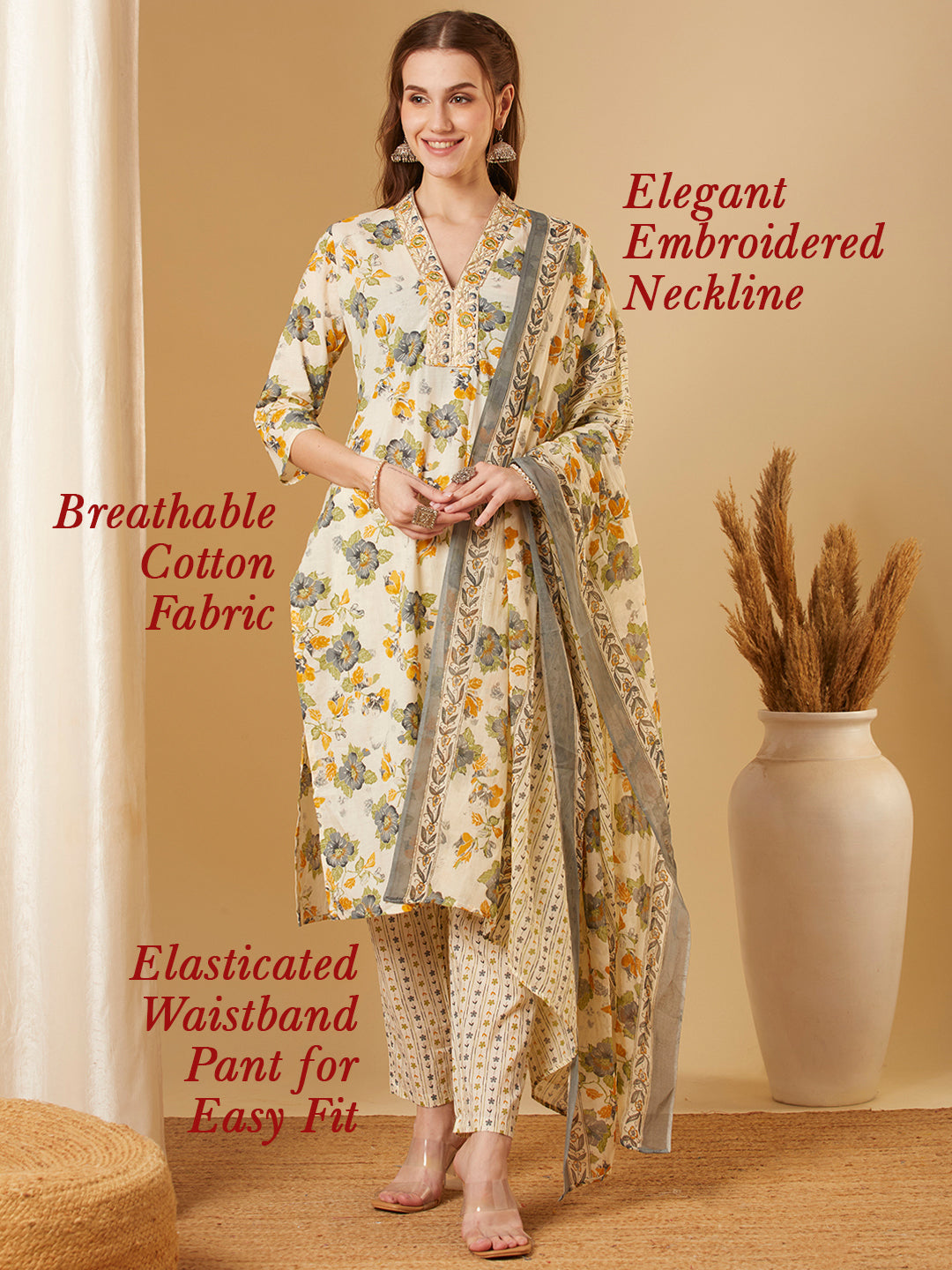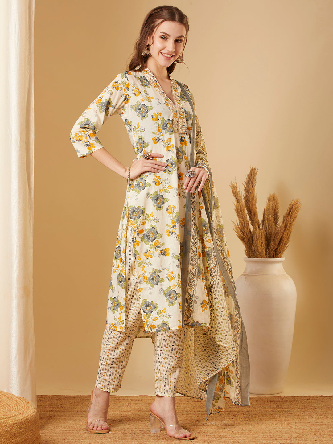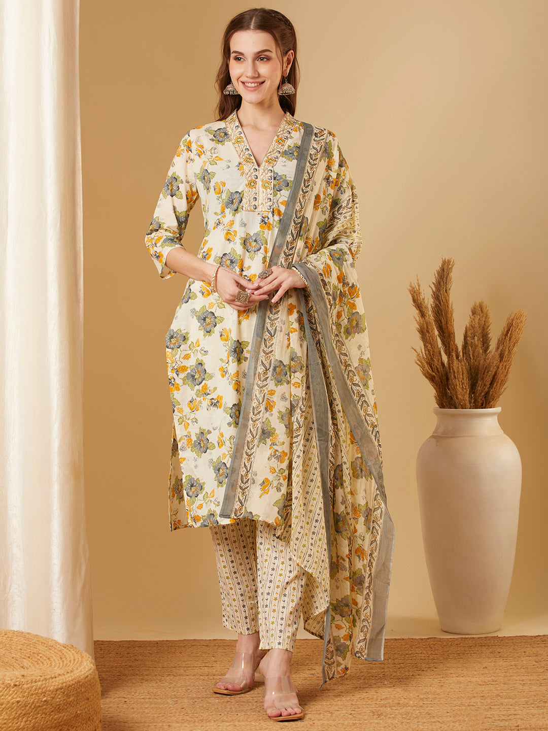 Floral Printed & Embroidered Straight Fit Kurta with Pant & Dupatta - Off White